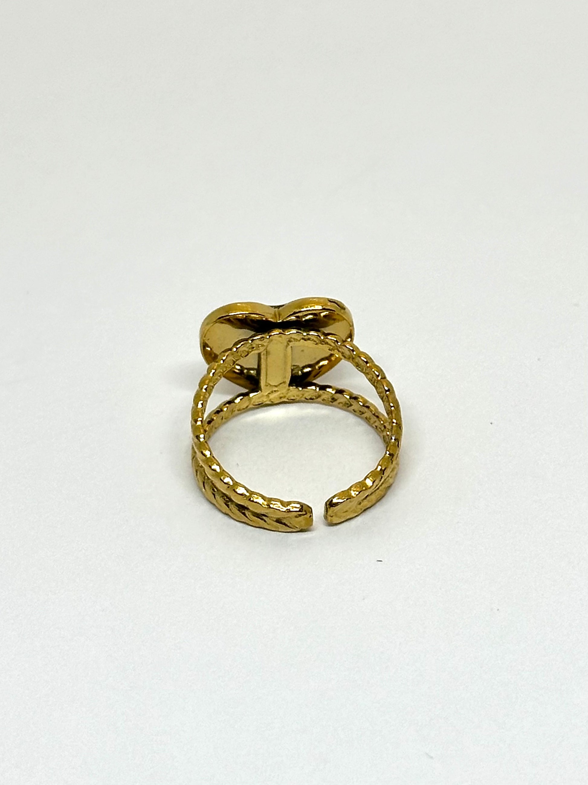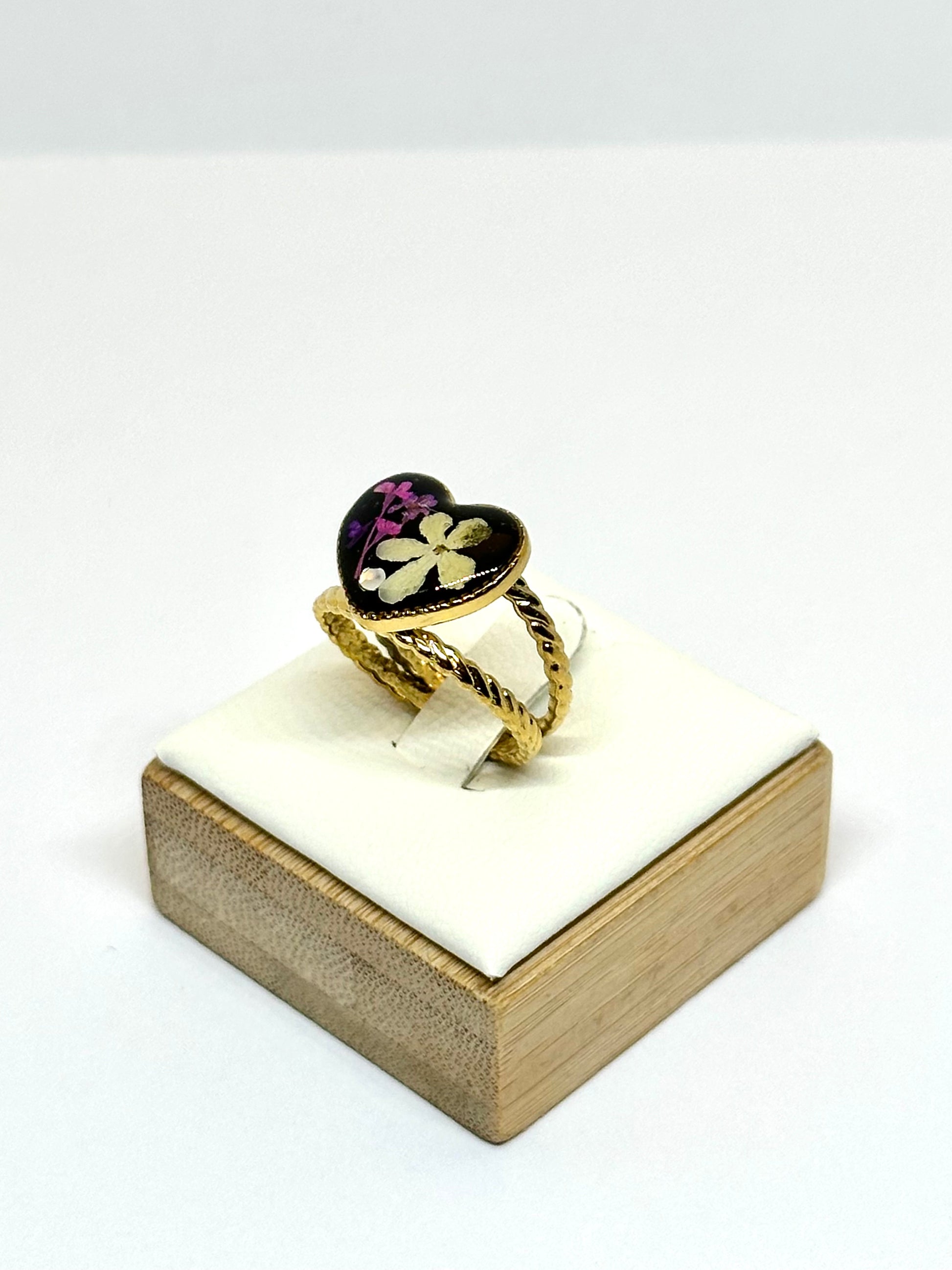 Justerbar guldpläterad ring med hjärtformad design. Mot svart bakgrund kombineras en pressad vitklöverblomma med en bukett av lila morotsblommor, vilket skapar en elegant och naturlig kontrast.