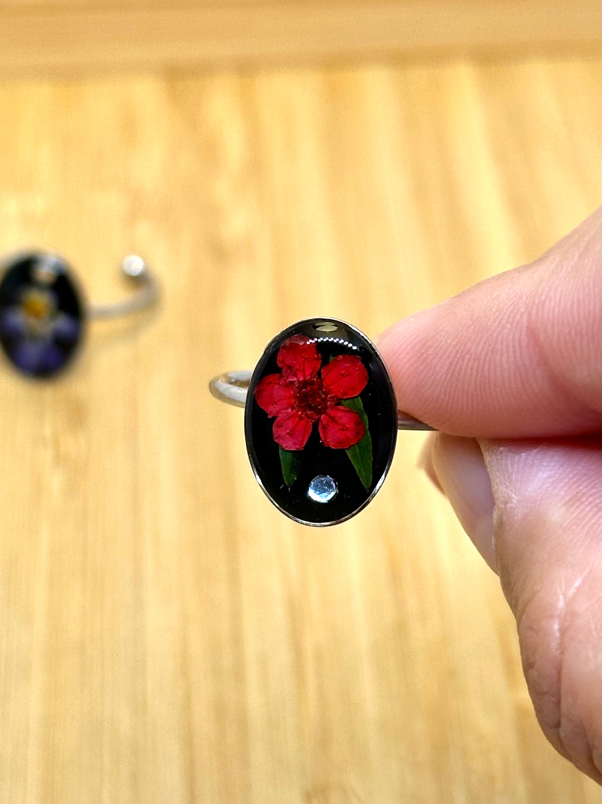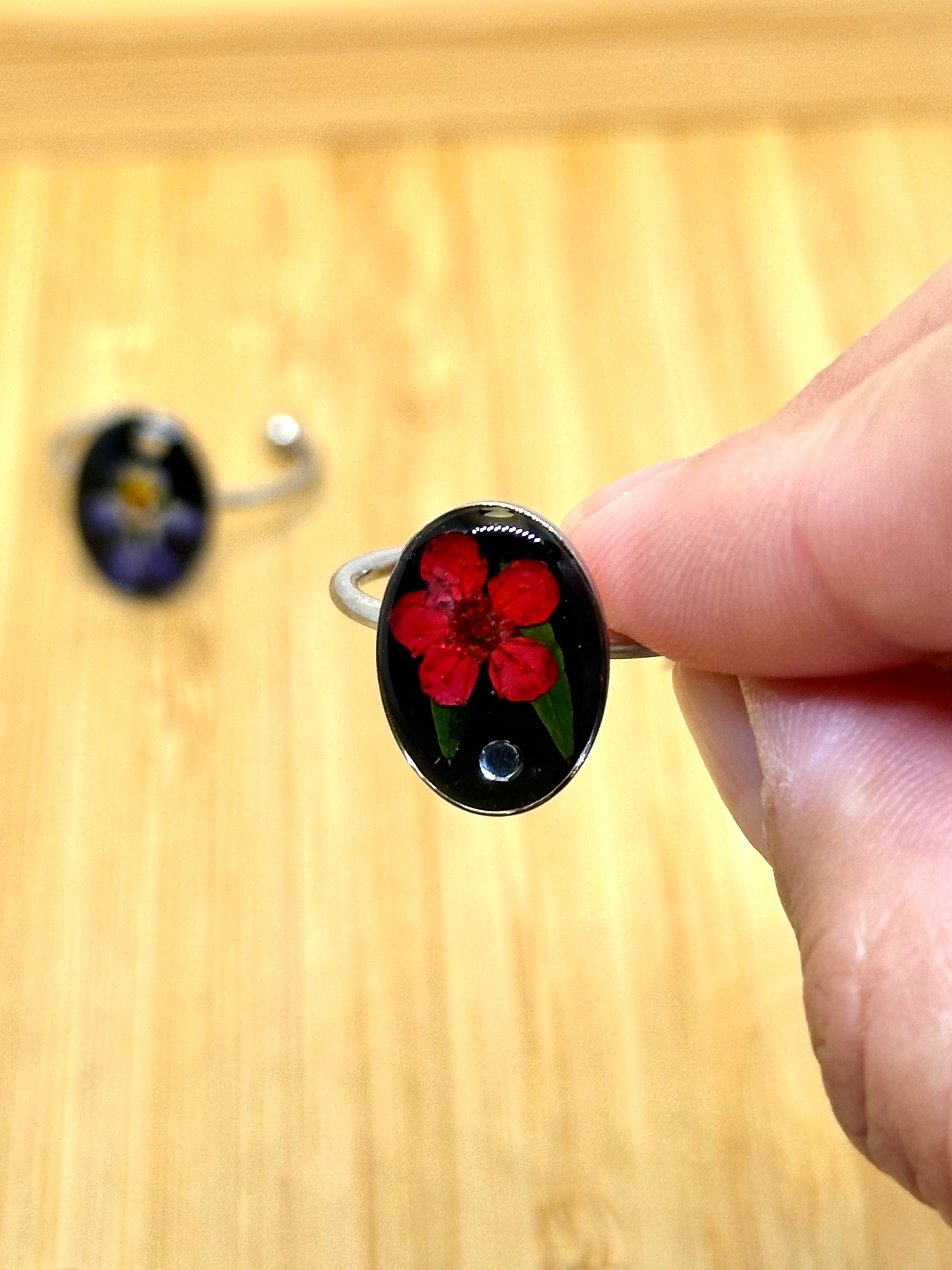 Justerbar silverpläterad ring med oval design. I mitten avbildas en pressad och handmålad röd veronicablomma mot en svart bakgrund, tillsammans med små ormbunksblad och en delikat glitterdetalj längst ner.