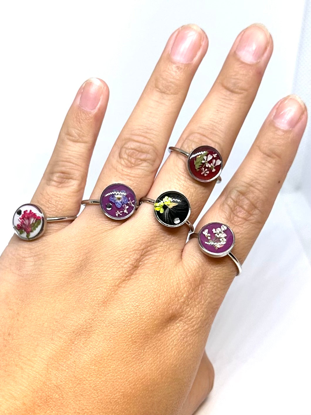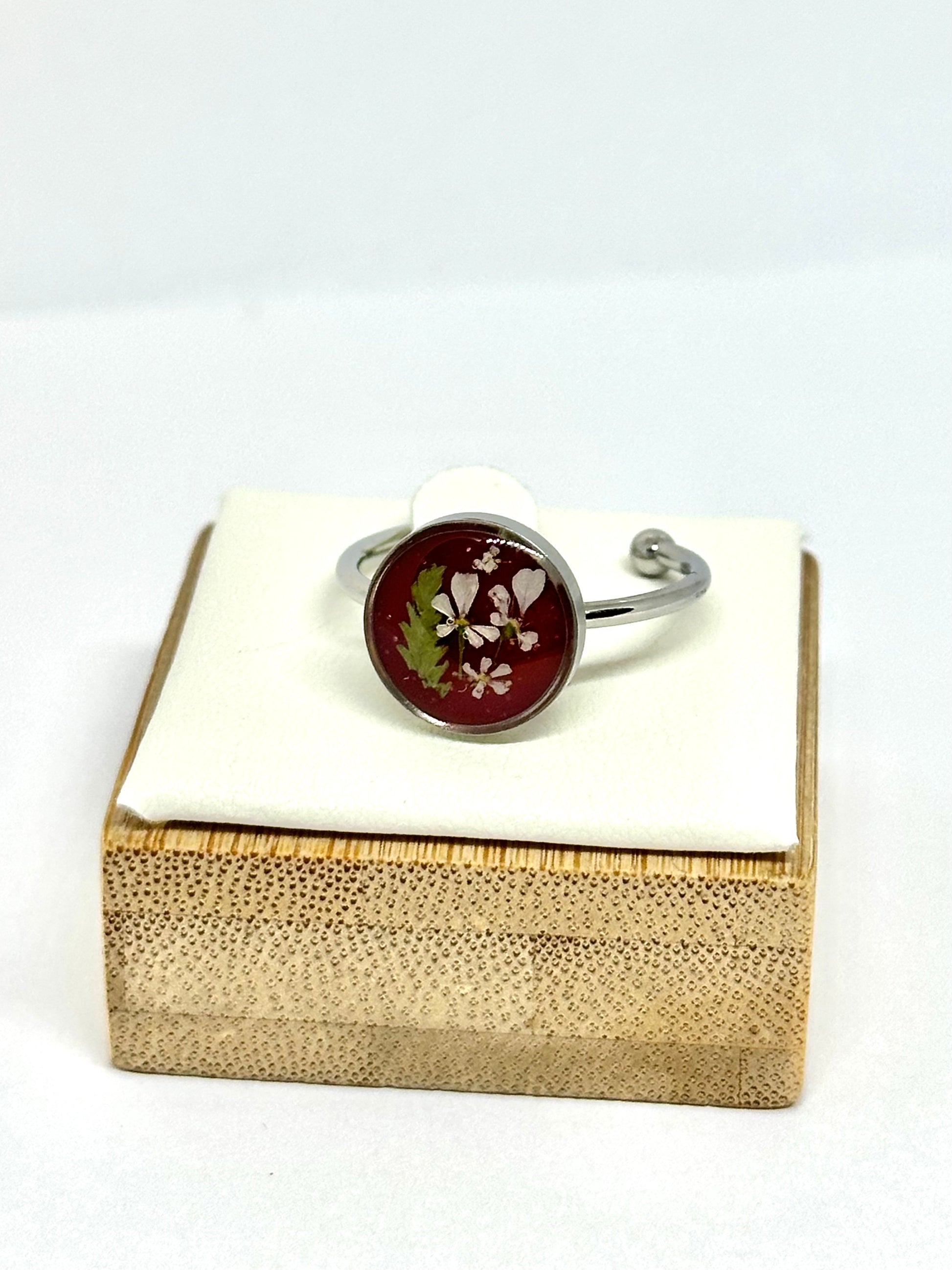 Justerbar silverpläterad ring med rund design. På en vinröd bakgrund kombineras små pressade körvelblommor med ett delikat ormbunkefragment, vilket skapar en naturlig och balanserad komposition.
