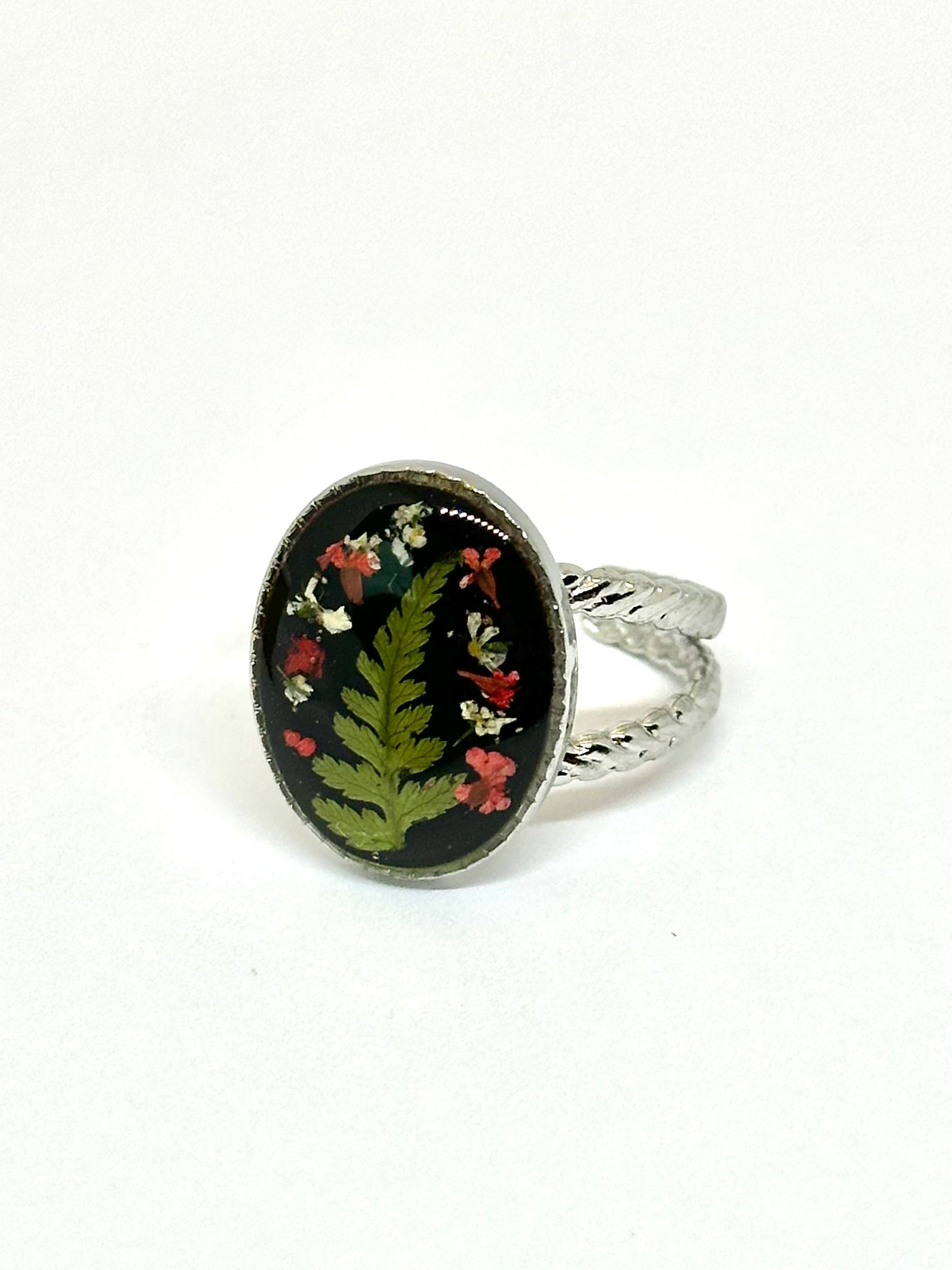 Justerbar ring i silverfärgat rostfritt stål med oval bas. Inuti pryds den av ett ormbunksblad med små vita och röda kungliga blommor mot svart bakgrund.