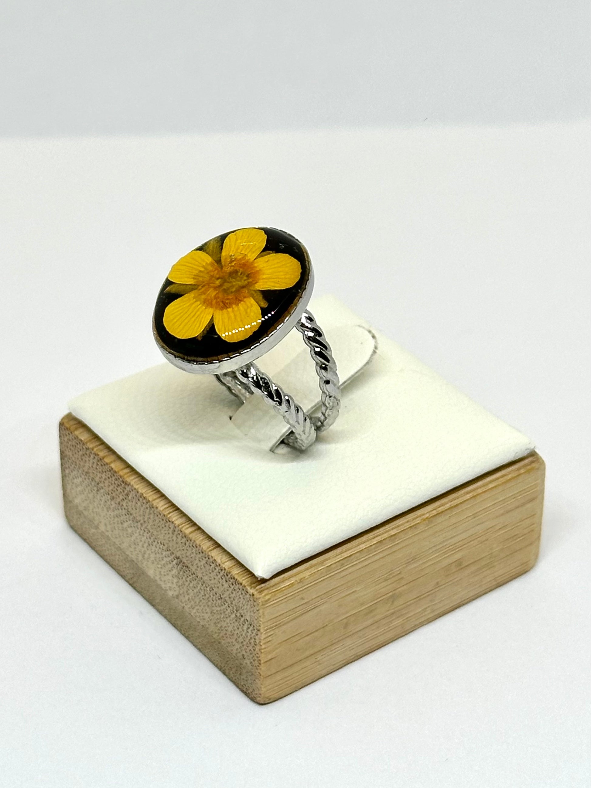 Justerbar ring i silverfärgat rostfritt stål med oval bas. En riktig smörblomma är inkapslad i mitten mot en svart bakgrund.