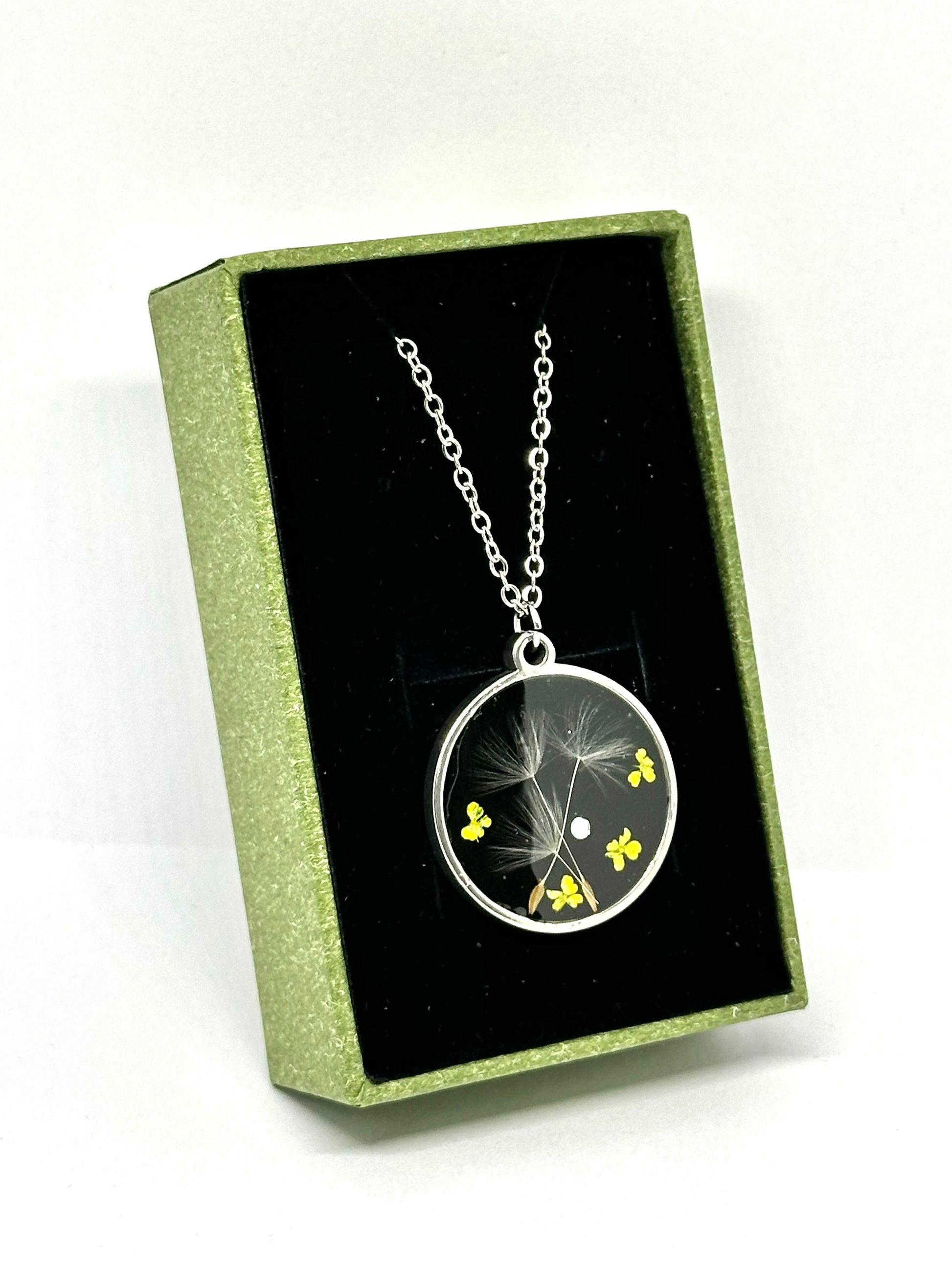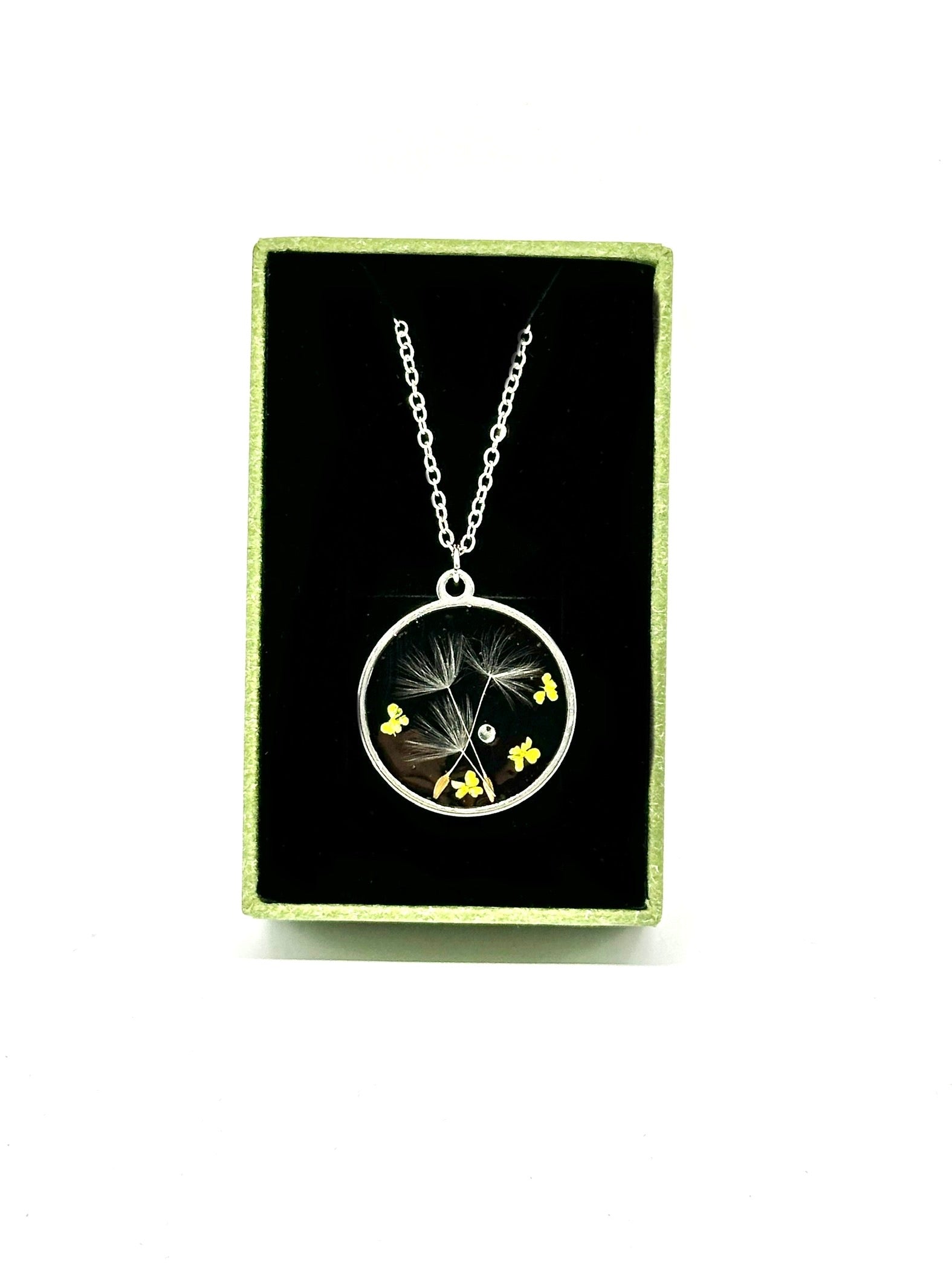 Försilvrat halsband med ett runt hänge och svart bakgrund. Inuti skapar fina maskrosfrön och små gula blommor en eterisk och elegant komposition som framkallar lätthet och frihet. Kedjan är tunn och justerbar.