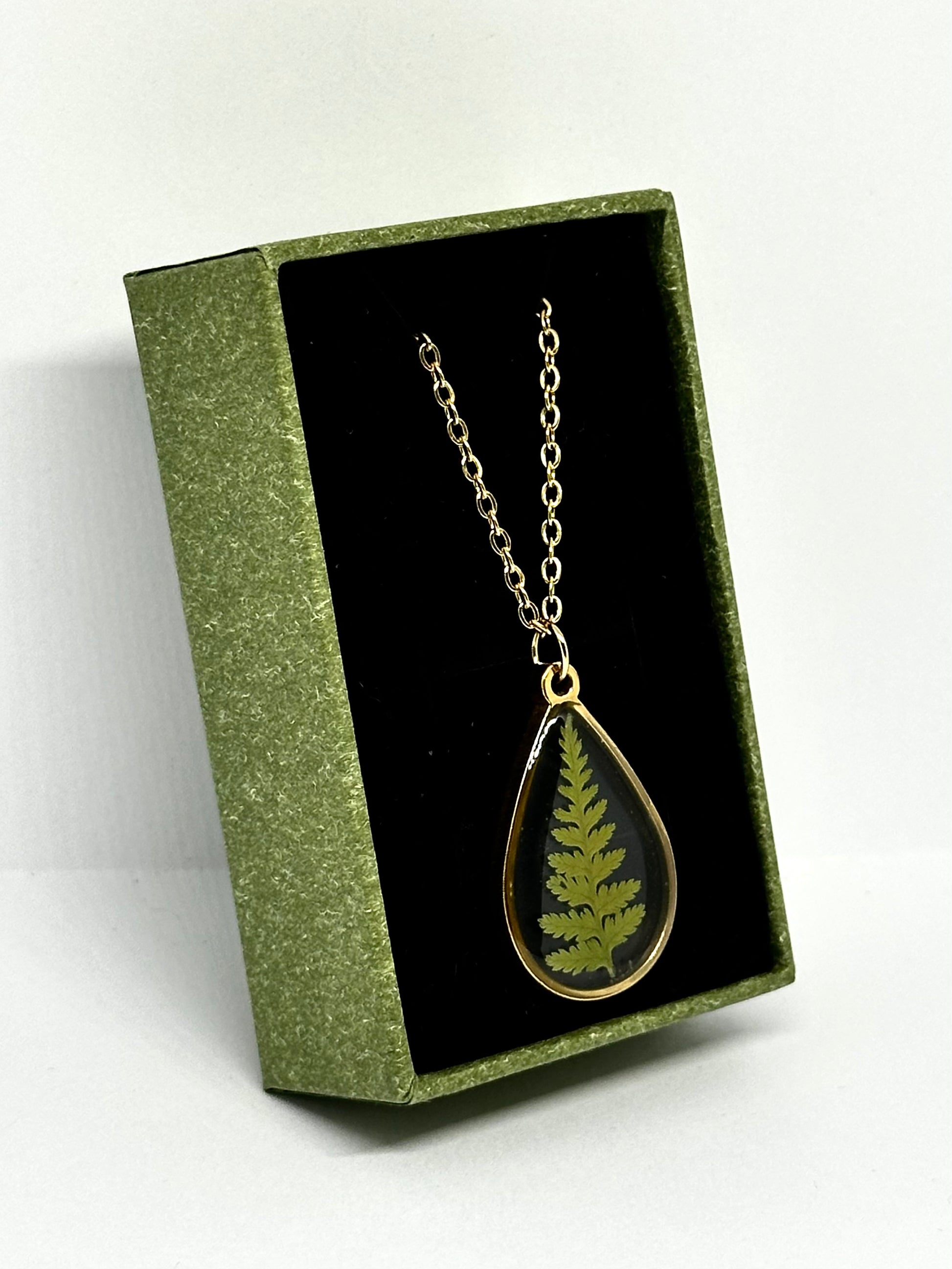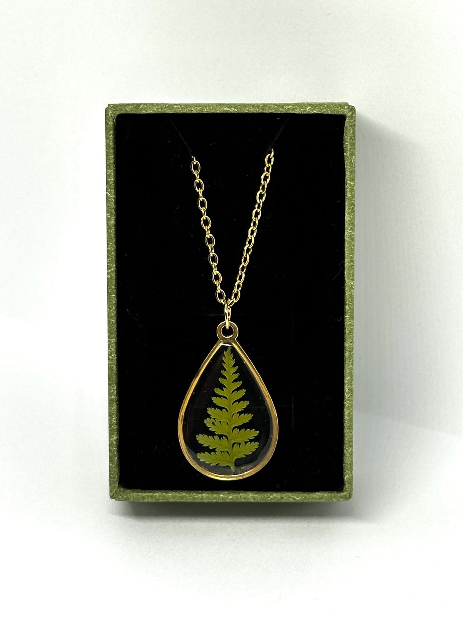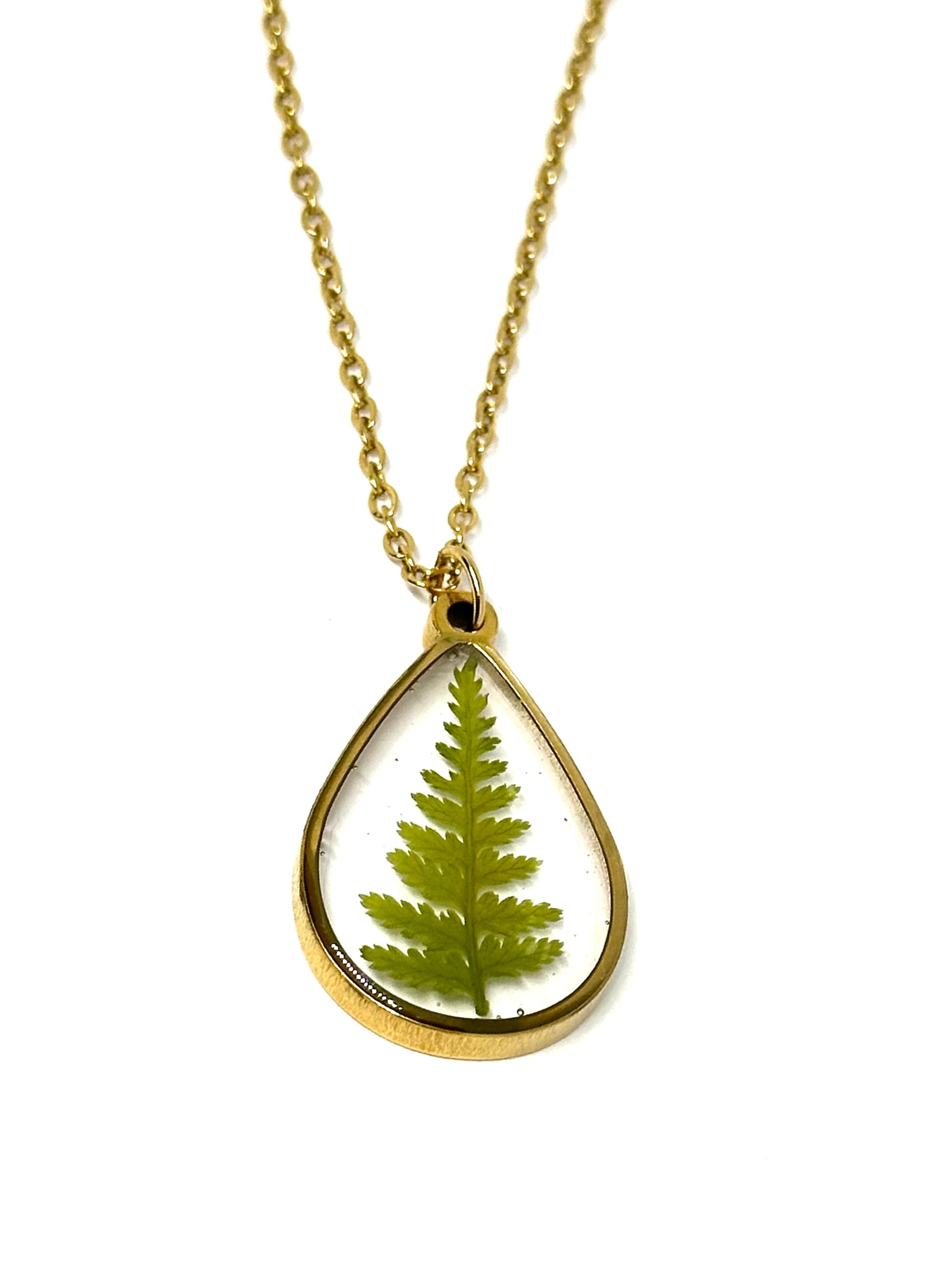 Ett halsband med en guldbas och ett droppformat hänge med transparent bakgrund. Inuti sticker ett pressat ormbunkeblad ut med sin fräschör och naturliga balans, vilket skapar ett enkelt och elegant smycke inspirerat av skogen.