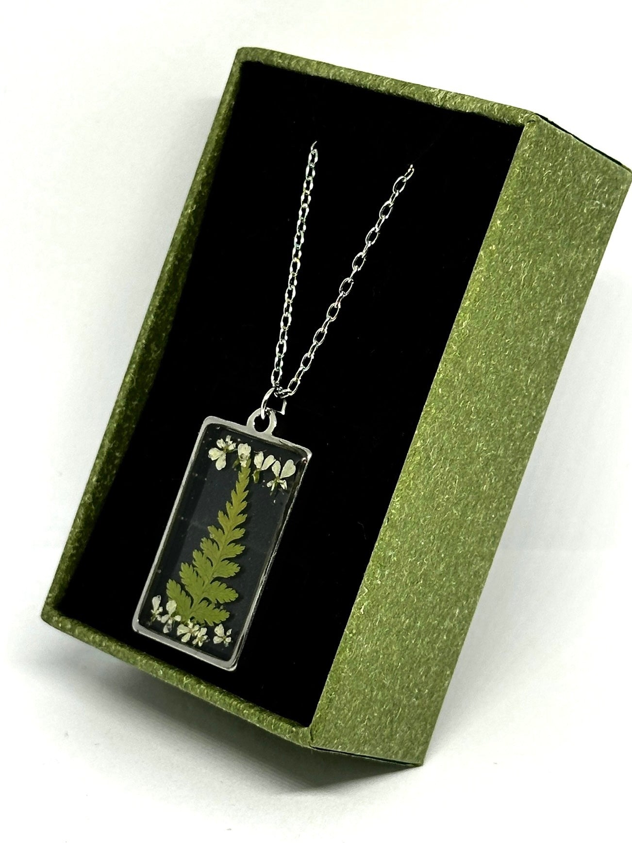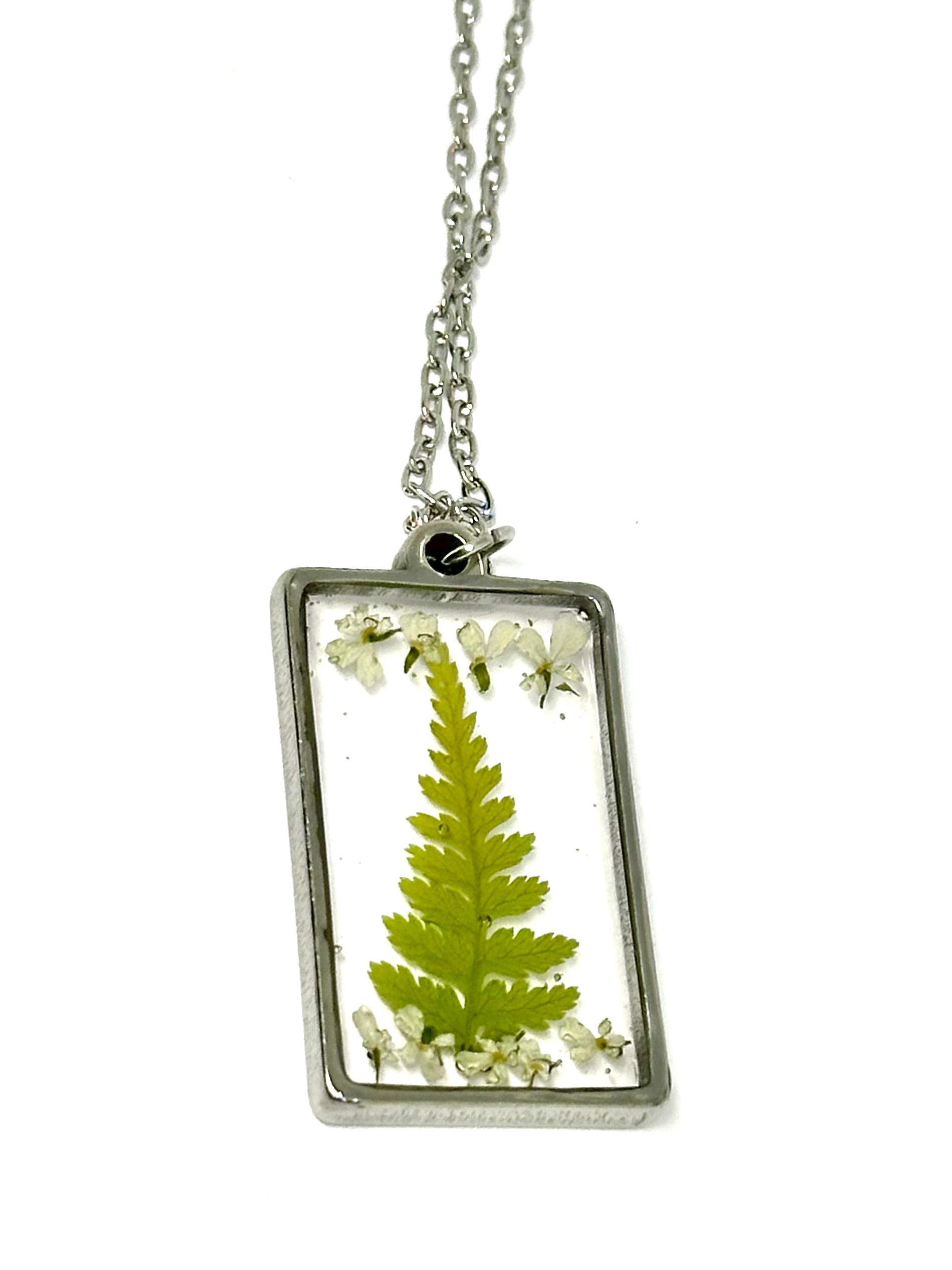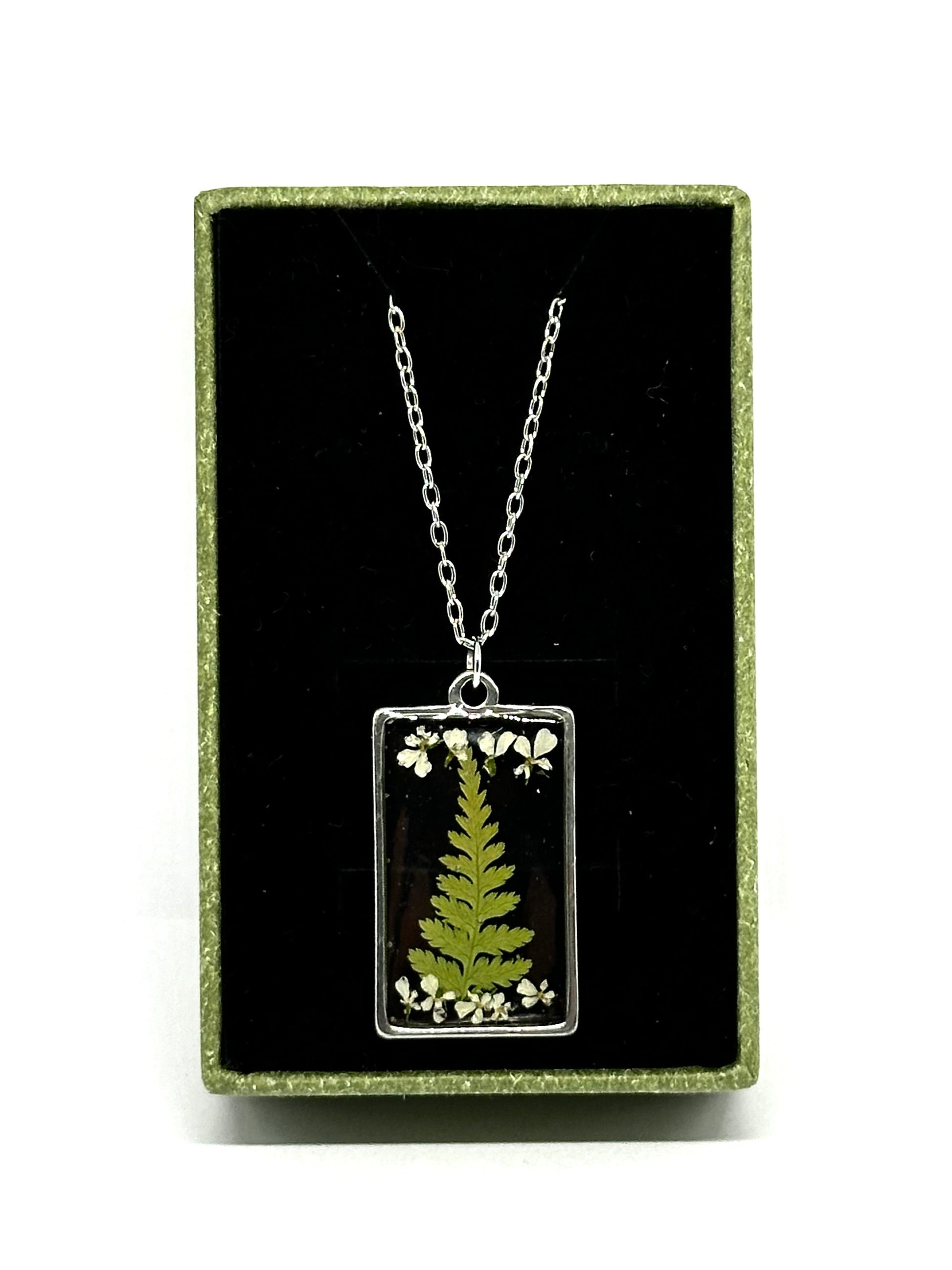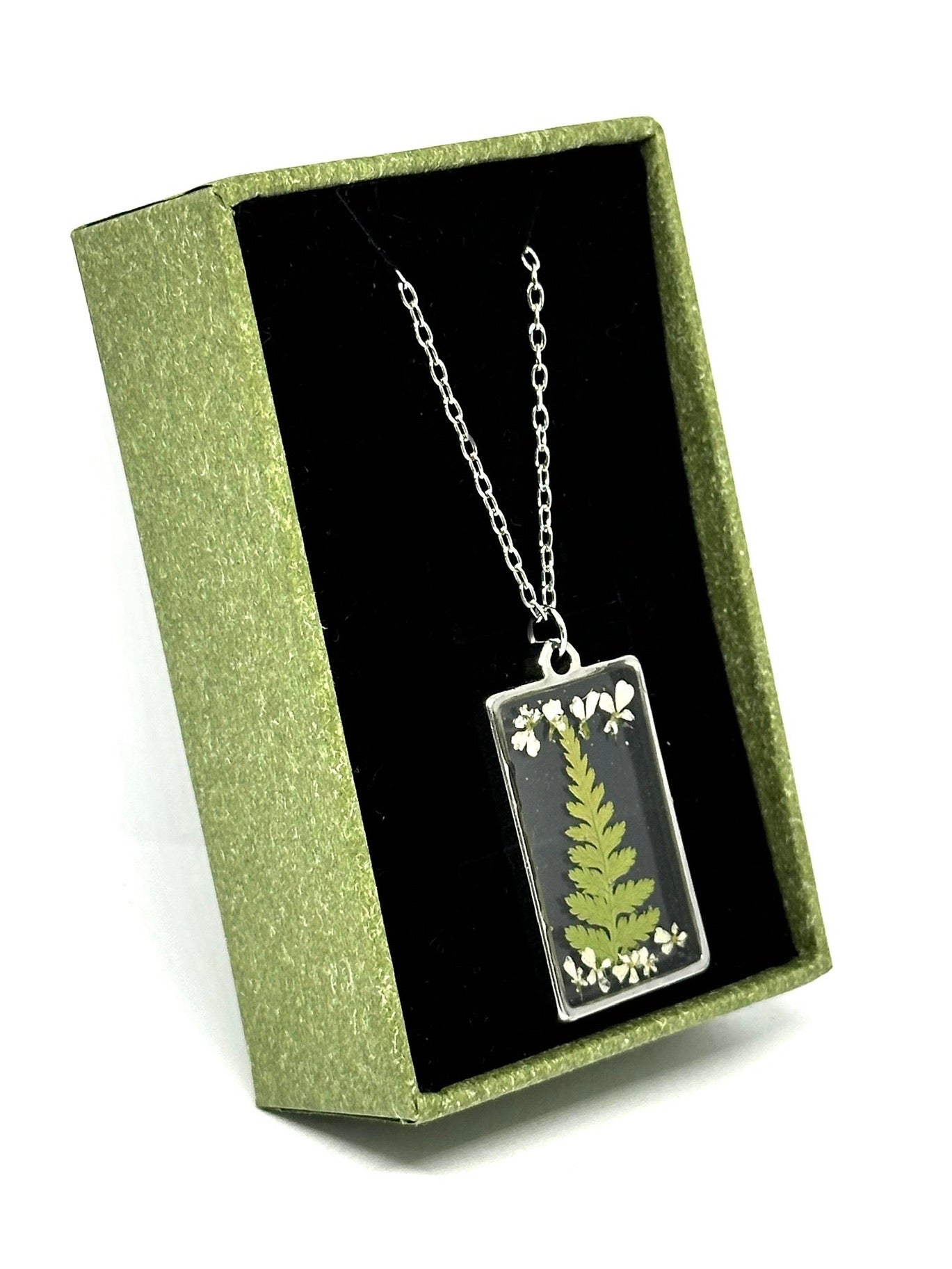 Halsband med silverbas och ett rektangulärt hänge med transparent bakgrund. Inuti finns ett pressat ormbunkeblad omgivet av små vita blommor, vilket bildar en naturlig och fridfull komposition som frammanar skogens fräschör.