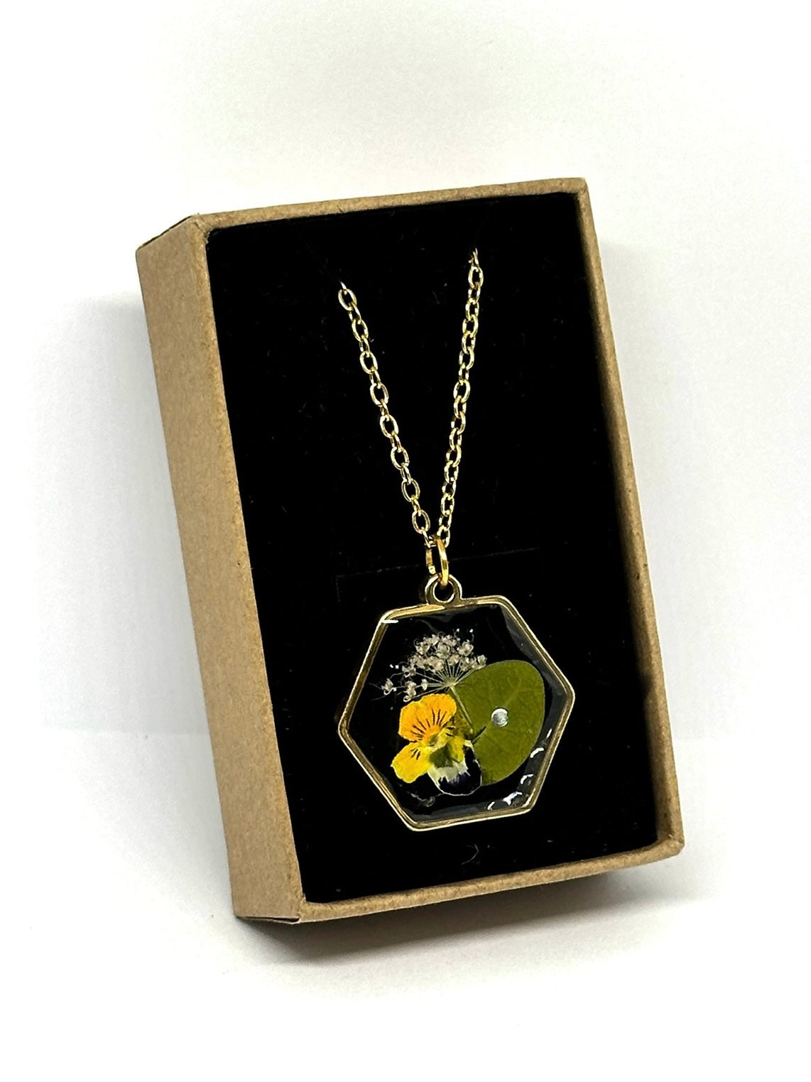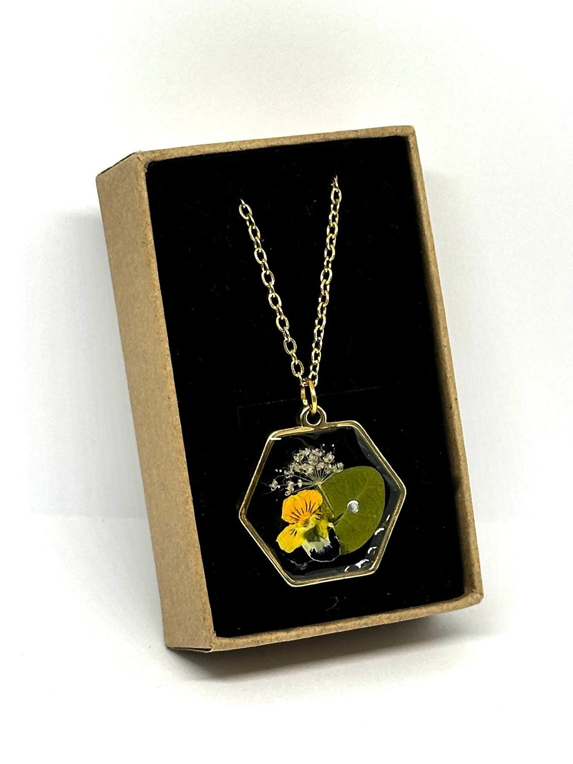 Halsband med ett guldfärgat hexagonalt hänge och en transparent bakgrund. Inuti finns en pensé i gula och violetta nyanser, tillsammans med ett runt grönt blad och små vita blommor.