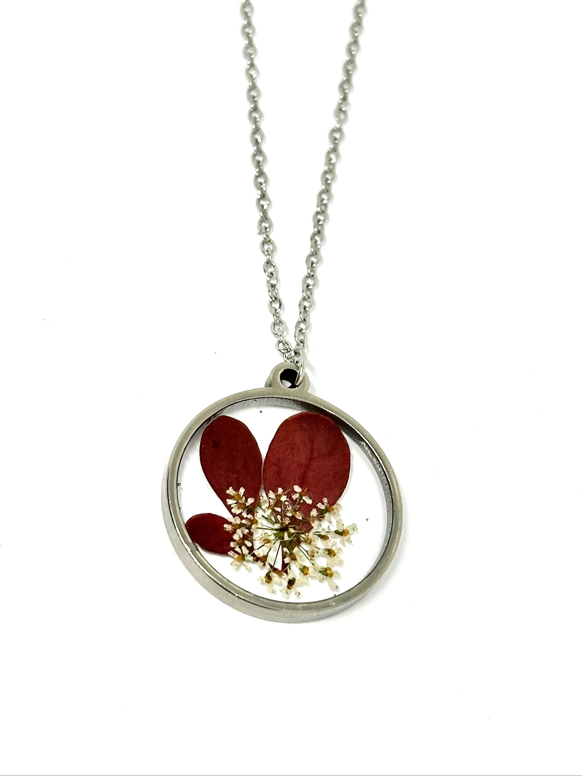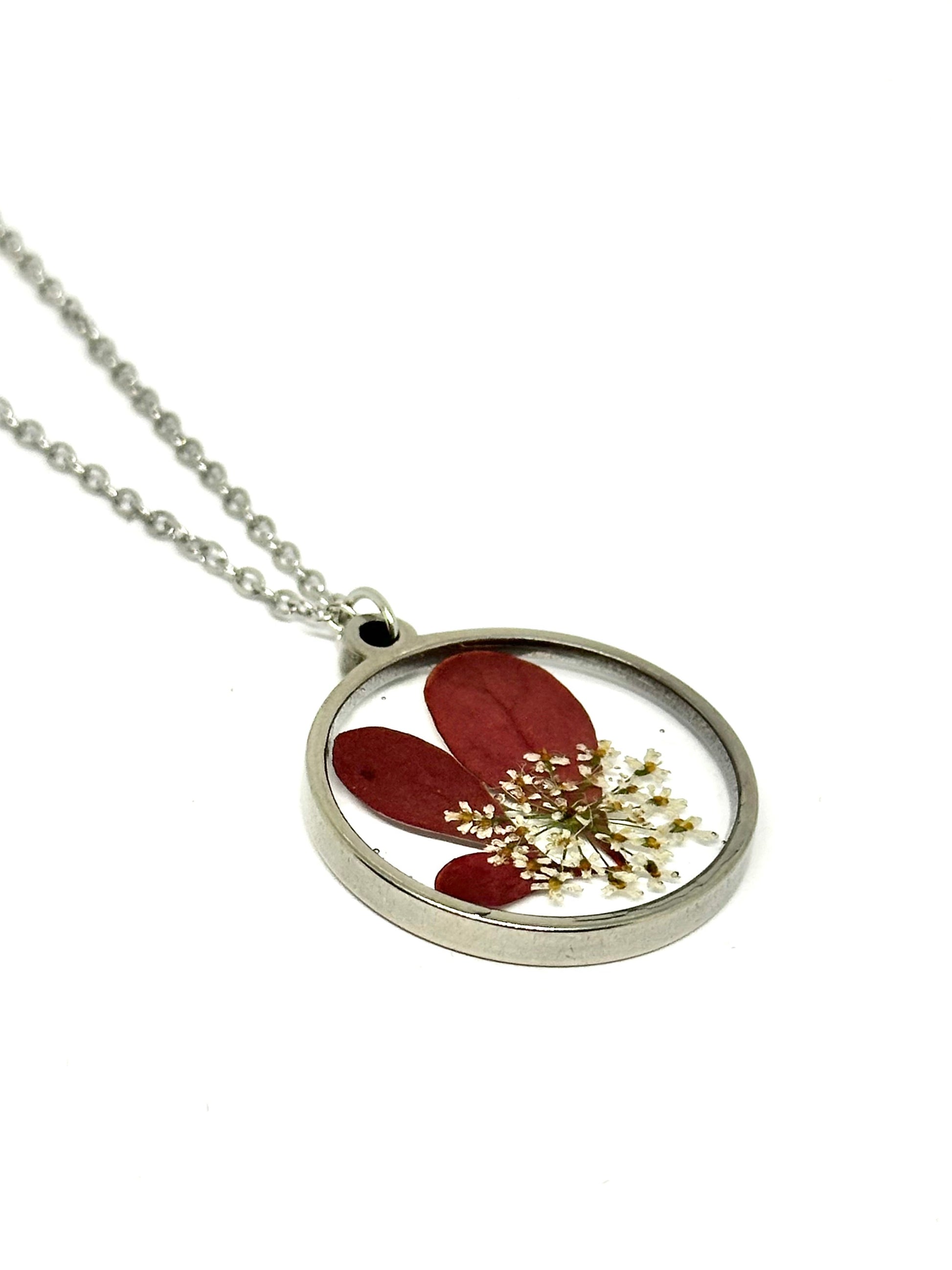 Försilvrat halsband med ett runt hänge och en transparent bakgrund. Inuti kombineras pressade rödaktiga blad med små vita blommor, vilket skapar en delikat och naturlig komposition som framkallar höstens lugn. Kedjan är tunn och justerbar.
