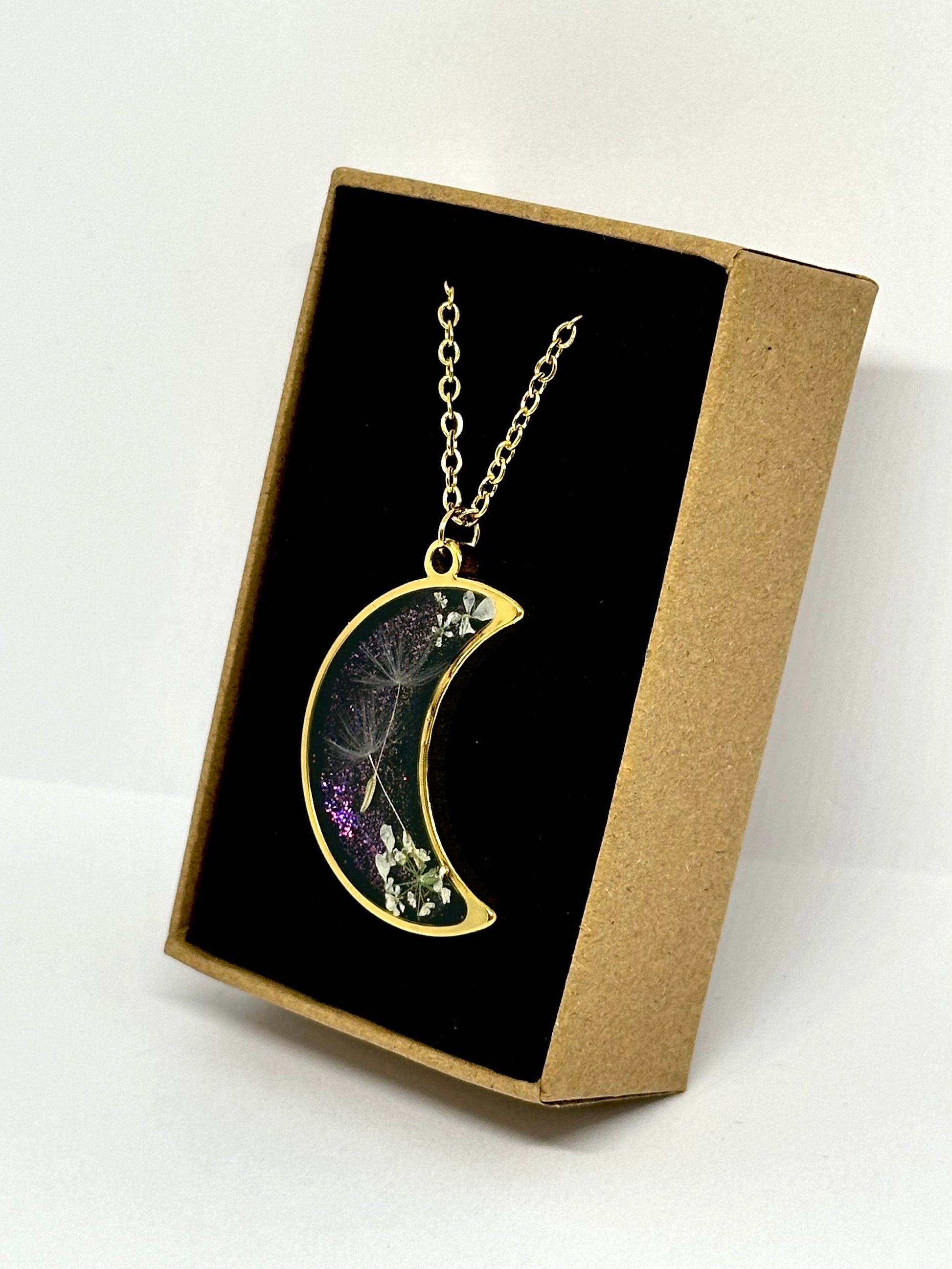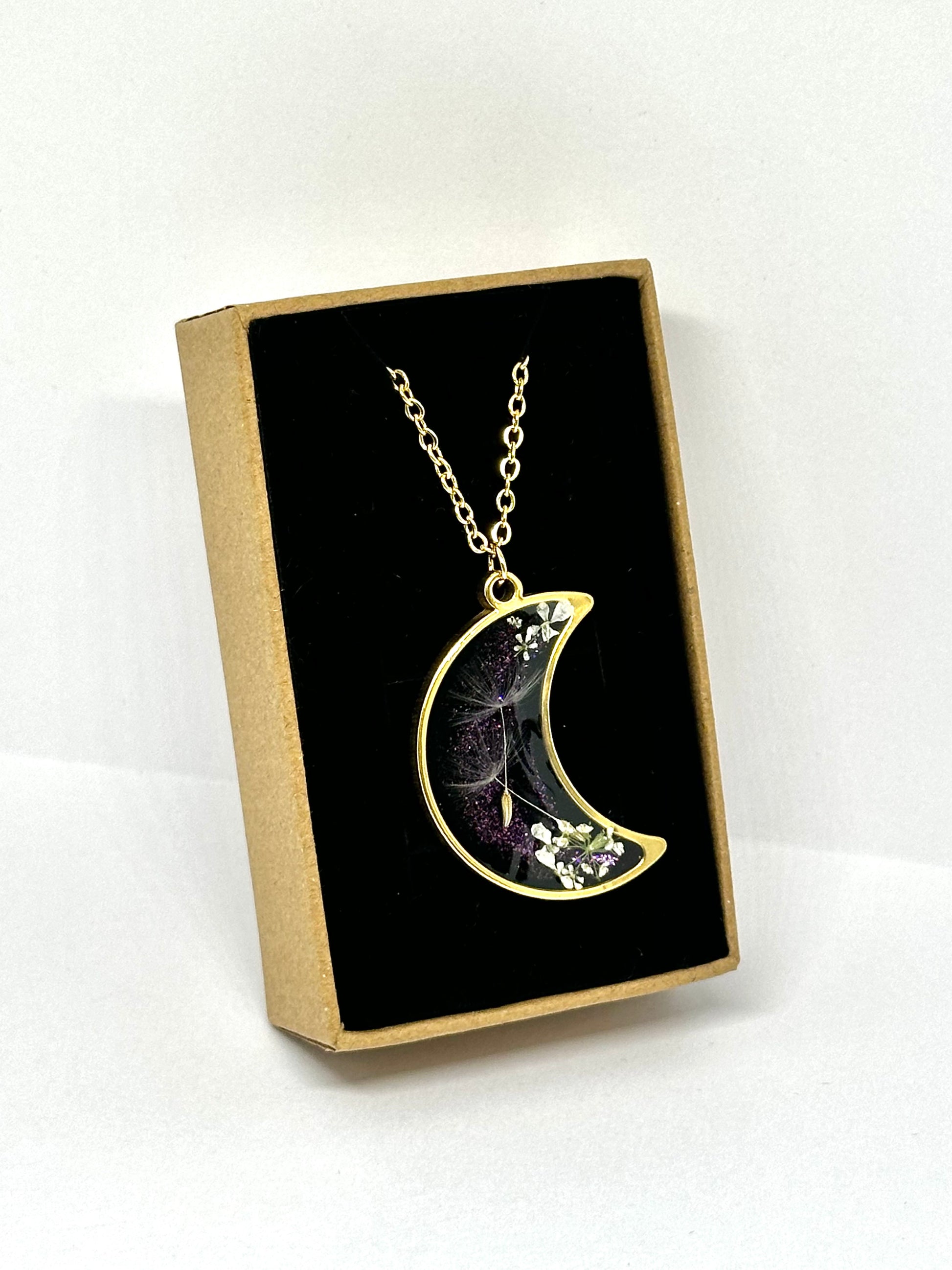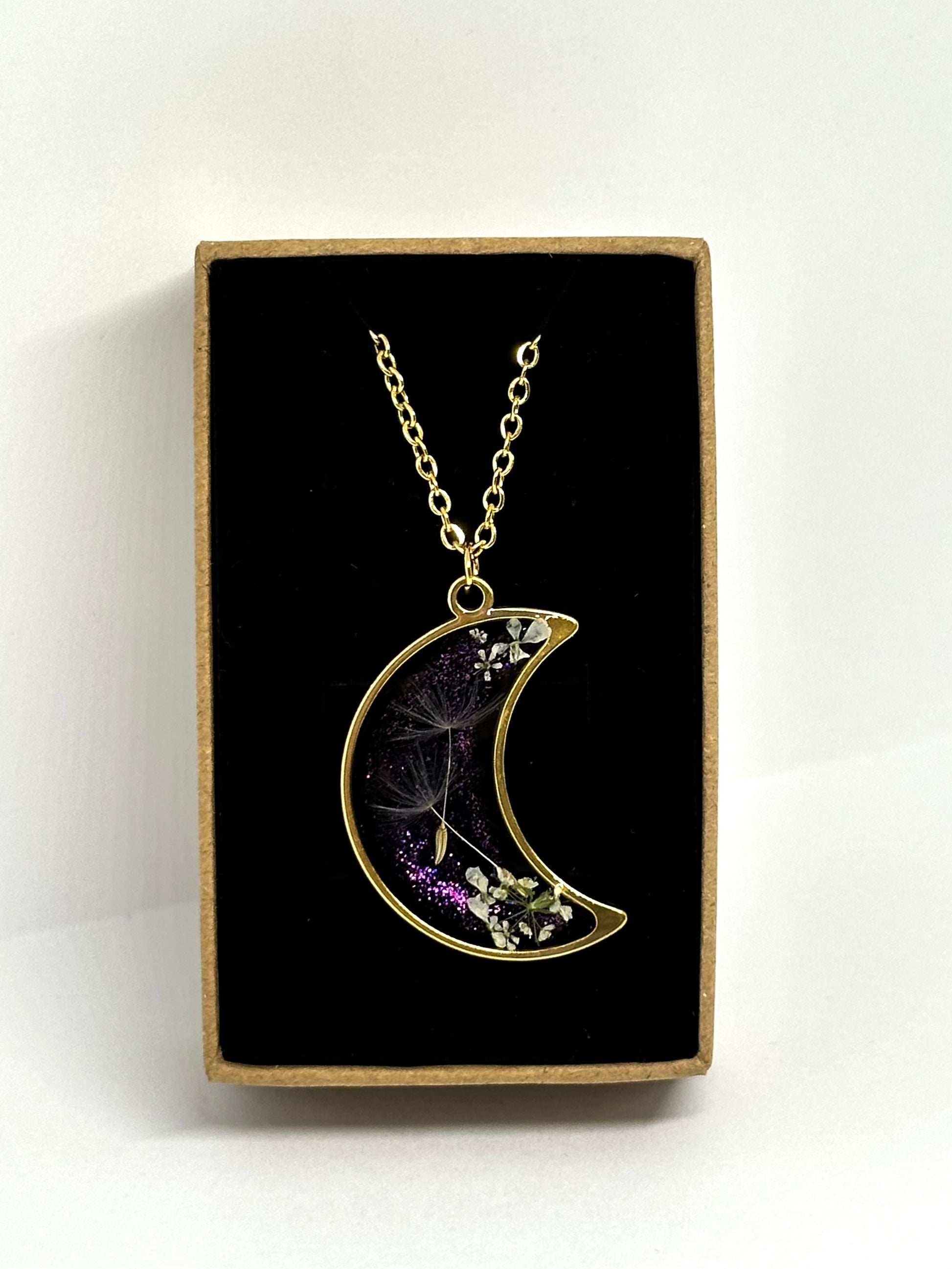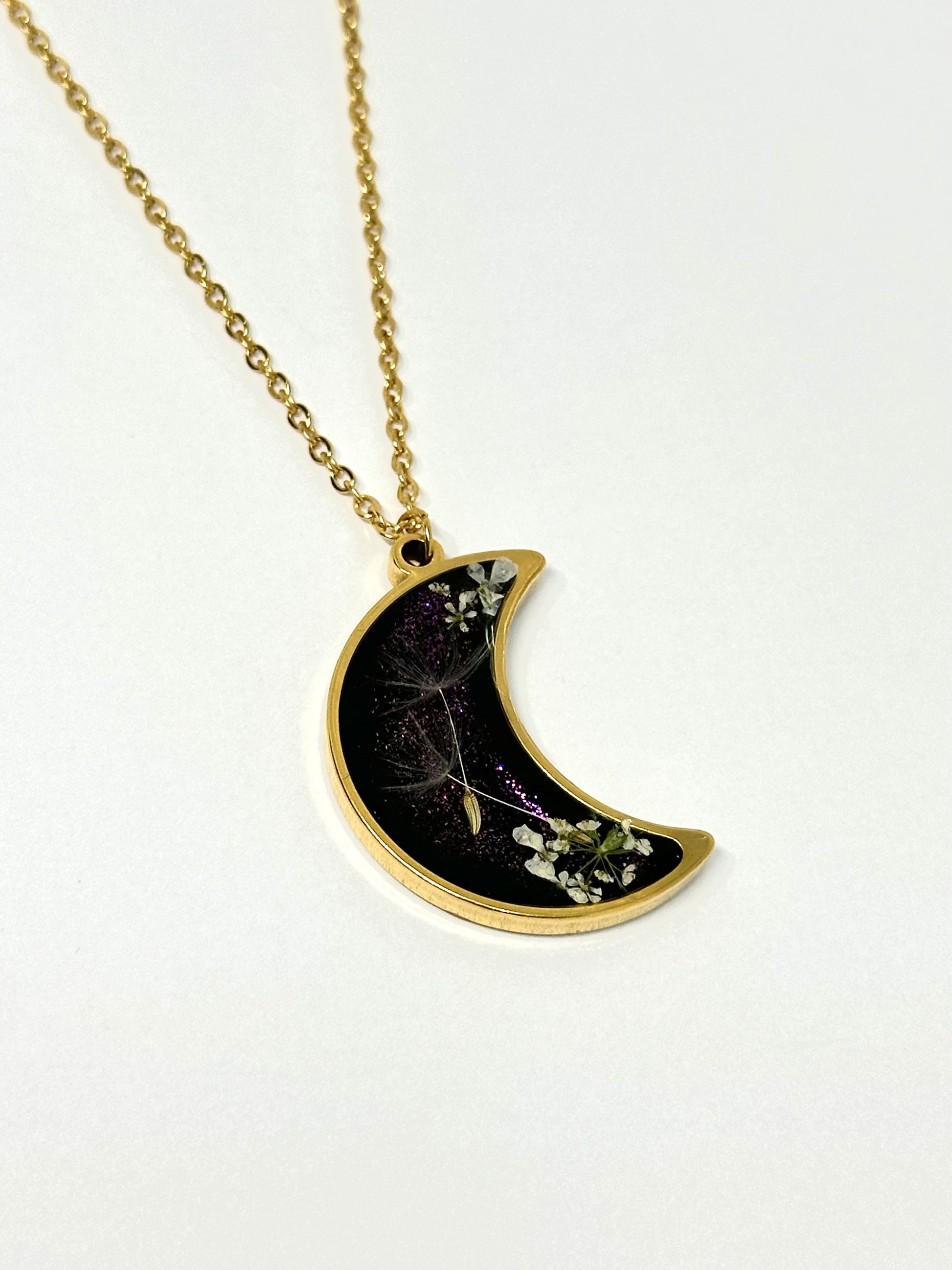Förgyllt halsband med ett halvmånehänge på svart bakgrund med violetta gnistrar. Inuti skapar fina maskros-tistlar och små pressade vita blommor en eterisk och mystisk komposition. Kedjan är tunn och justerbar.