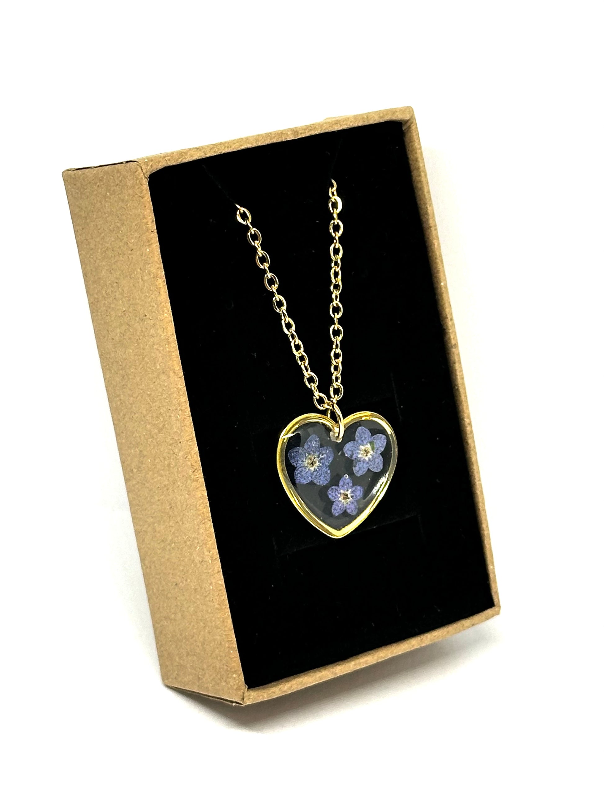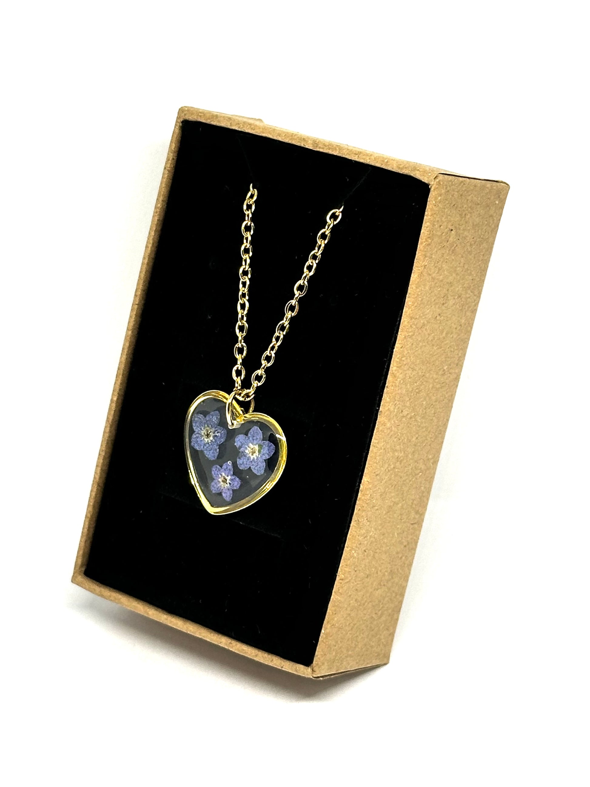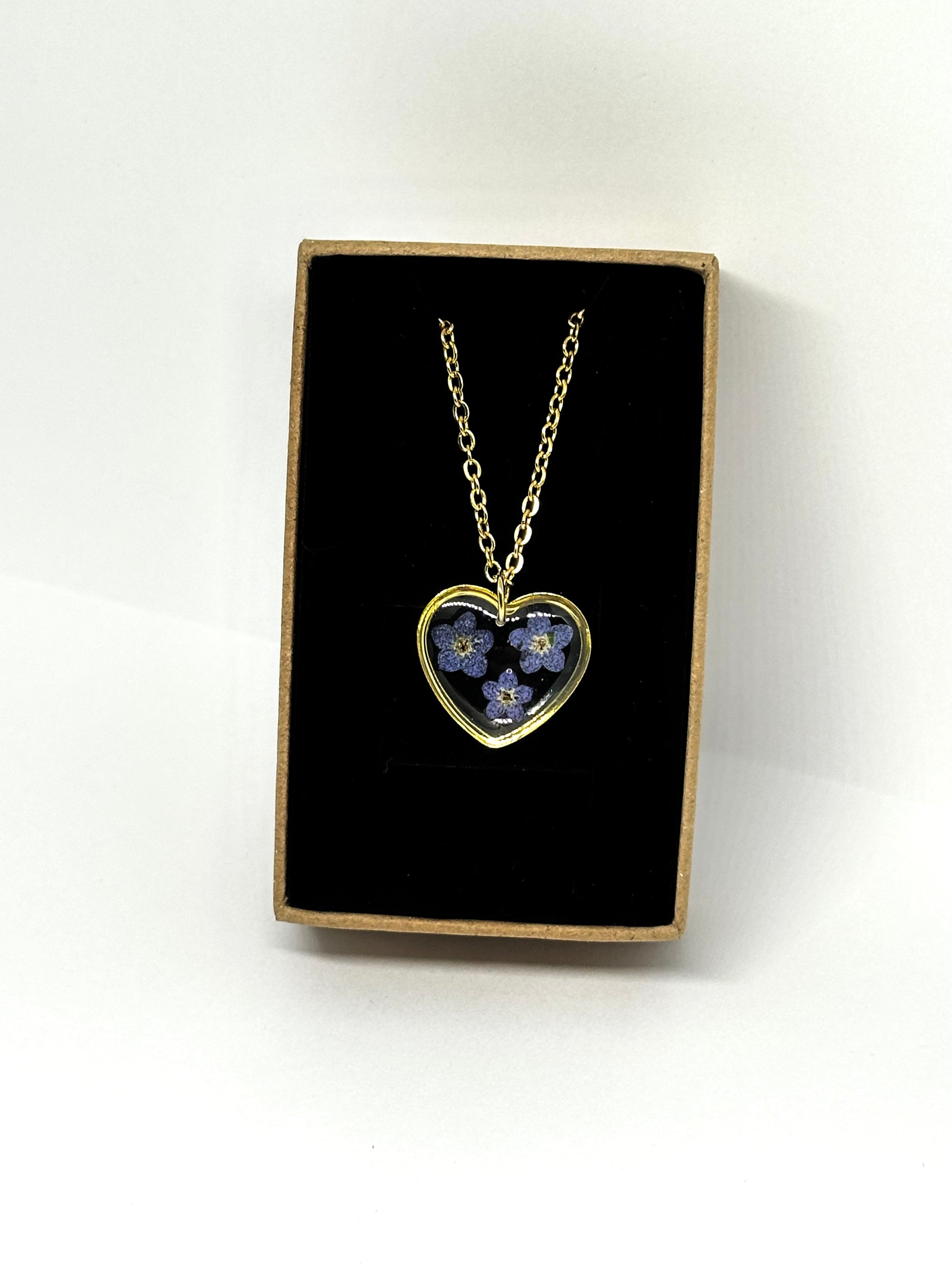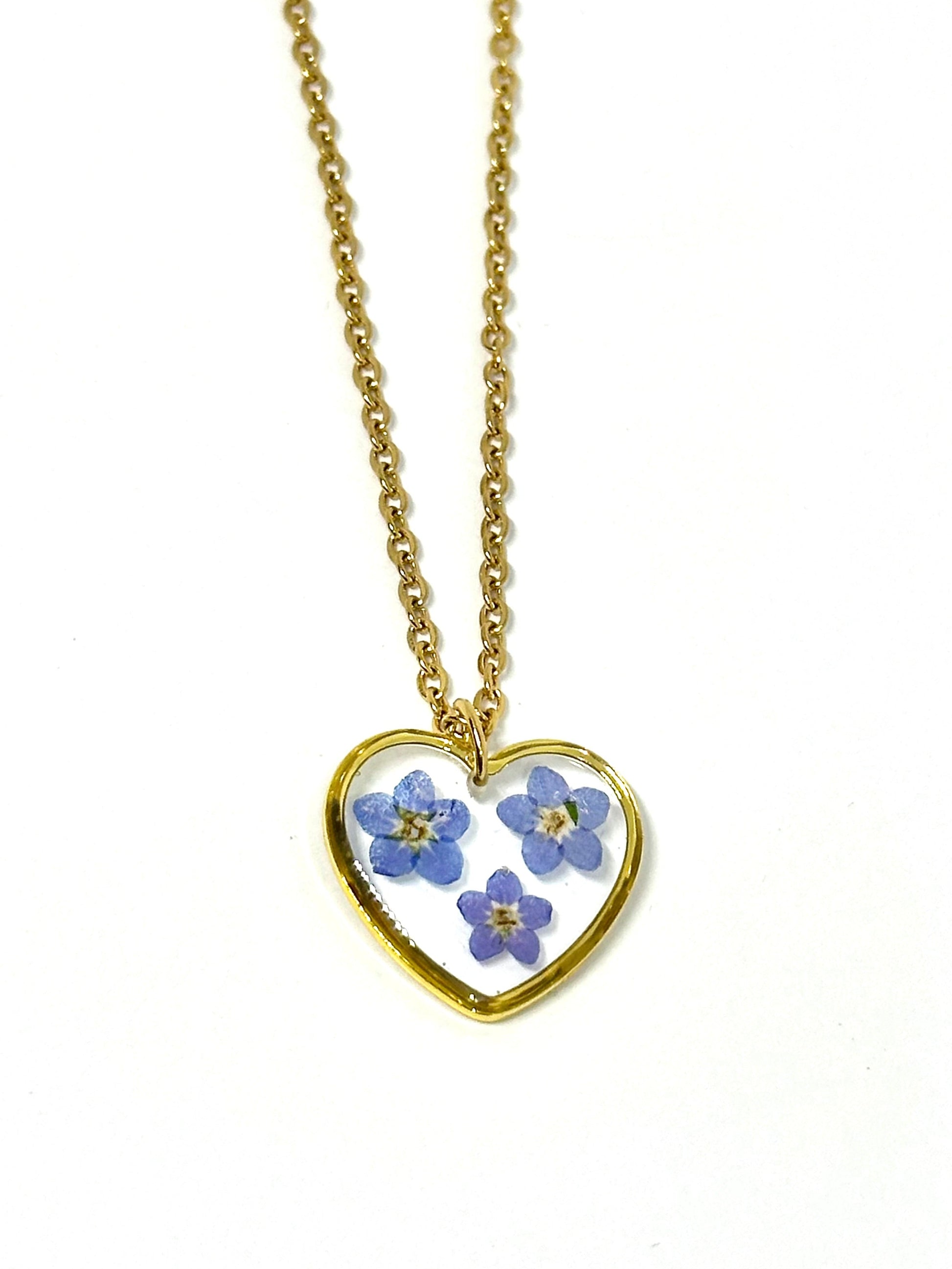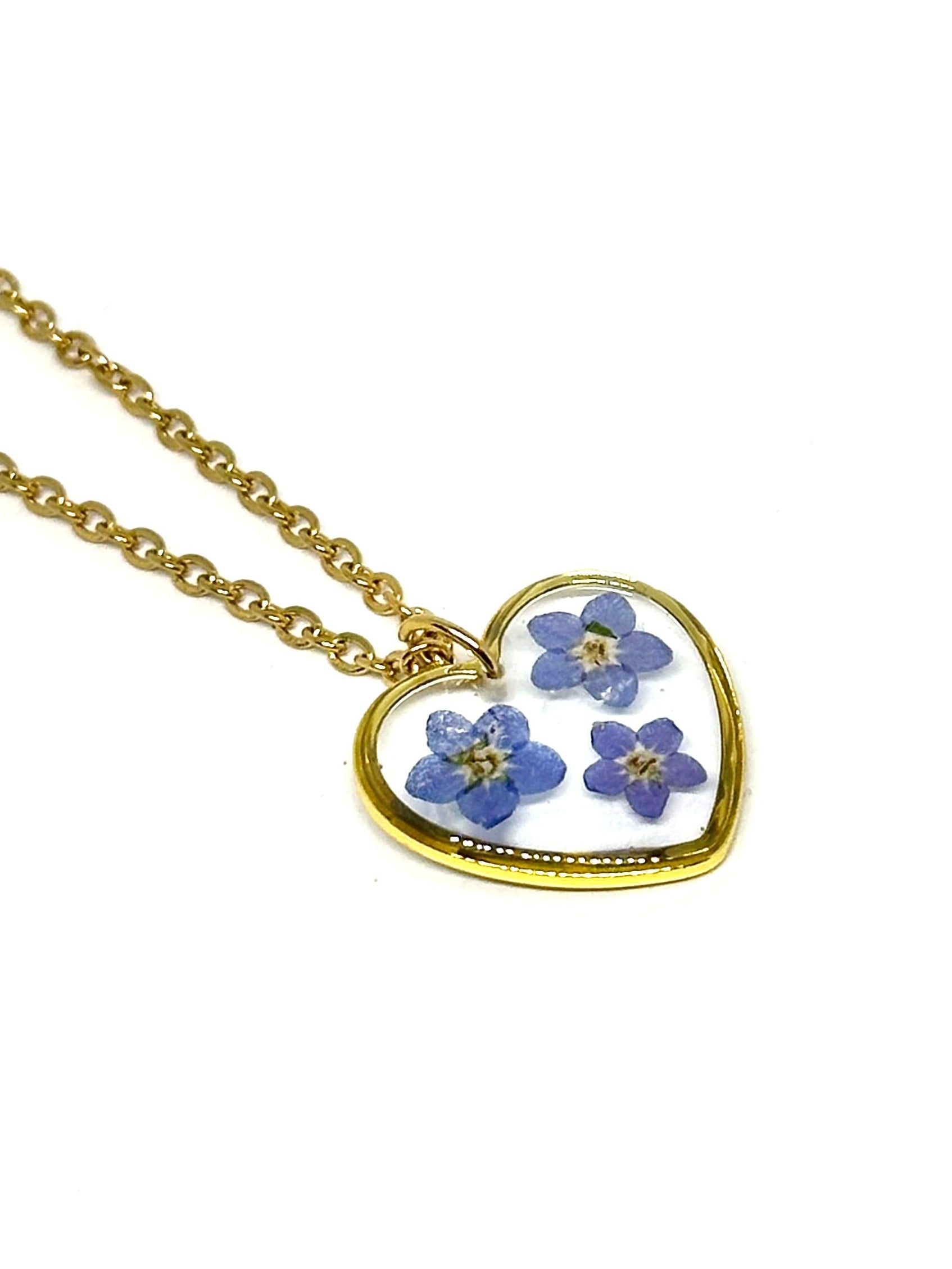 Förgyllt halsband med hjärtformat hänge och transparent bakgrund. Inuti är tre små blå pressade förgätmigej-blommor fint arrangerade, vilket skapar ett romantiskt och lysande smycke. Kedjan är tunn och justerbar.