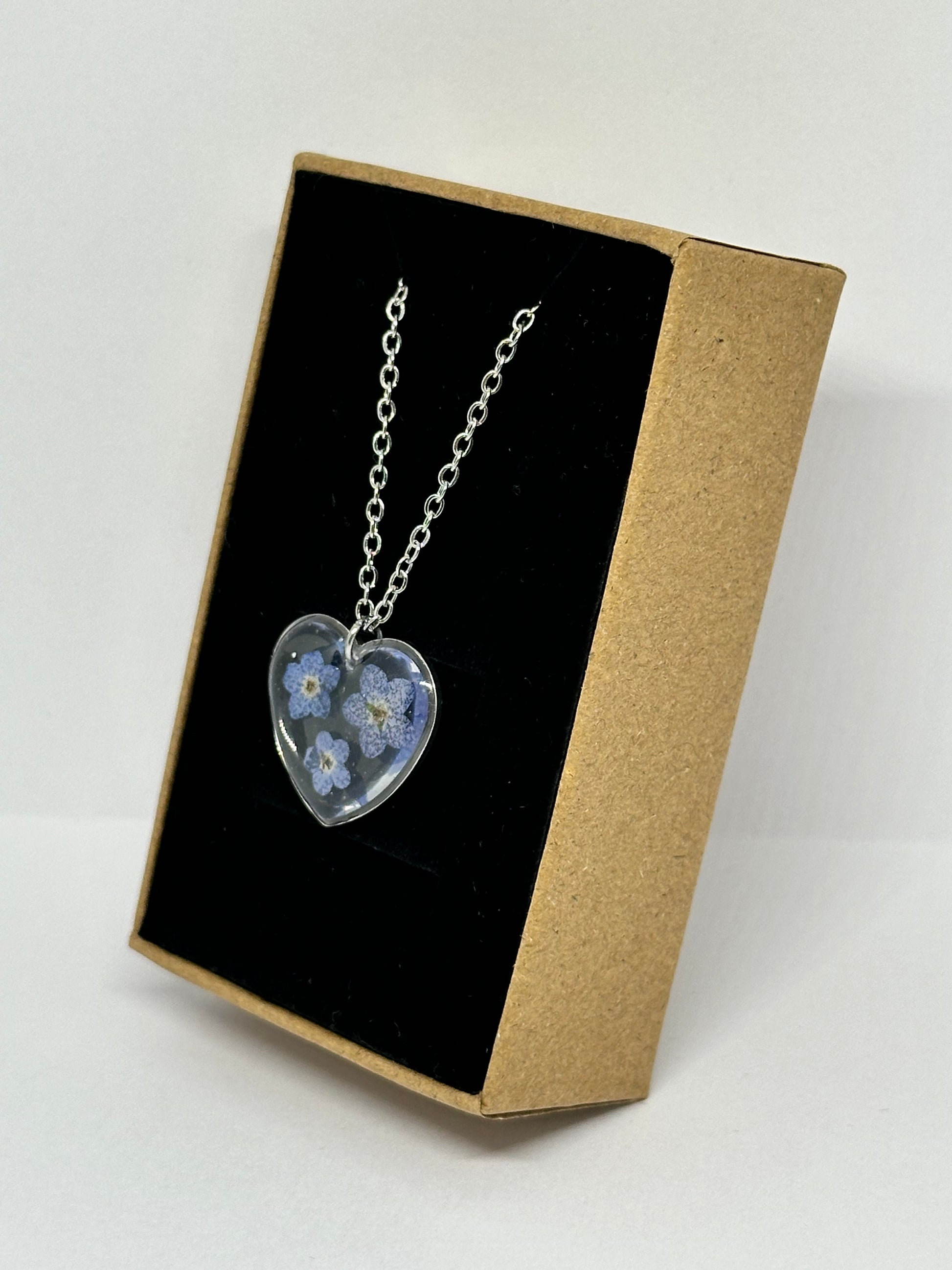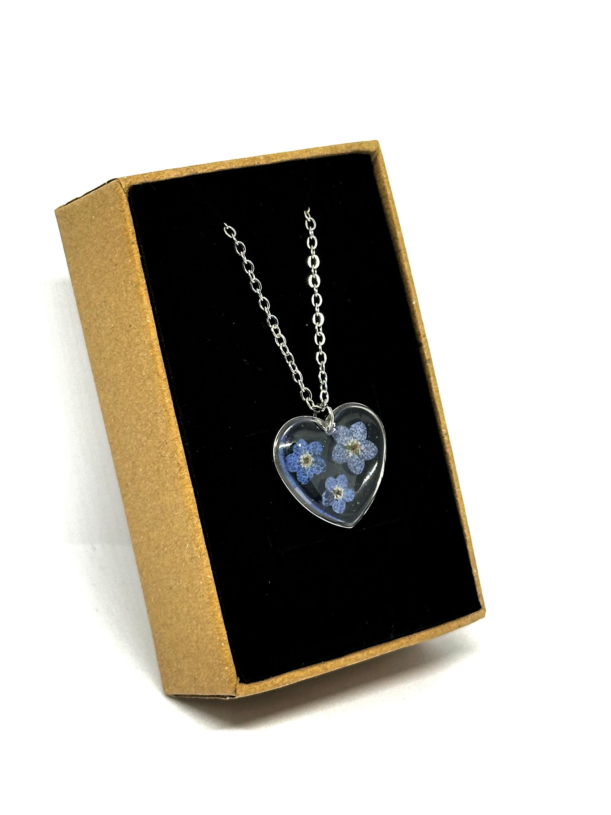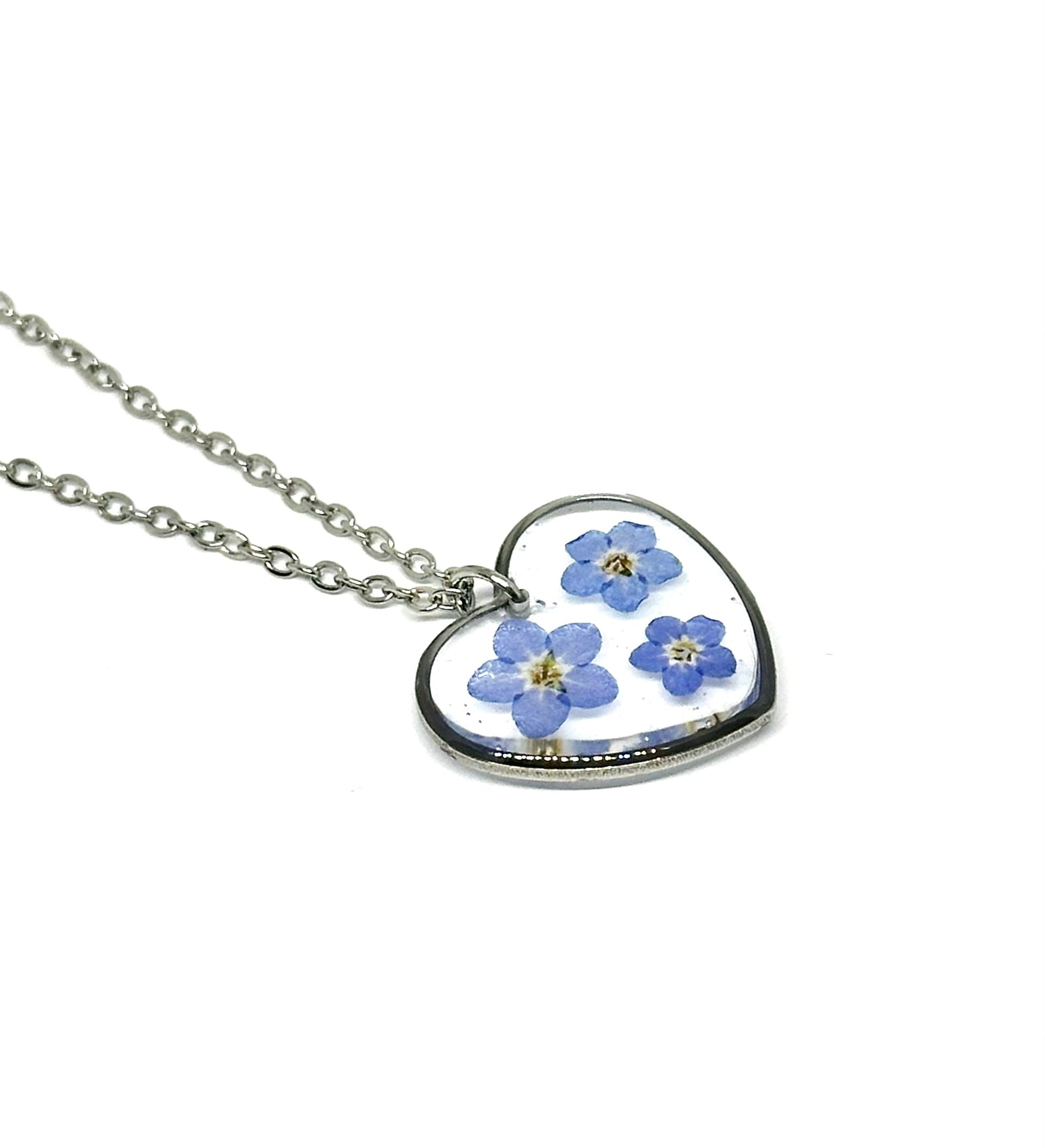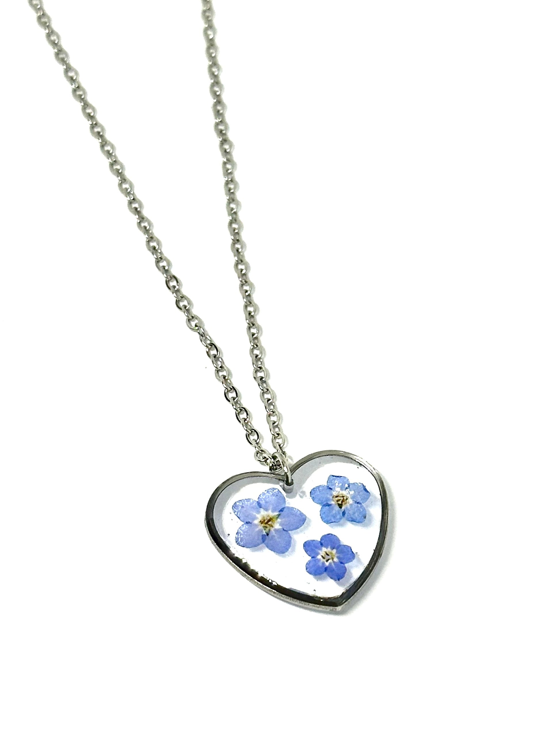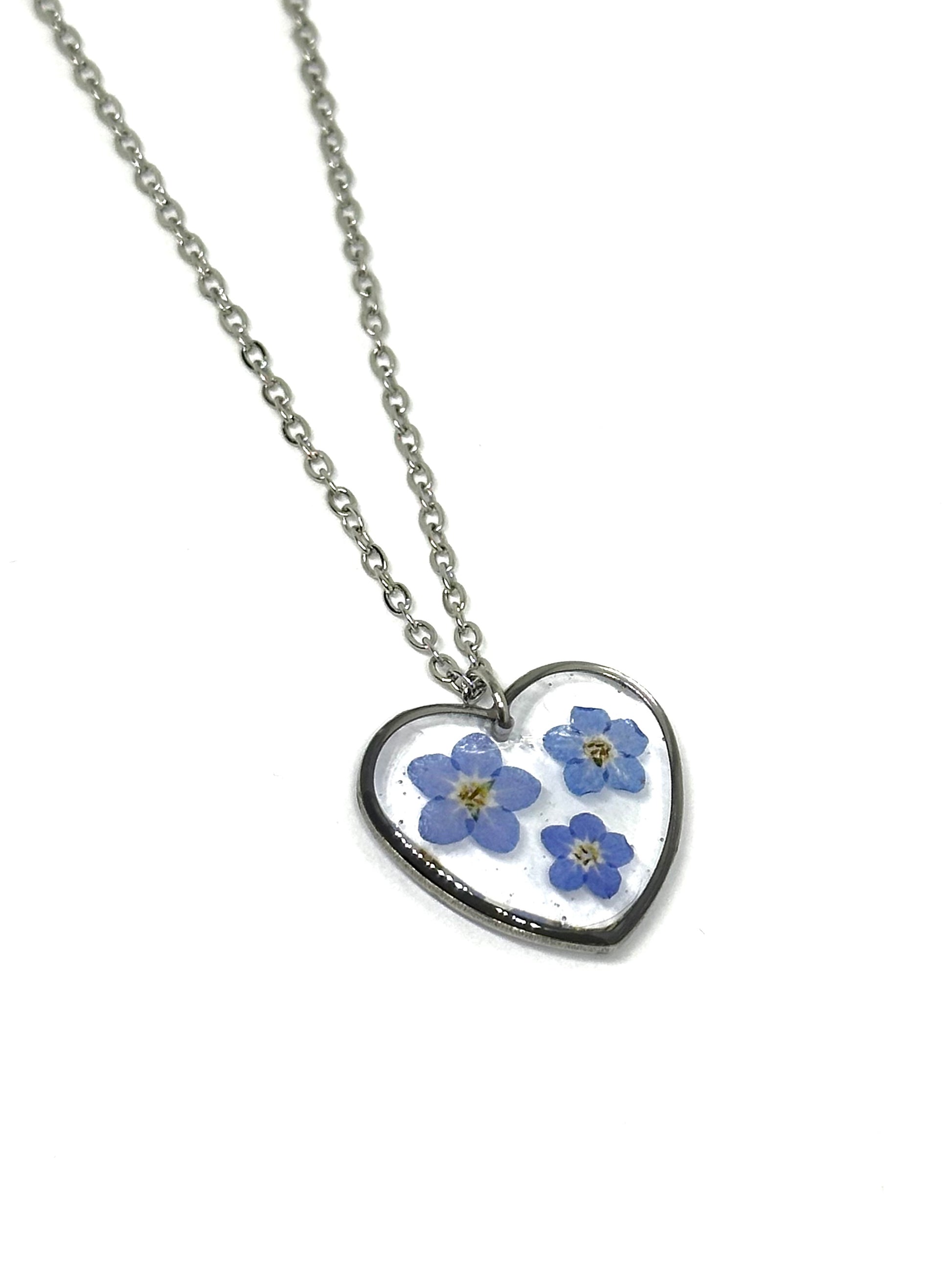 Försilvrat halsband med hjärtformat hänge och transparent bakgrund. Inuti är tre pressade blå förgätmigej-blommor harmoniskt arrangerade, vilket skapar ett delikat och symboliskt smycke. Kedjan är tunn och justerbar.