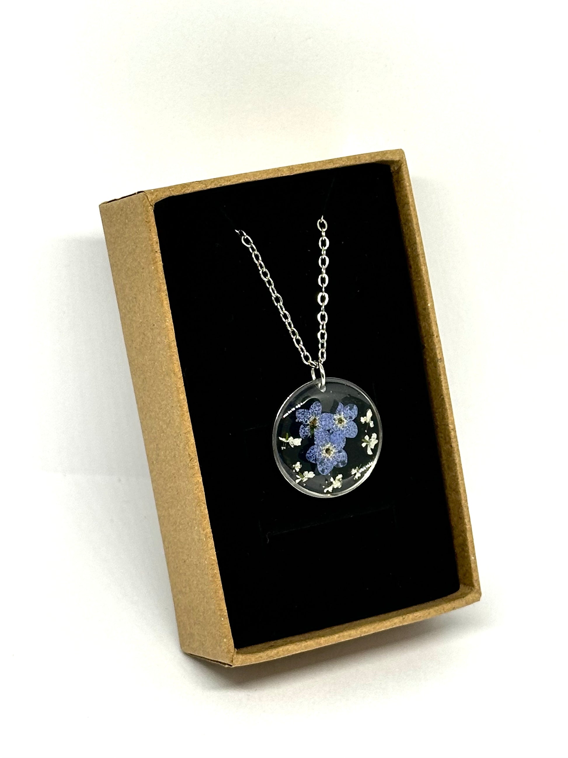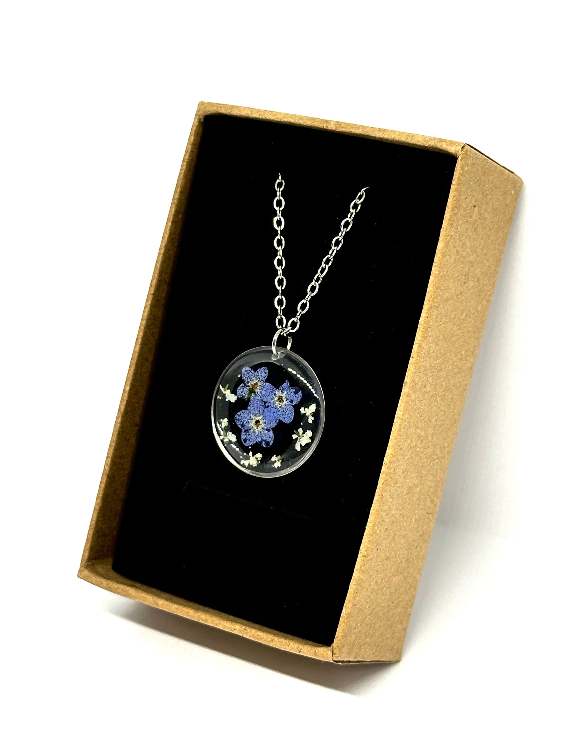 Silverhalsband med ett runt hänge och en transparent bakgrund. Inuti blandas en bukett blå förgätmigej-blommor med små pressade vita blommor, vilket skapar ett delikat och lysande smycke. Kedjan är tunn och justerbar.