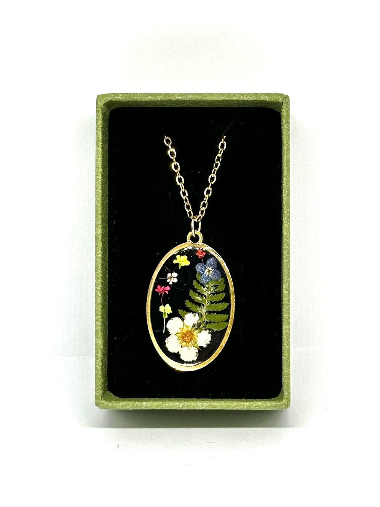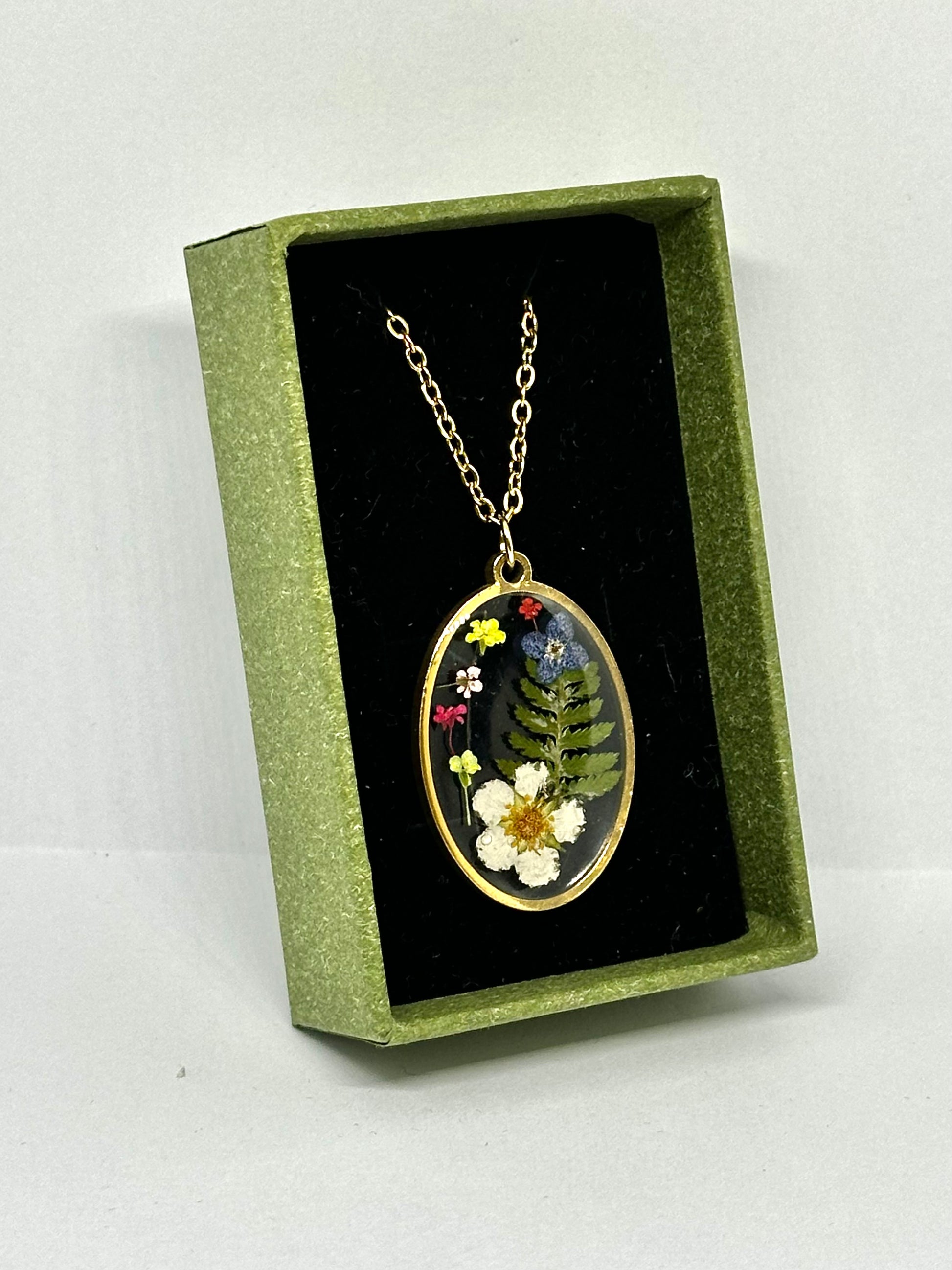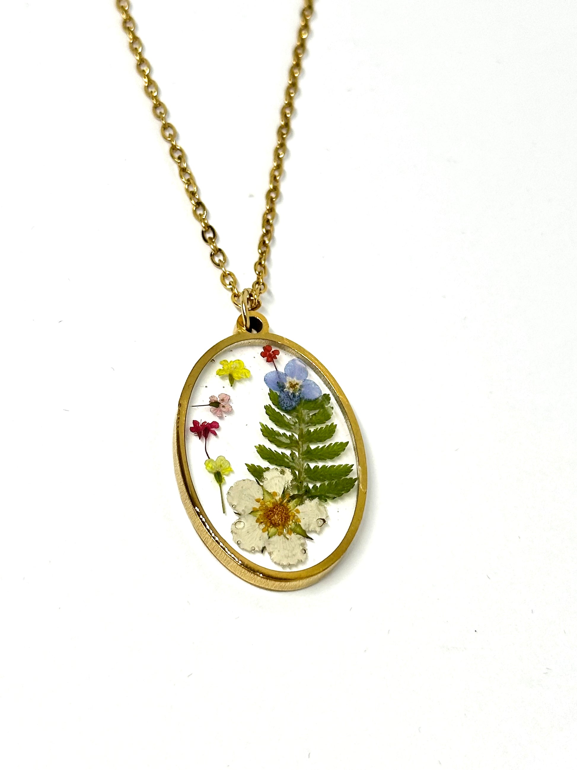 Halsband med ett ovalt guldhänge och en transparent bakgrund. Inuti finns en jordgubbsblomma som åtföljs av en liten ormbunke, en blå blomma och små flerfärgade blomdetaljer som frammanar en miniatyr vild trädgård.