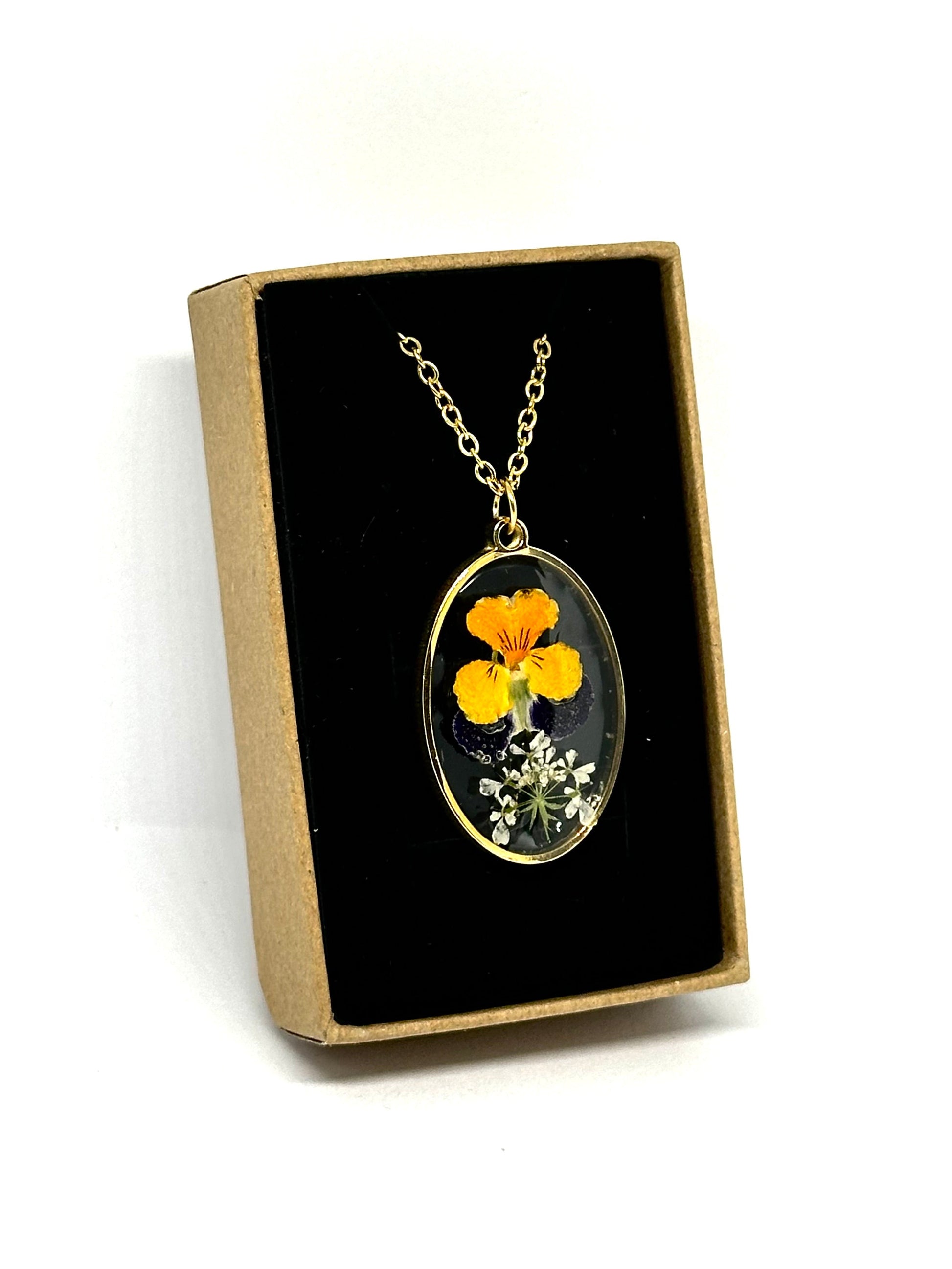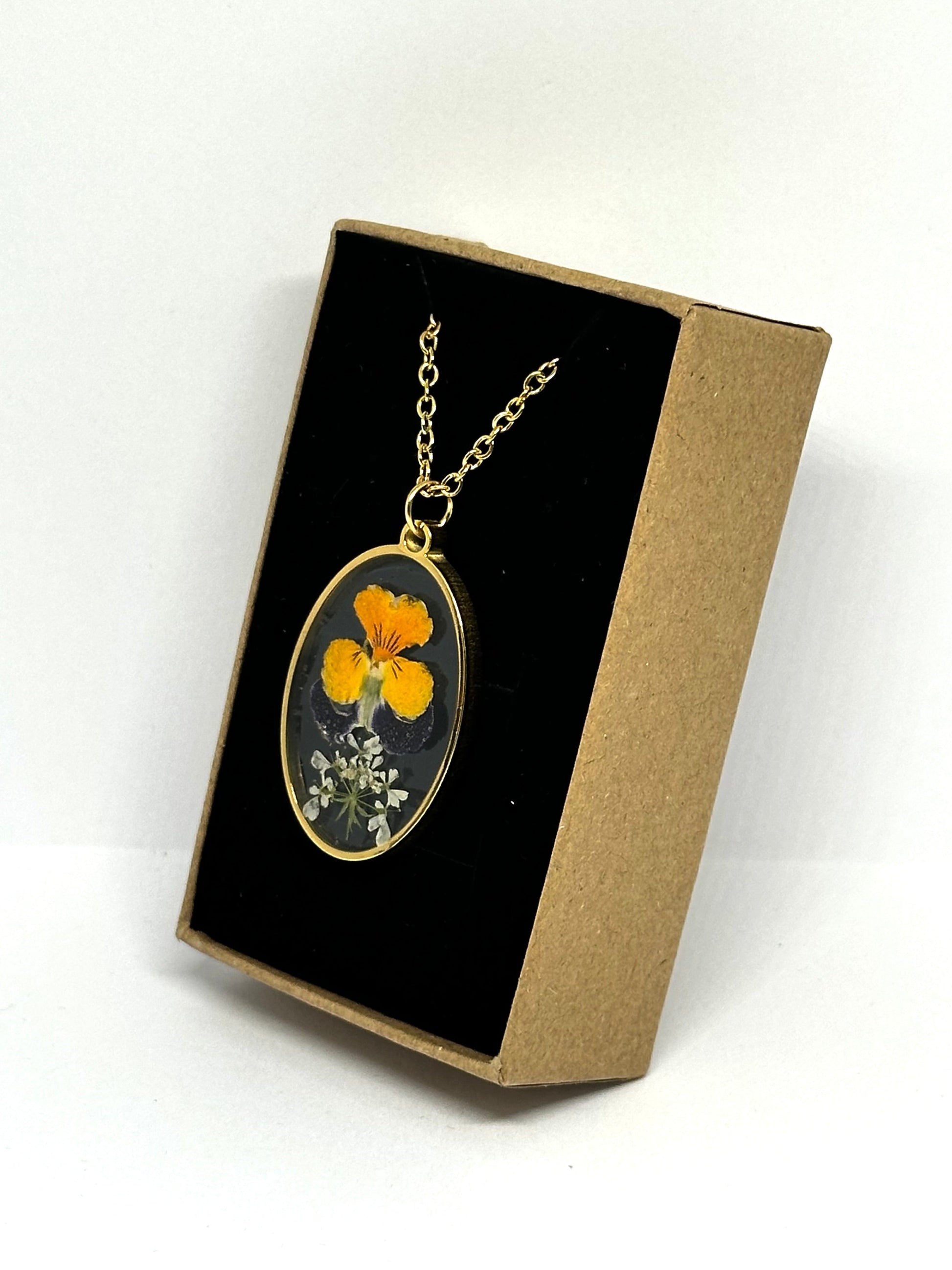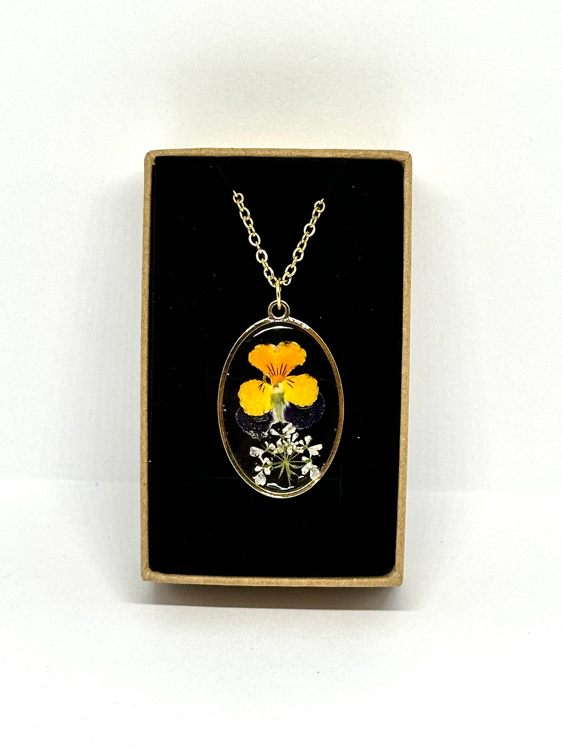 Halsband med ett ovalt hänge på en guldbas och transparent bakgrund. Inuti skapar en gul penséblomma med mörk mitt tillsammans med små vita blommor en lysande och harmonisk komposition.
