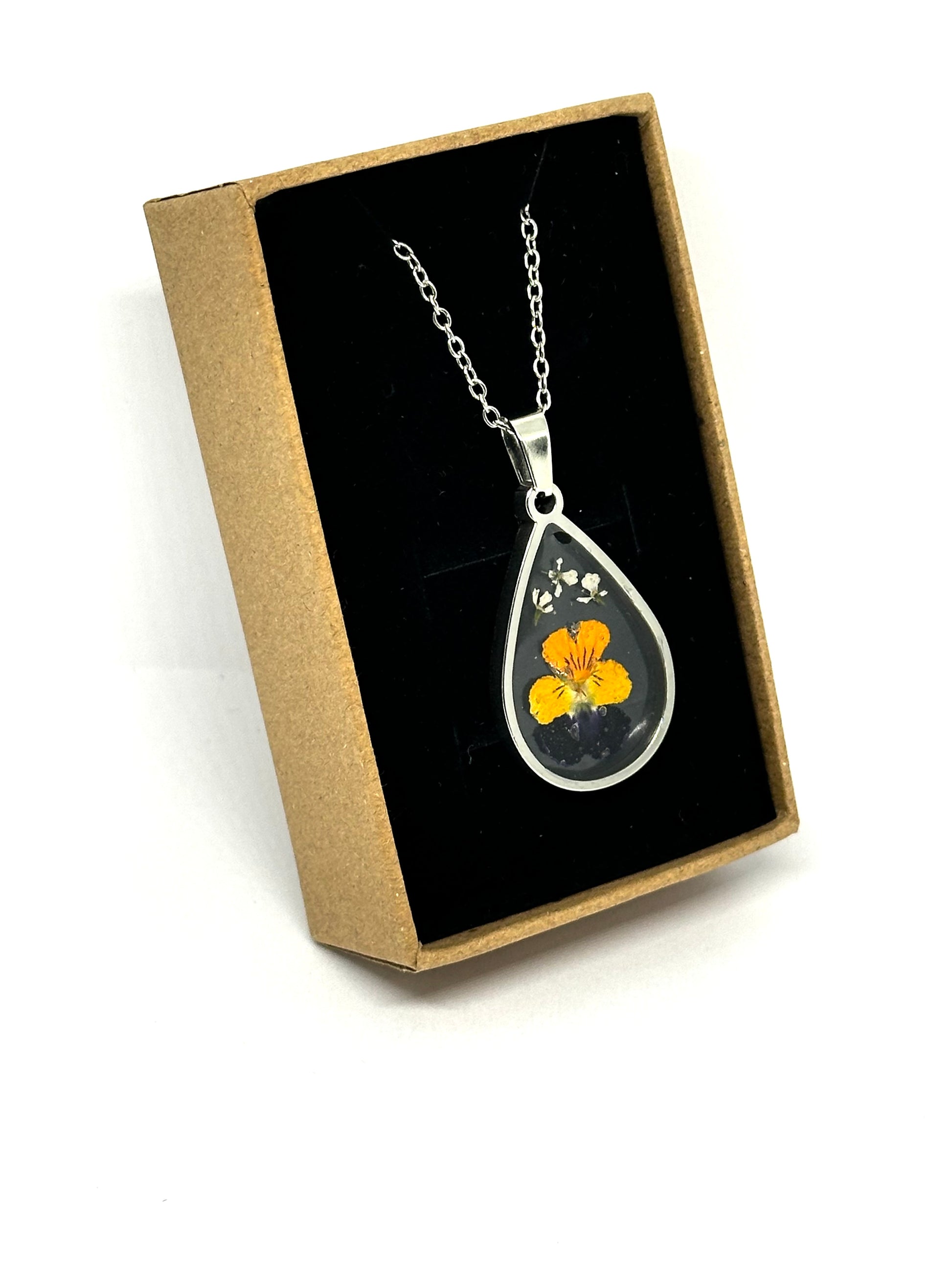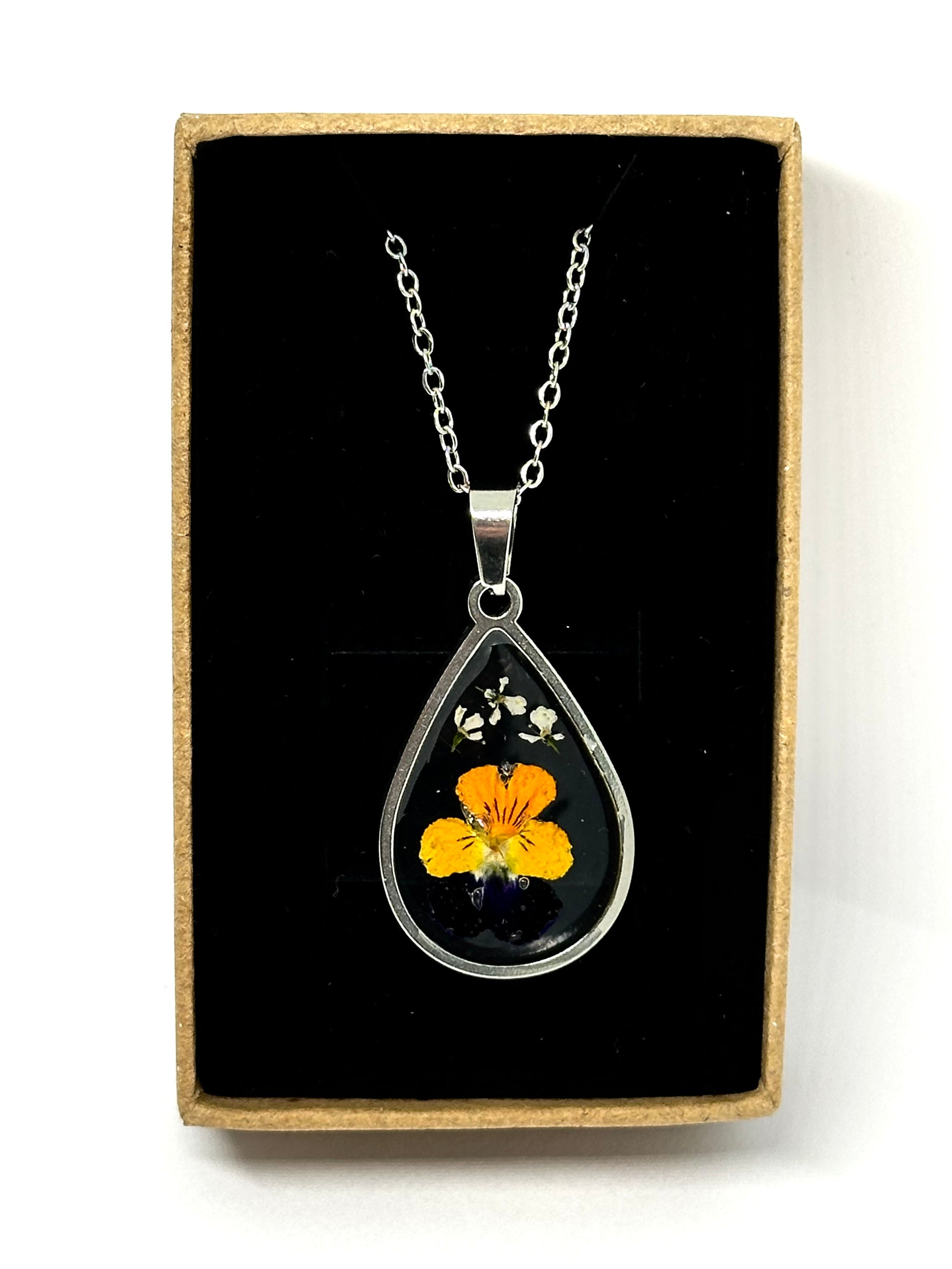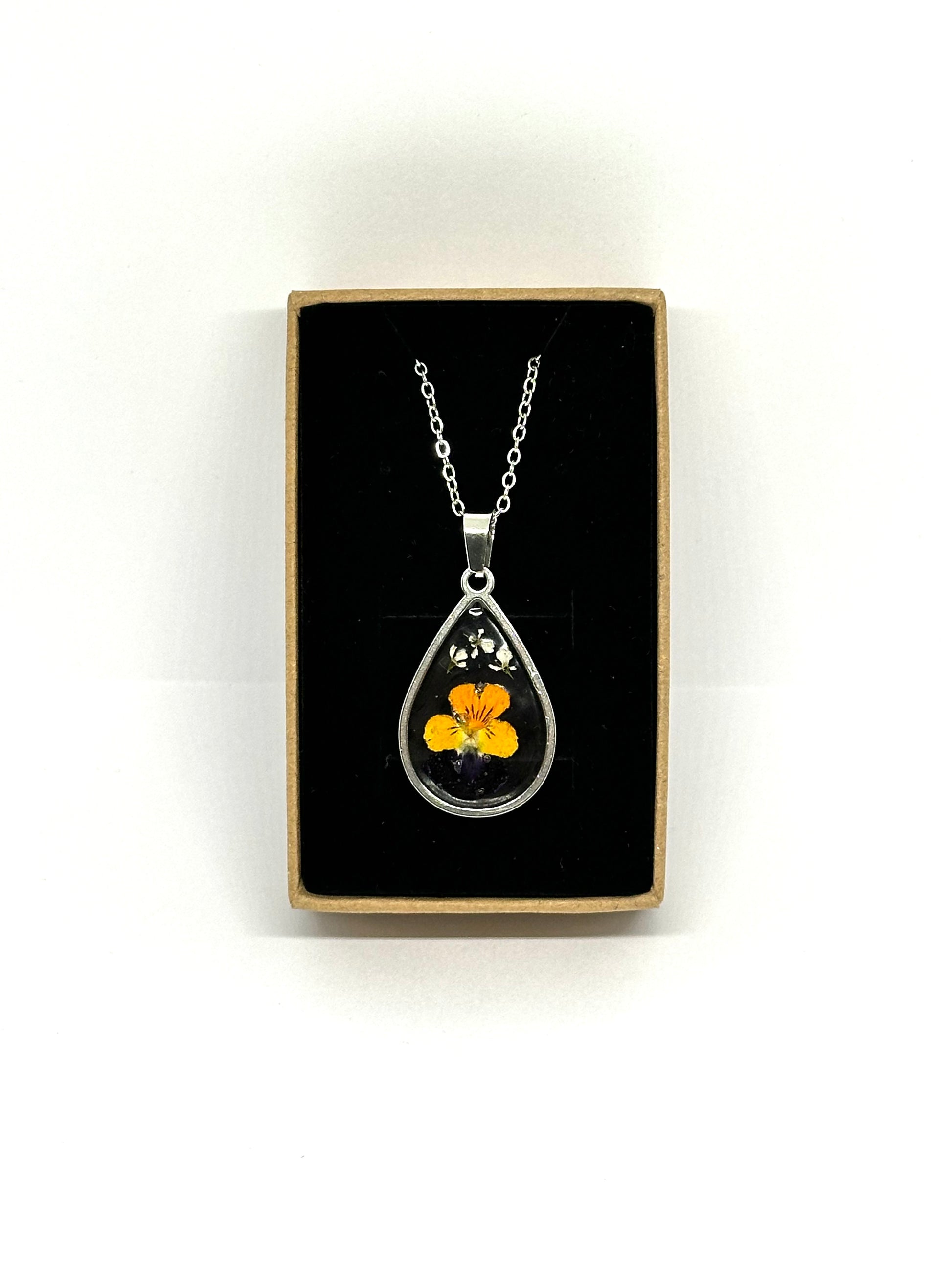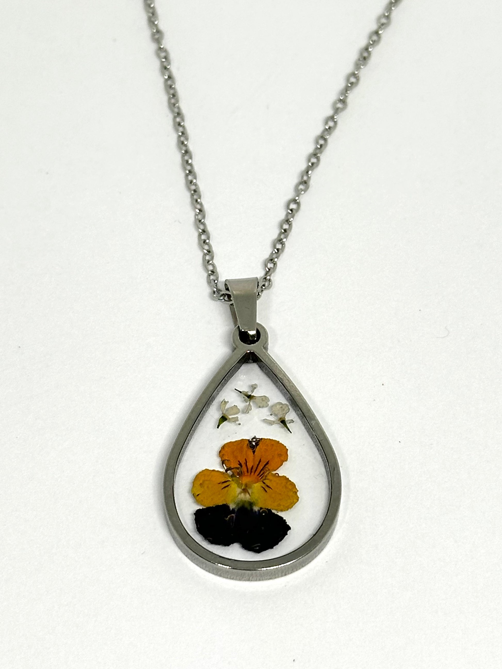 Försilvrat halsband med ett droppformat hänge och en transparent bakgrund. I mitten kombineras en pressad gul pensé med små vita blommor, vilket skapar ett lysande och delikat smycke. Kedjan är tunn och justerbar.