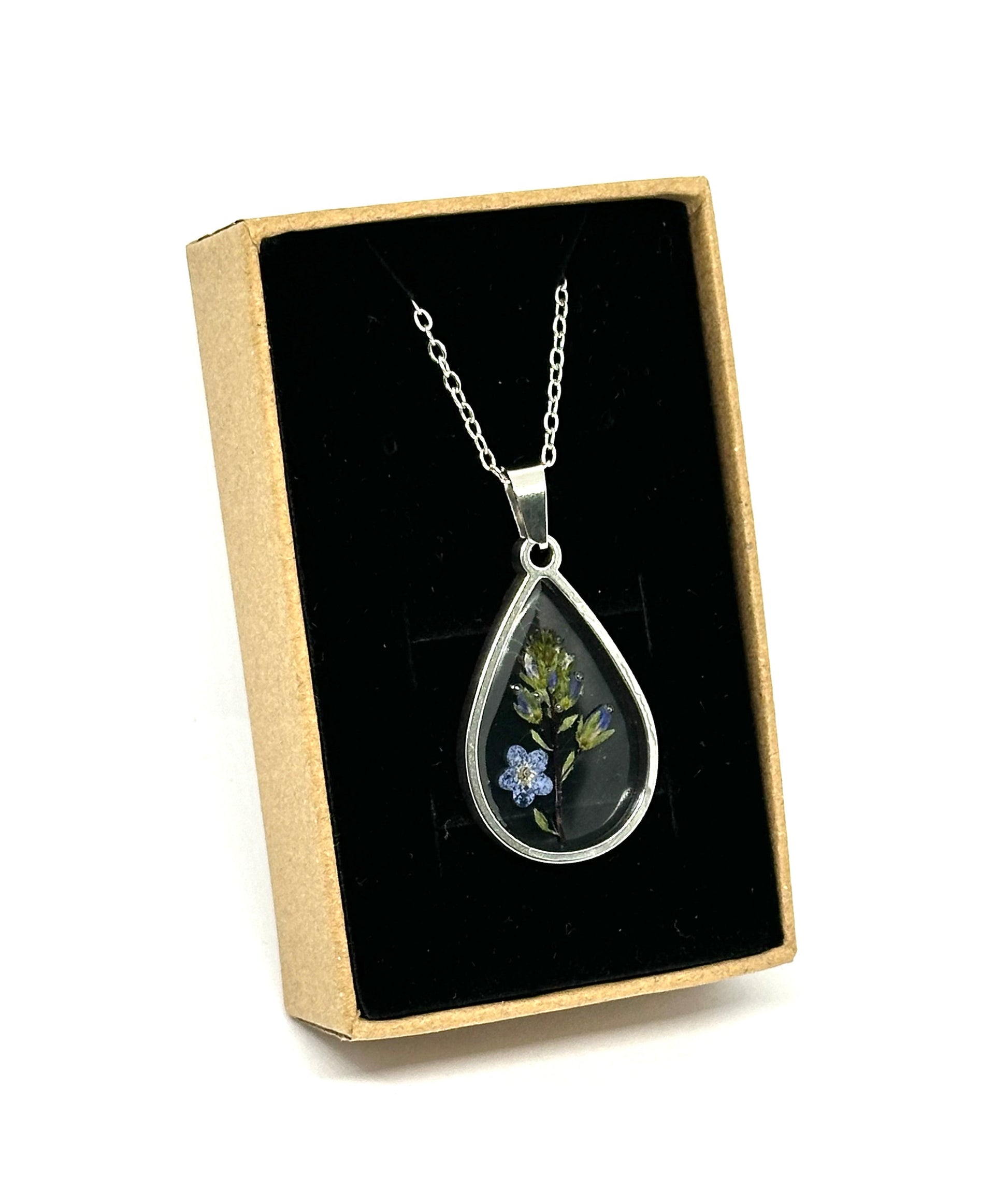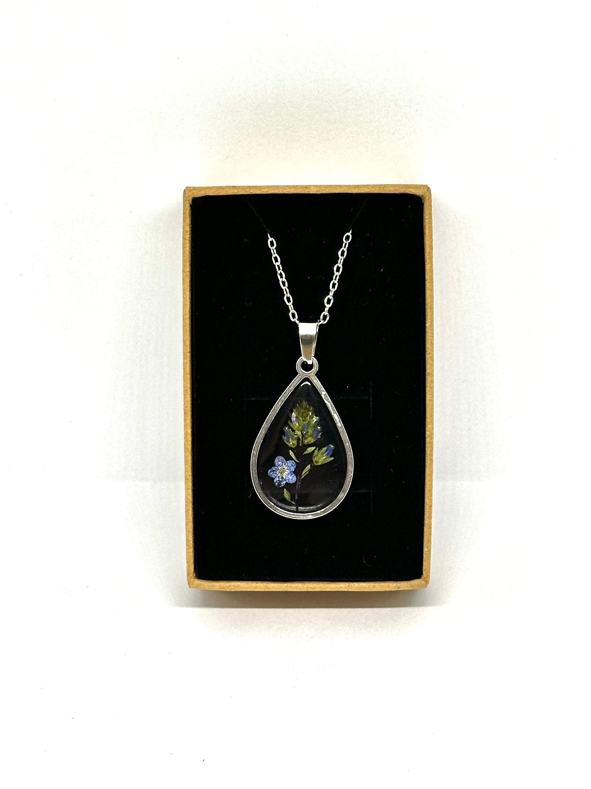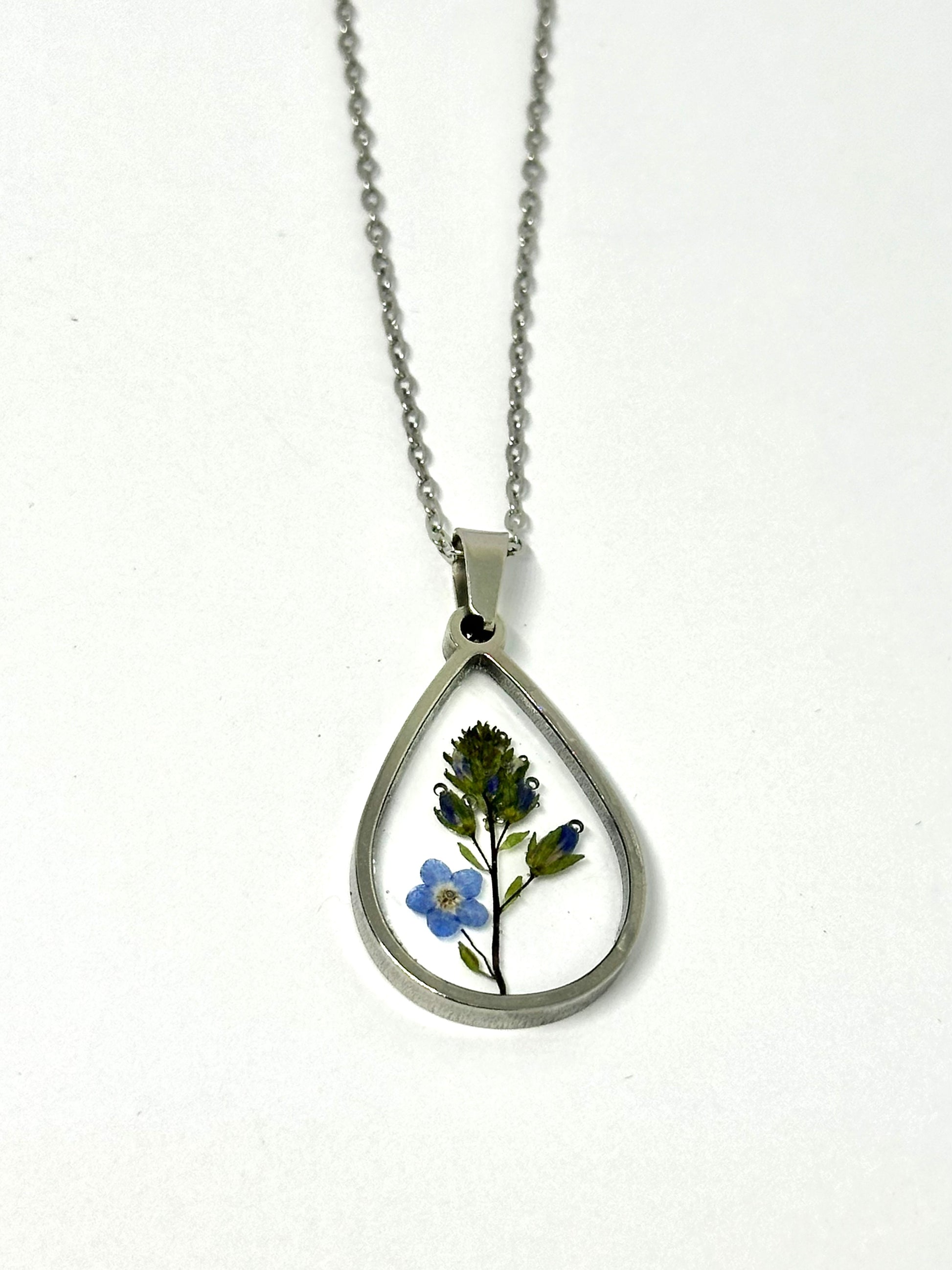 Försilvrat halsband med ett droppformat hänge och en transparent bakgrund. Inuti finns en liten blå förgätmigej-blomma tillsammans med pressade gröna knoppar, vilket bildar en naturlig och delikat komposition. Kedjan är tunn och justerbar.