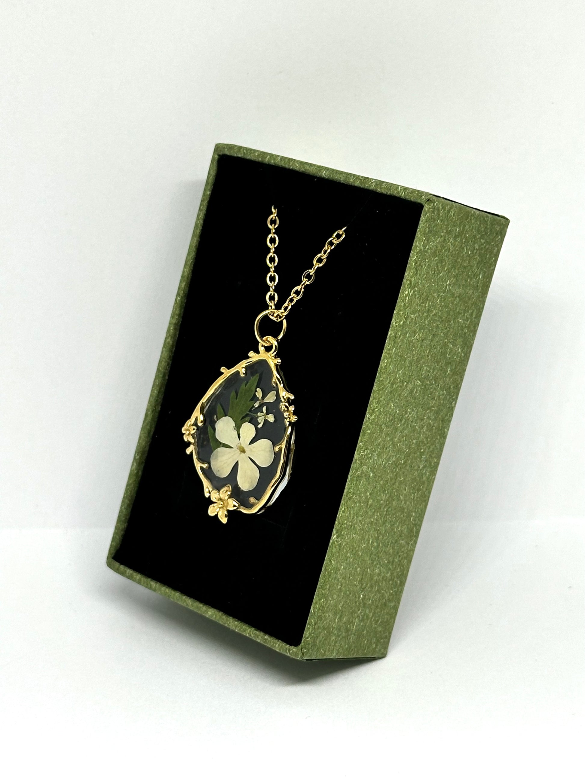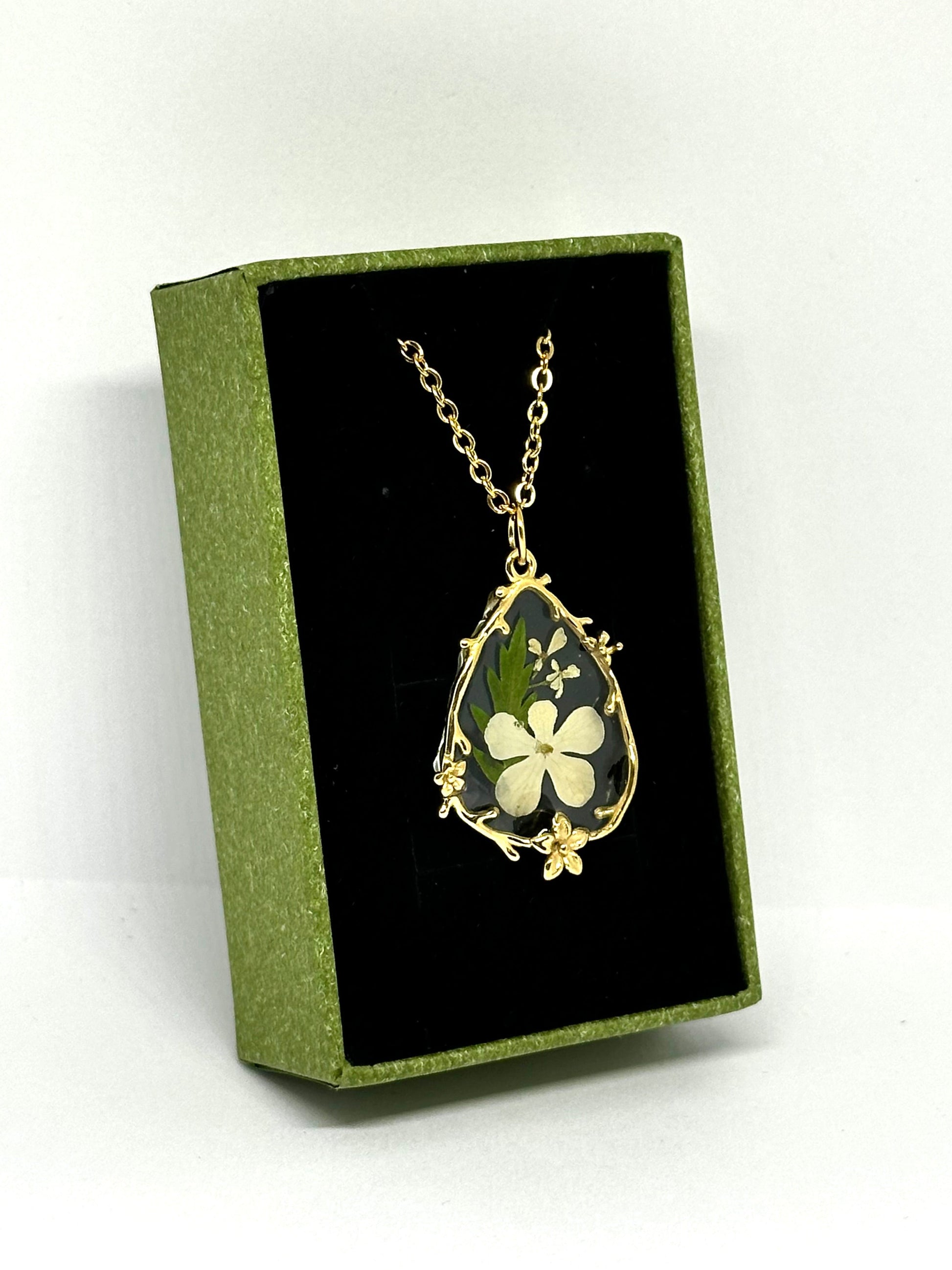 Ett halsband med en guldfärgad bas och ett droppformat hänge med fina blomdetaljer runt kanten. Inuti kombineras en pressad vitklöverblomma med små gröna blommor och blad, vilket skapar ett harmoniskt och lysande smycke med en romantisk och naturlig känsla.
