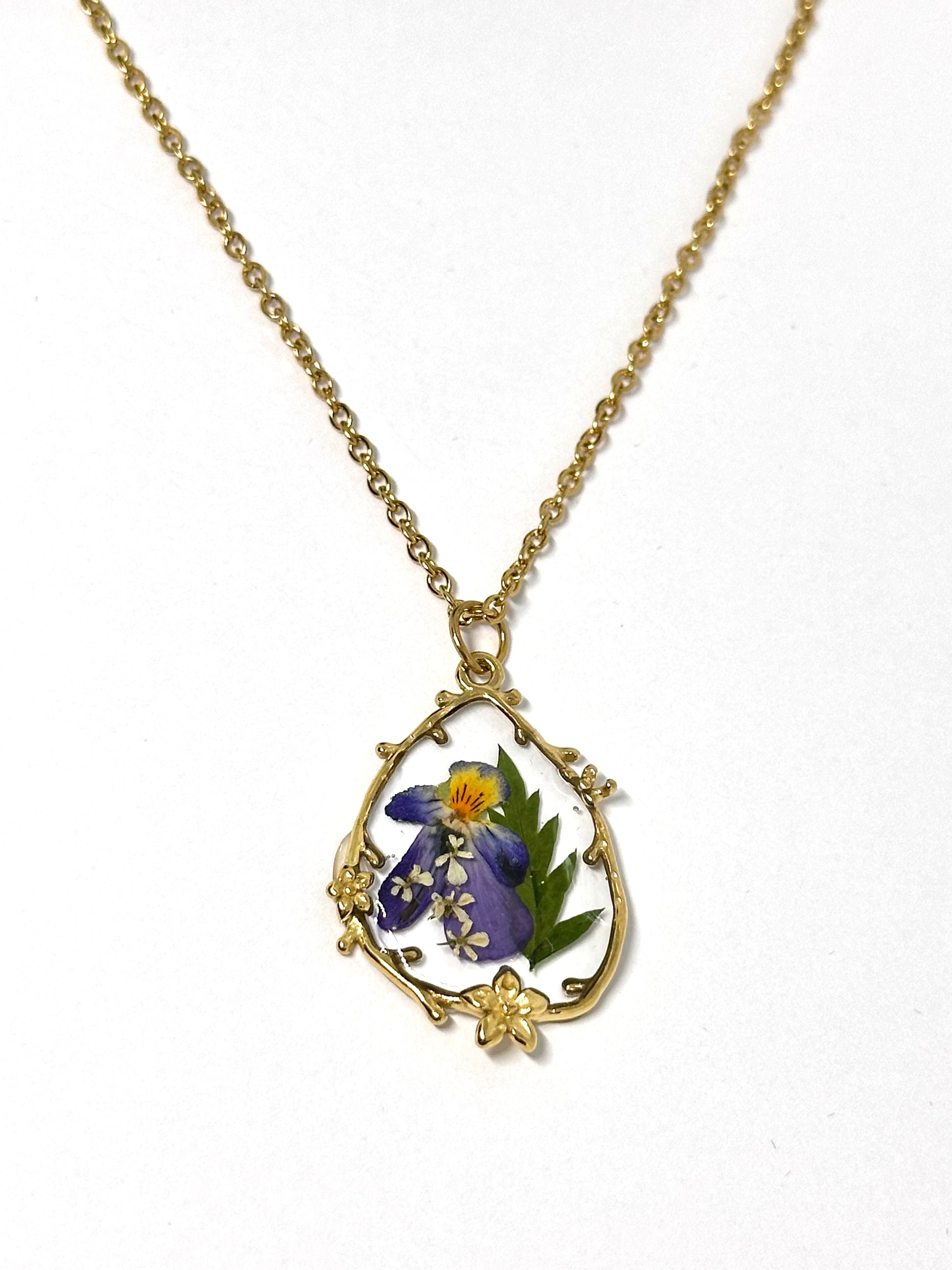 Ett halsband med ett guldfärgat dropphänge och en blommig ram. Inuti skapar en liten lila blomma, tillsammans med gröna blad och fina vita blommor, en naturlig och elegant komposition.