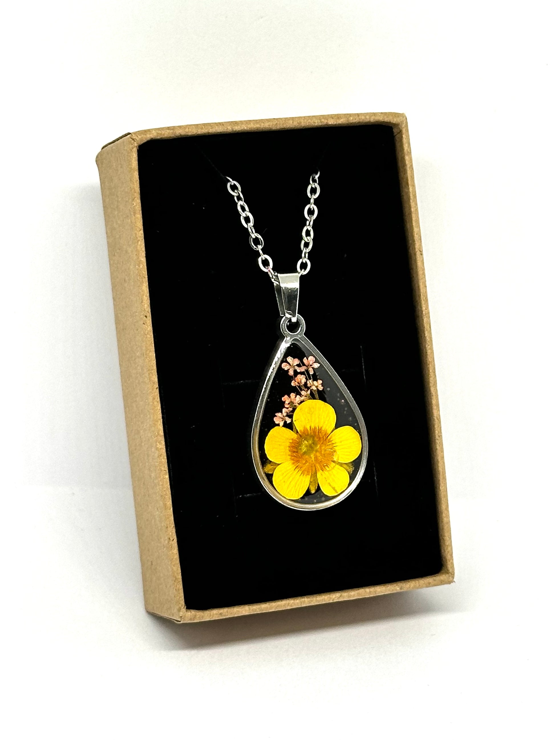 Försilvrat halsband med ett droppformat hänge och svart bakgrund. Inuti finns en pressad gul smörblomma som åtföljs av små rosa blommor, vilket skapar en lysande och naturlig kontrast. Kedjan är tunn och justerbar.