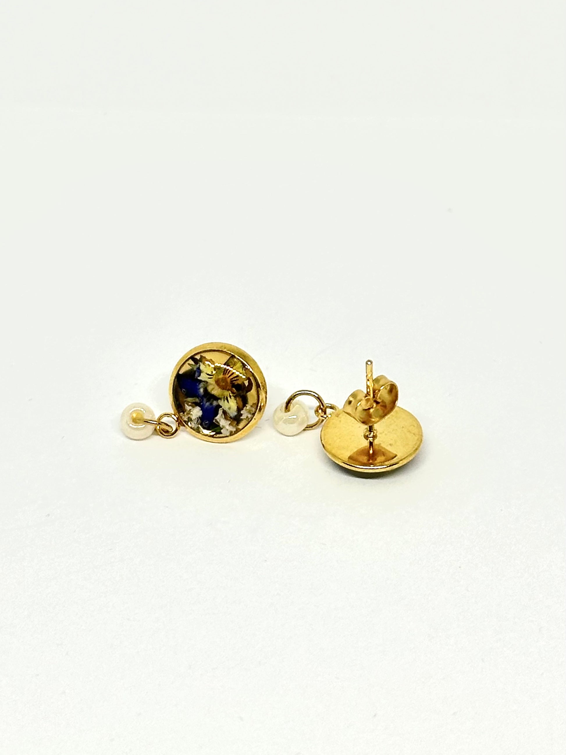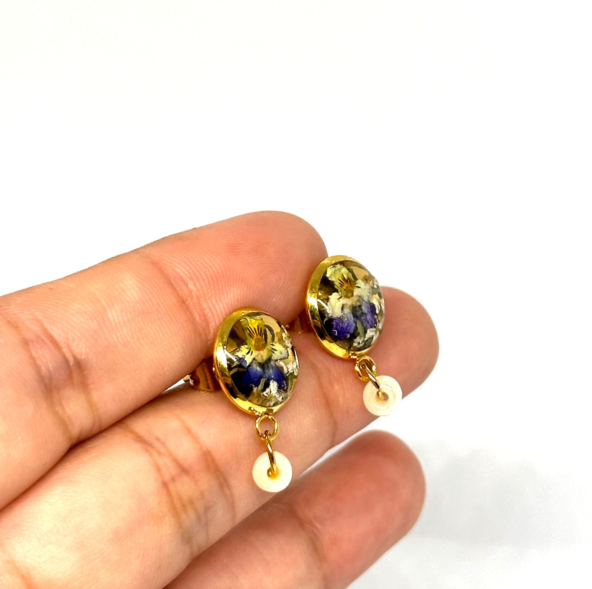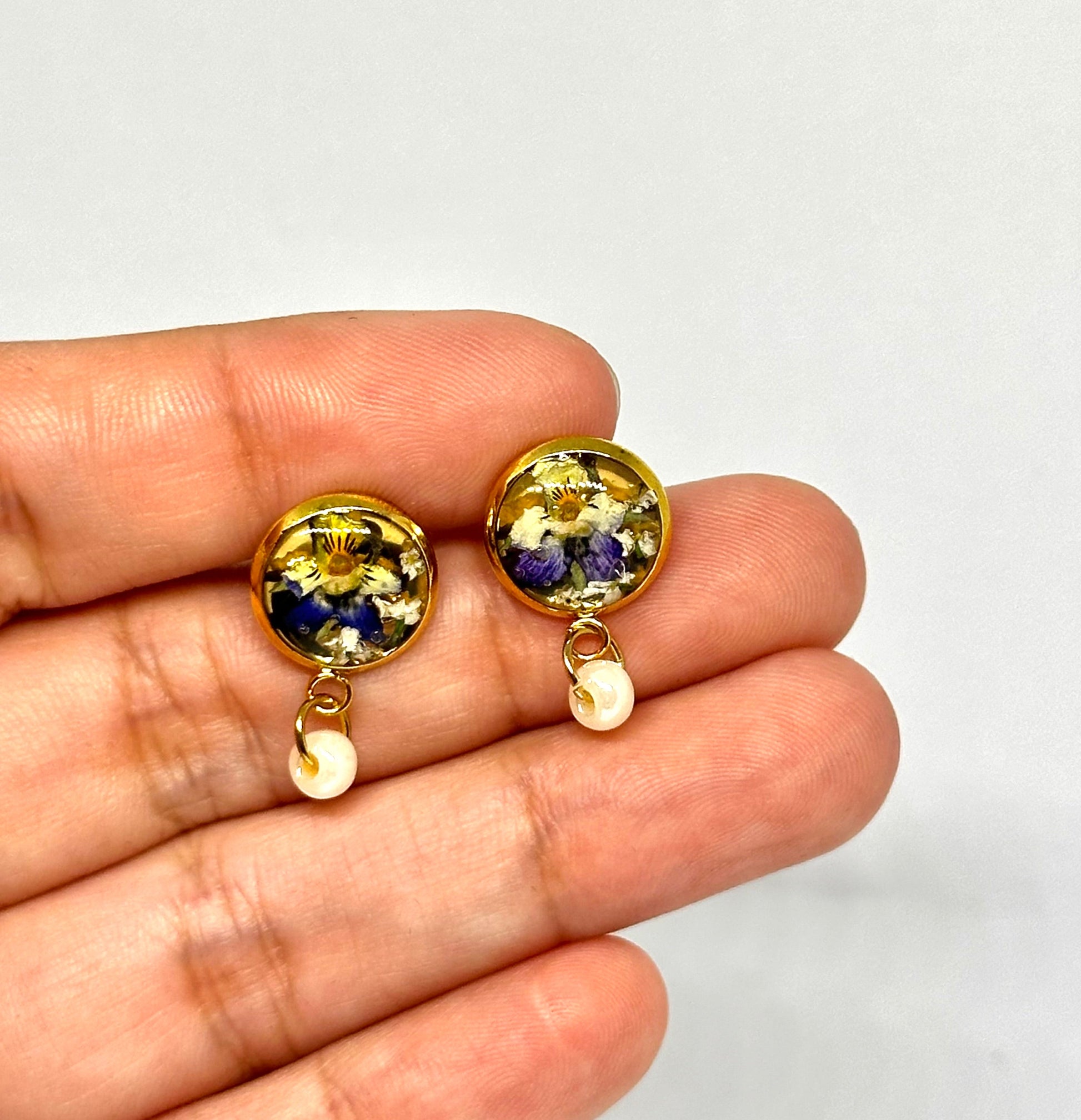 Guldfärgade örhängen med fjärilsstängning. Inuti kombineras en penséblomma i violetta och gula nyanser med små naturliga vita blommor. Ett fint pärlliknande hänge ger rörelse och en elegant touch till designen.
