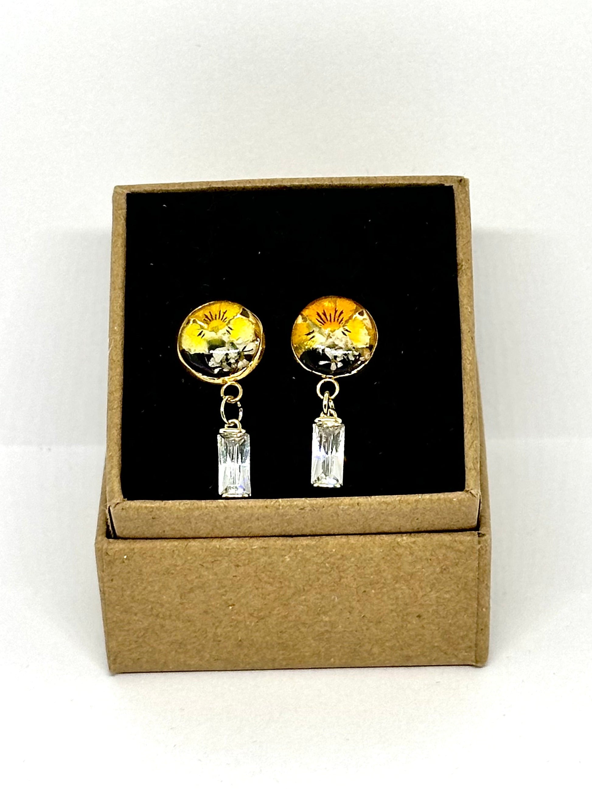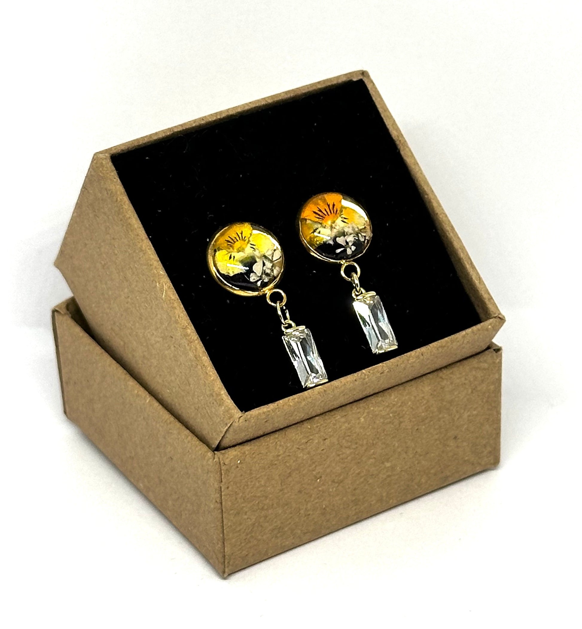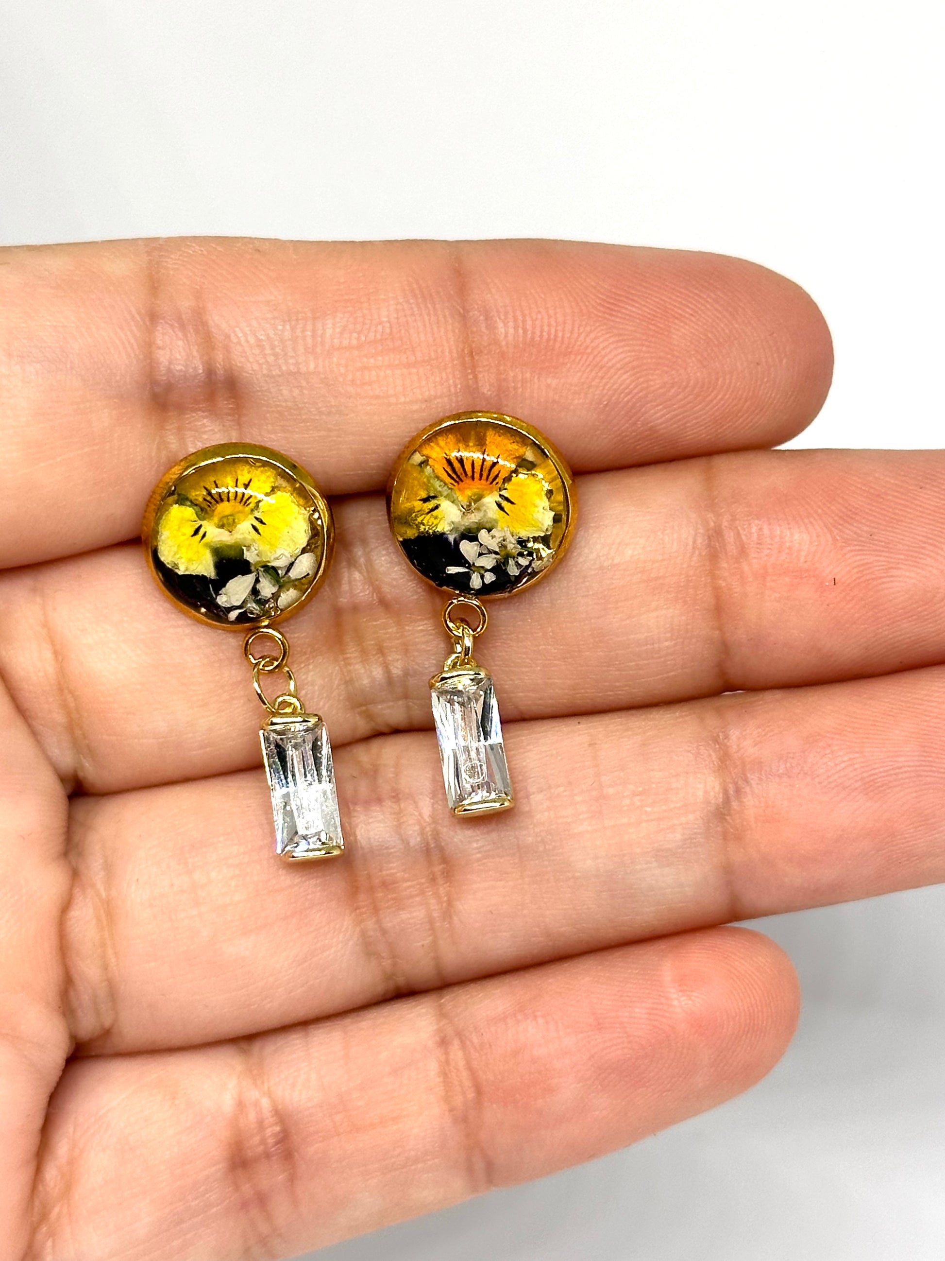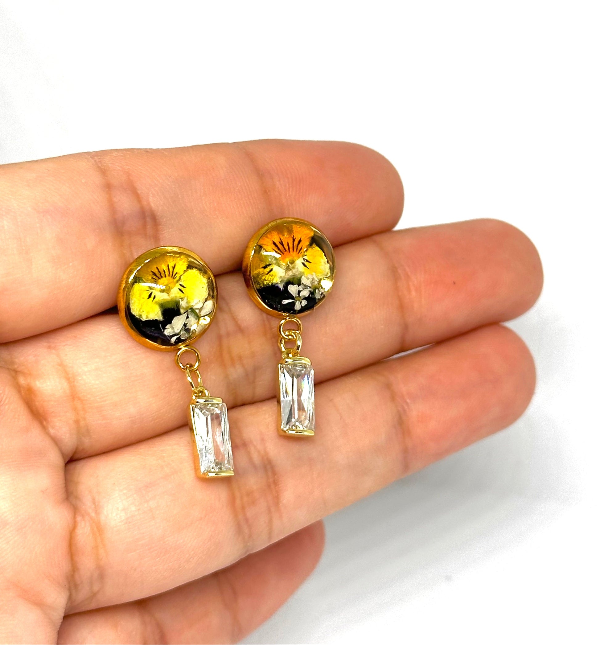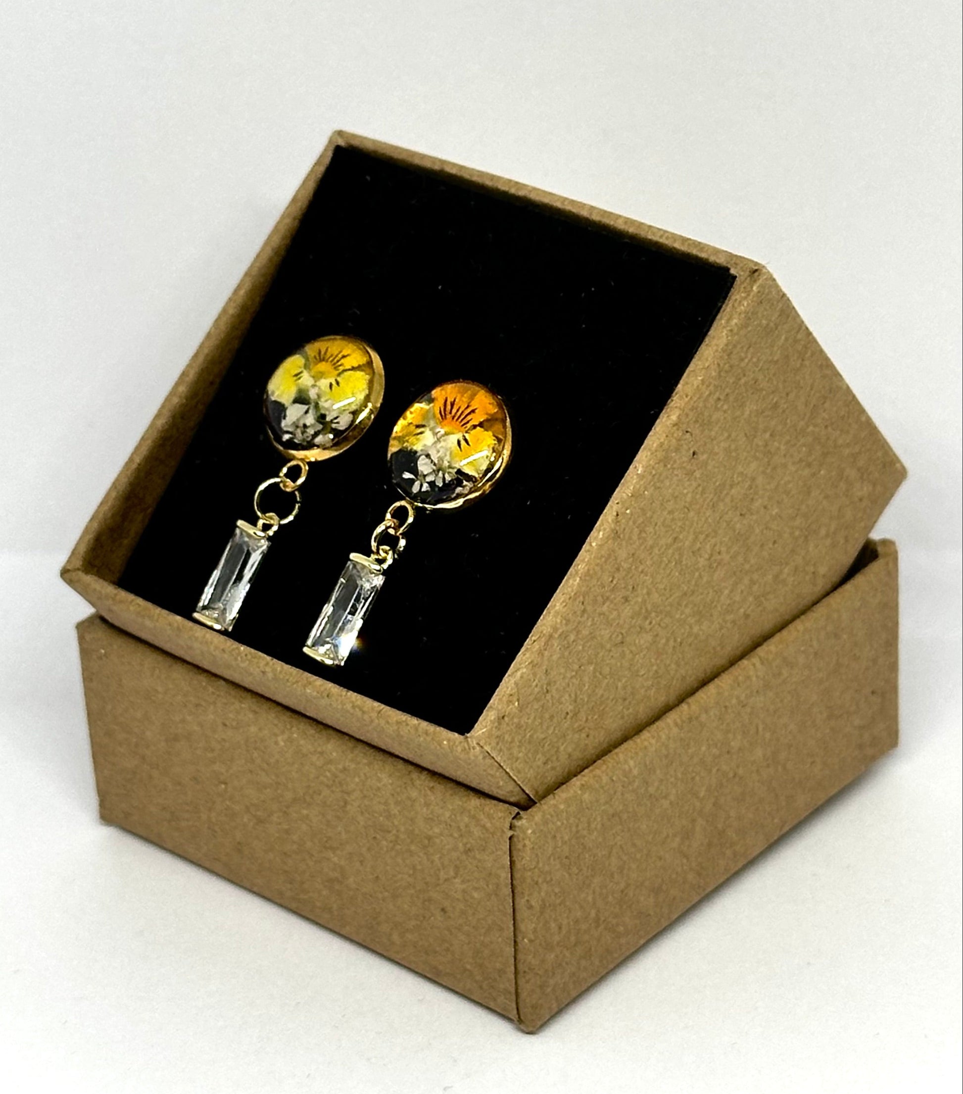 Örhängen med guldfärgad bas och fjärilsknäppning. Inuti sticker en liten penséblomma i gula och violetta nyanser ut mot den transparenta bakgrunden. Varje örhänge kompletteras av ett rektangulärt kristallhänge som ger en delikat och lysande touch.