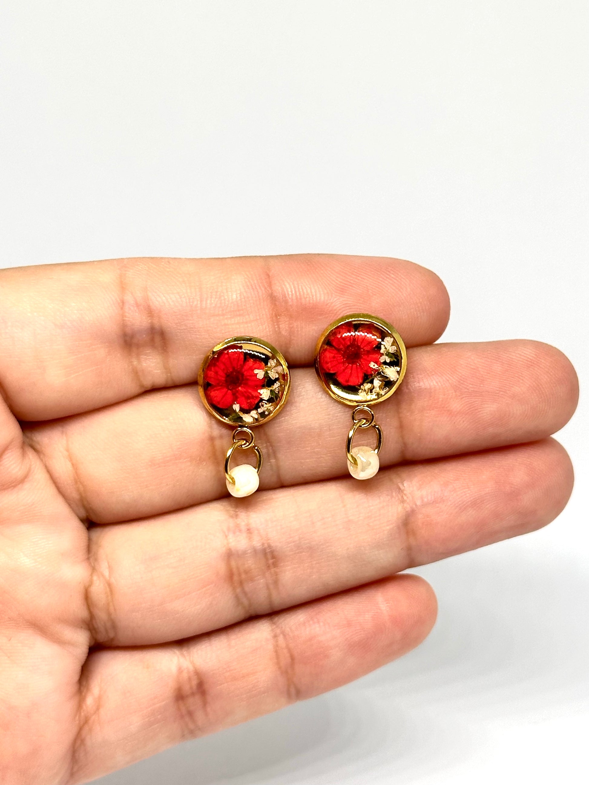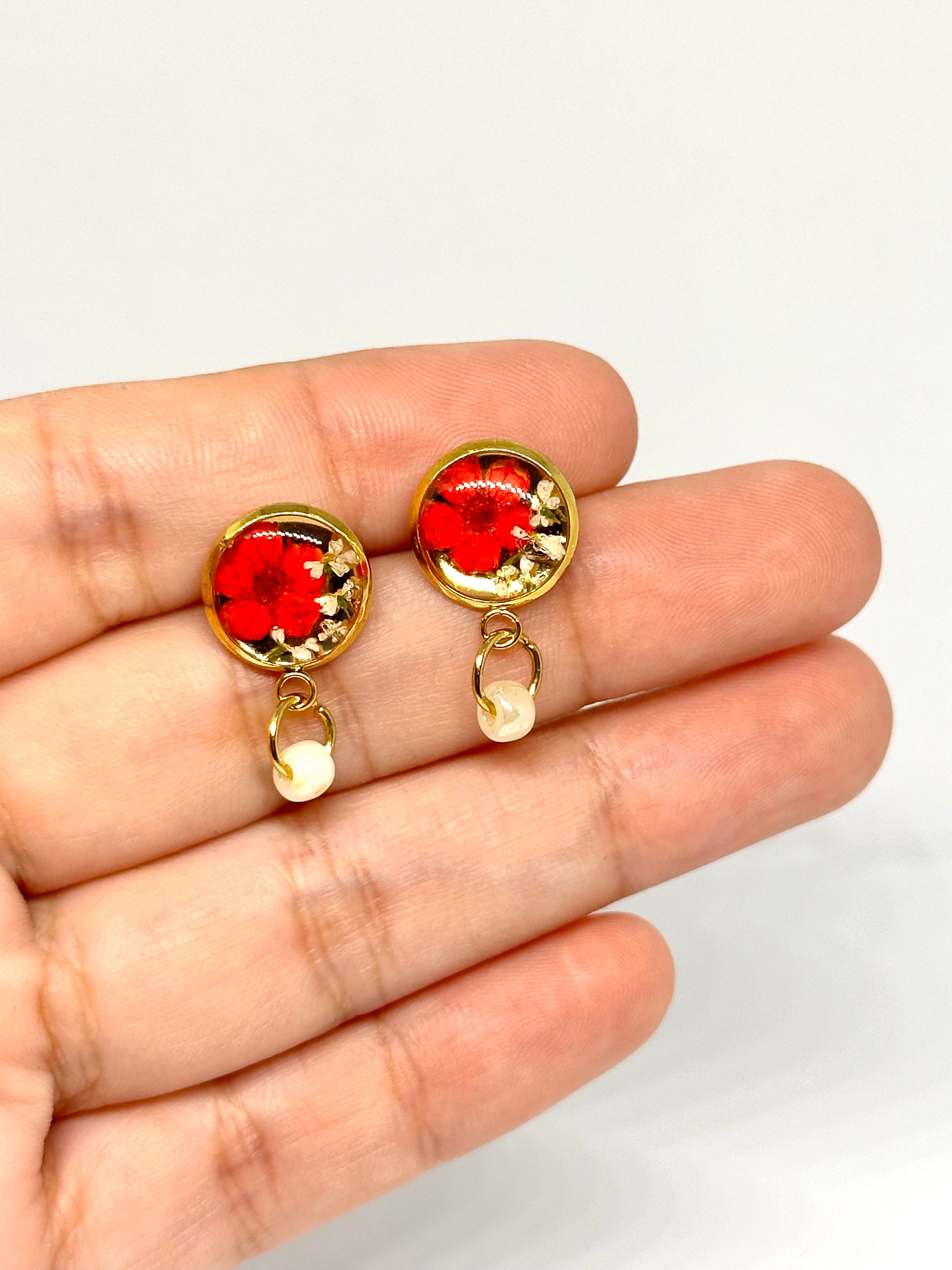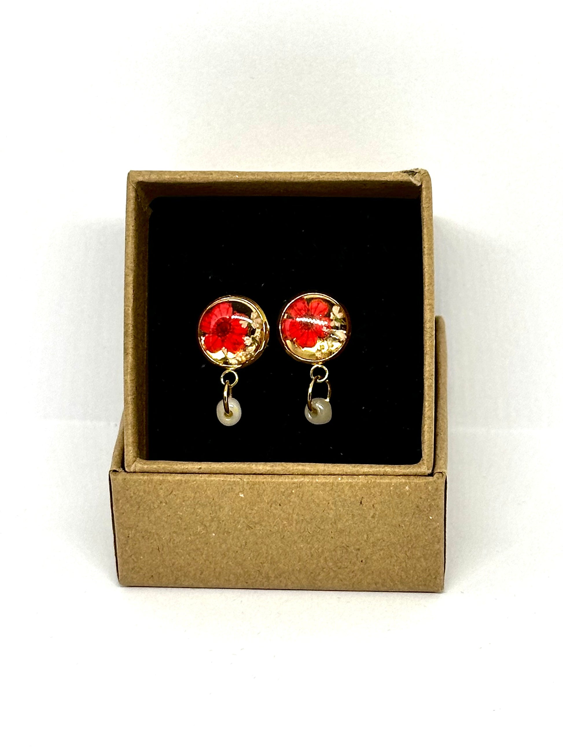 Guldfärgade örhängen med fjärilsspännen. Inuti kombineras en handtonad veronicablomma i djupröd färg med delikata vita morotsblommor, vilket skapar en naturlig och harmonisk kontrast. En liten pärlliknande pärla dinglar mjukt och ger en touch av rörelse och elegans.