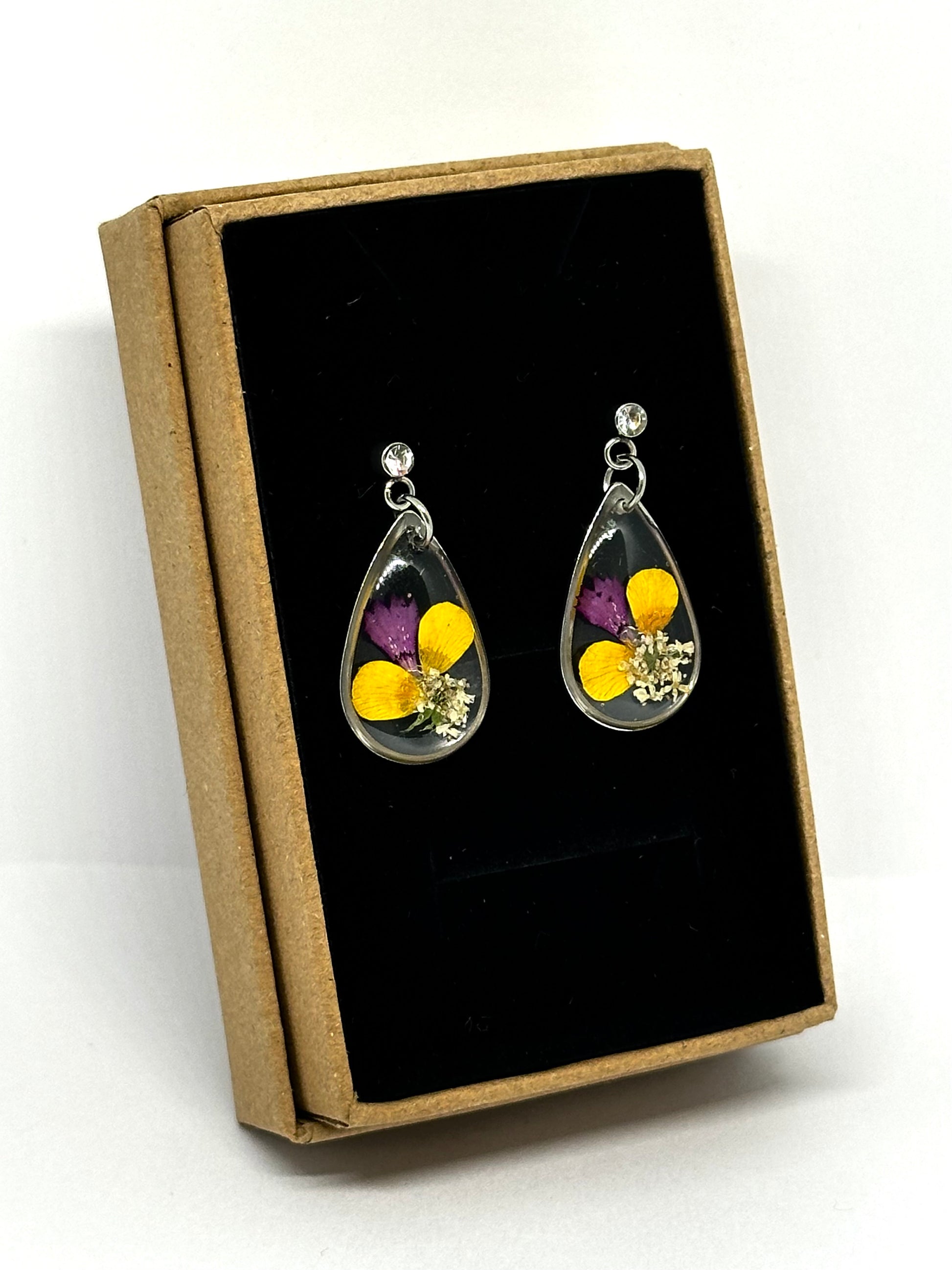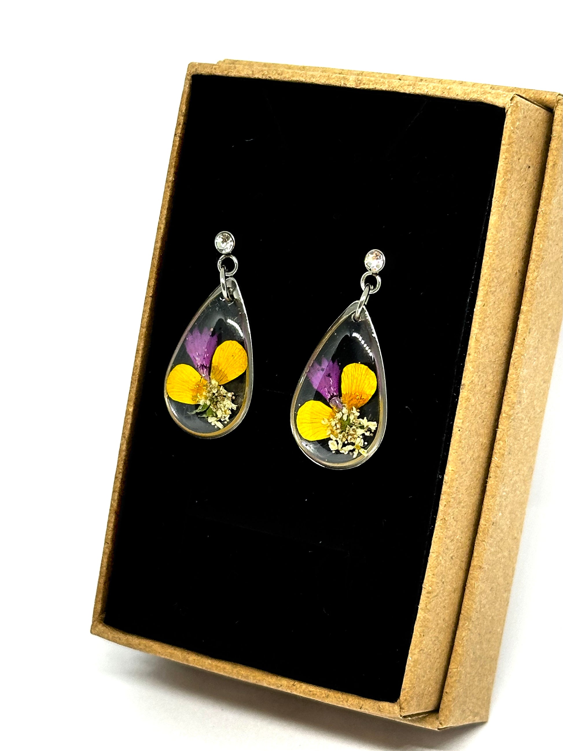 Silverfärgade örhängen med droppmönster och transparent bakgrund. Inuti kombineras gula smörblommablad och lilla mininejlikor med små vita blommor, vilket skapar en glad och harmonisk komposition.