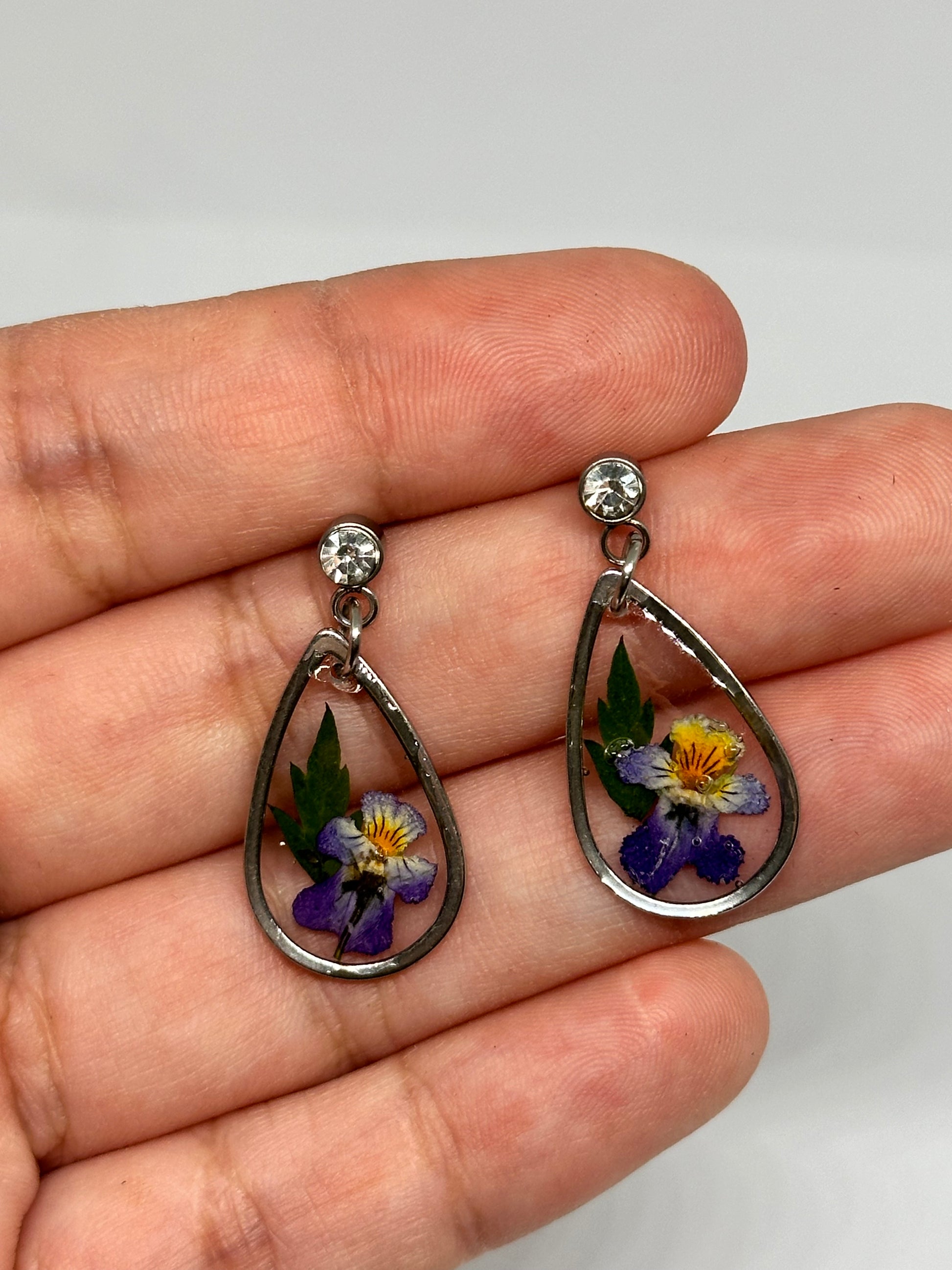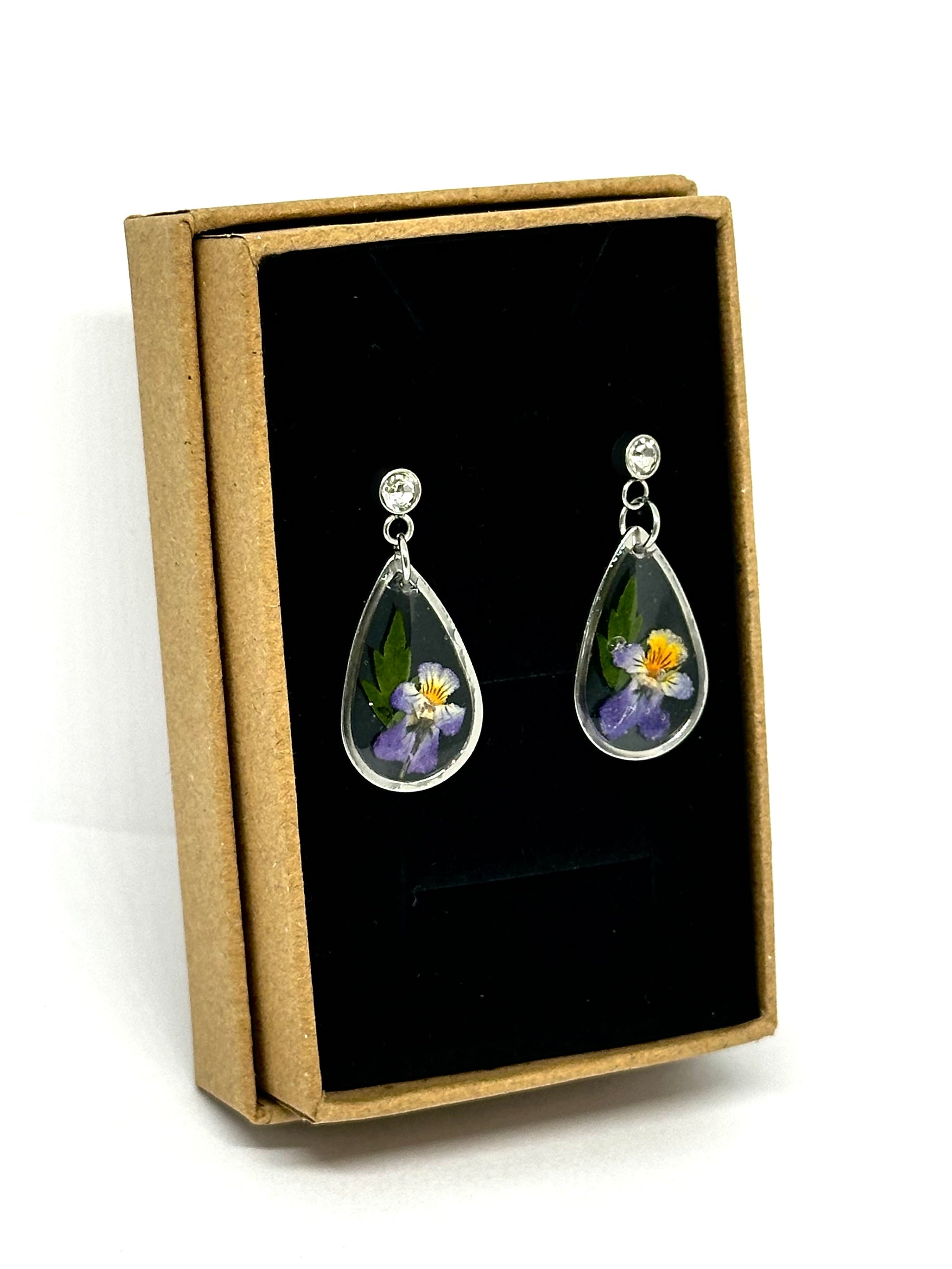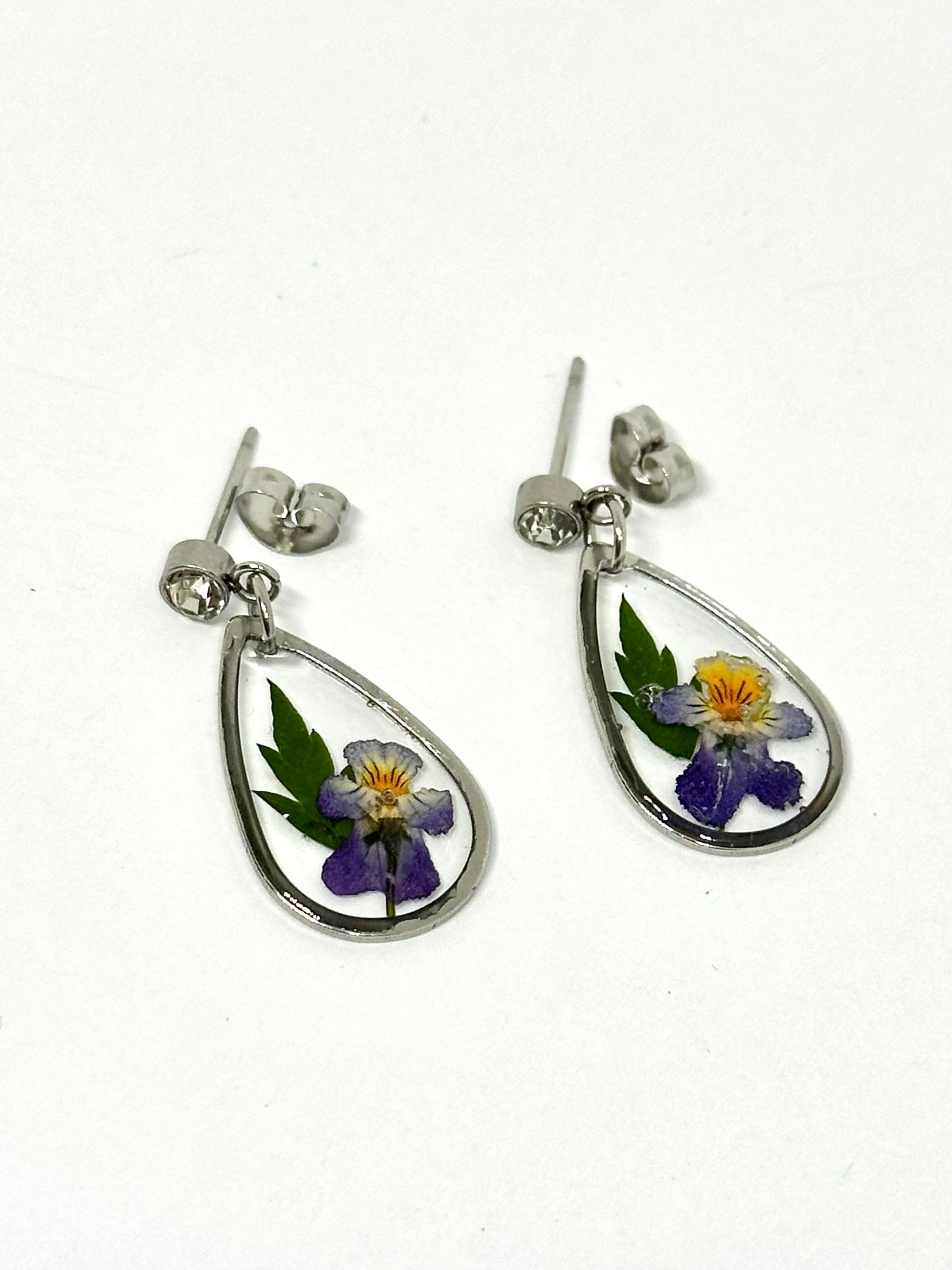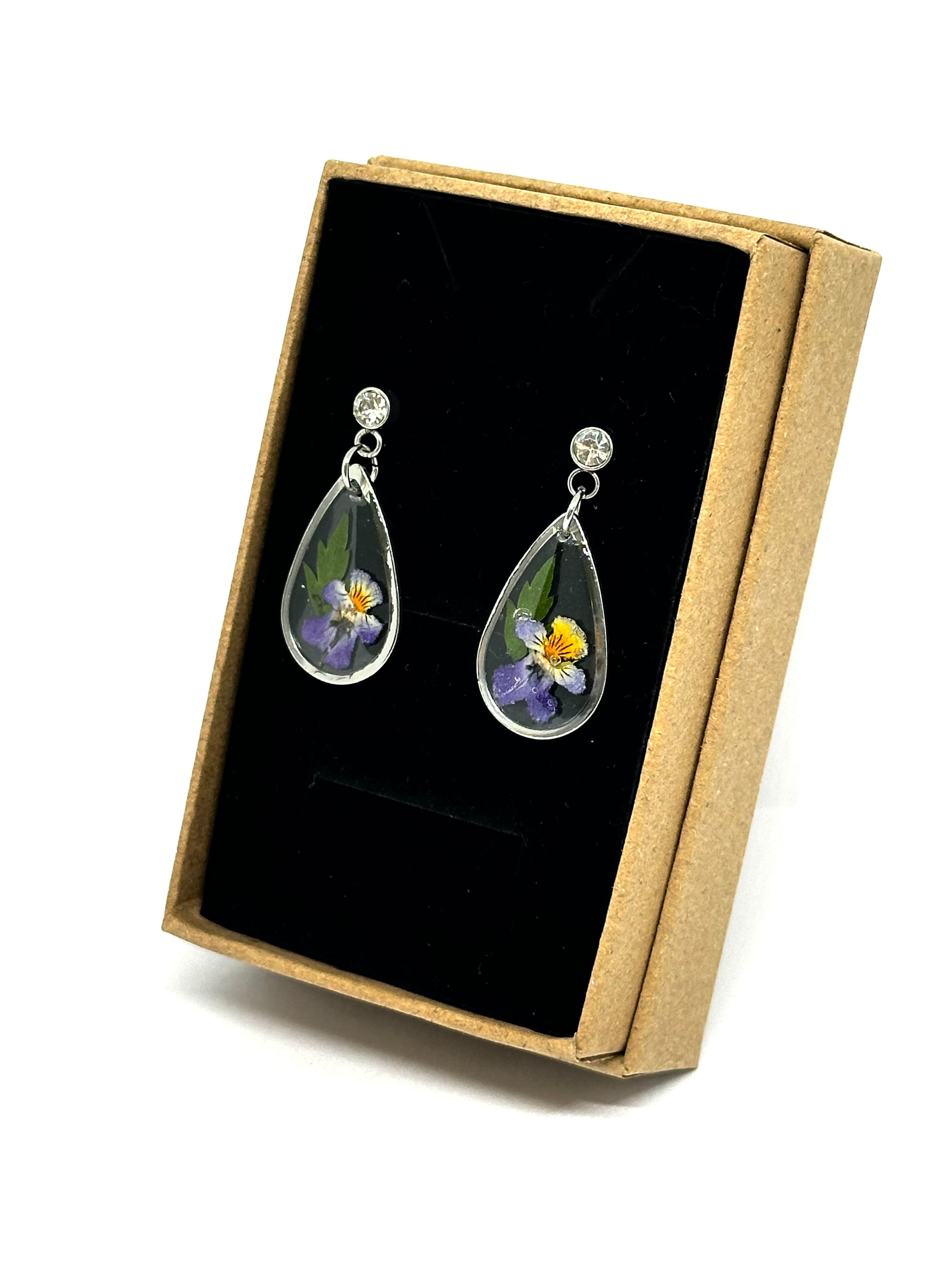 Försilvrade droppformade örhängen med transparent baksida. Inuti kombineras pressade minivioler med små gröna blad, vilket skapar en delikat och naturlig komposition.