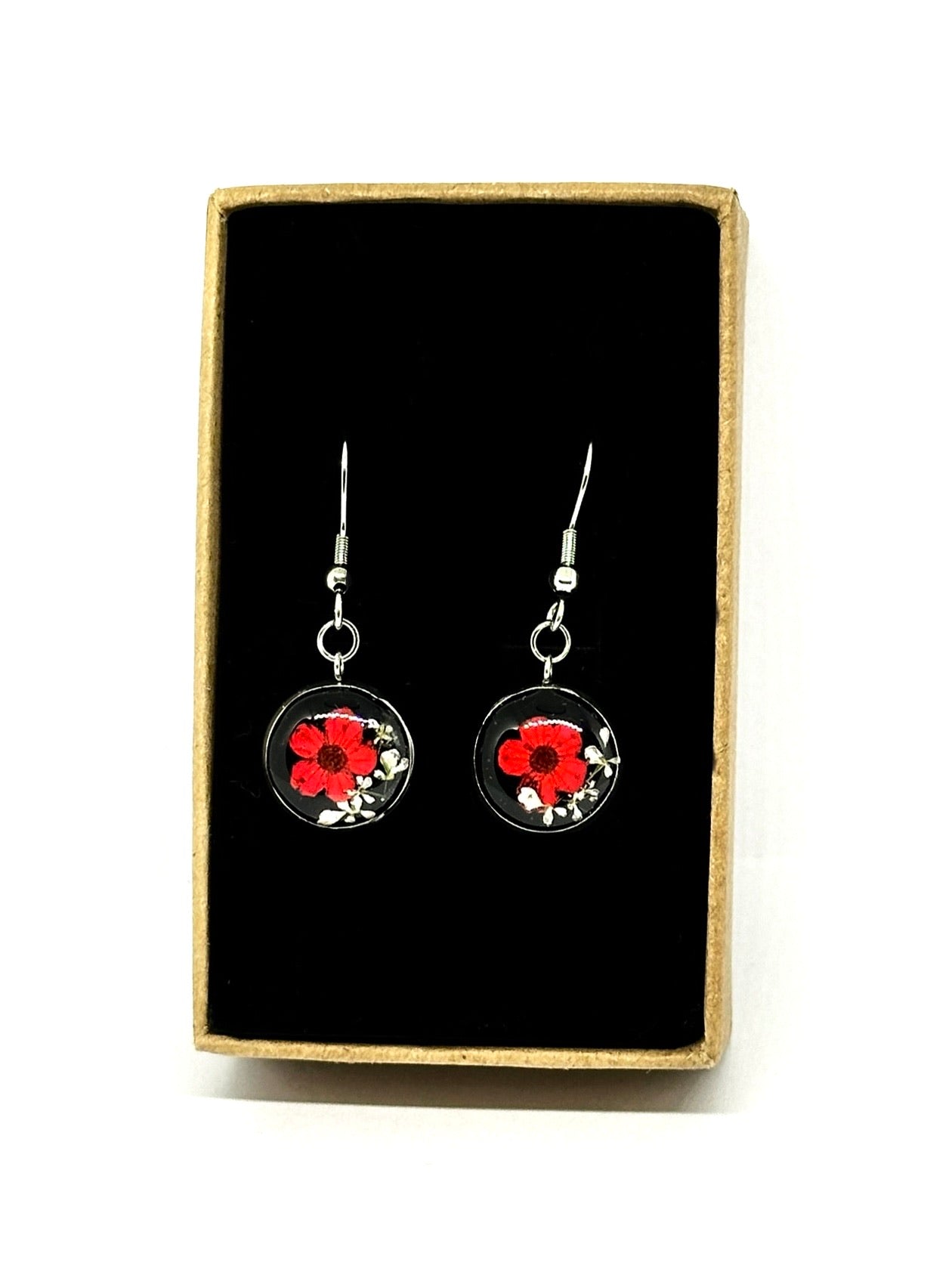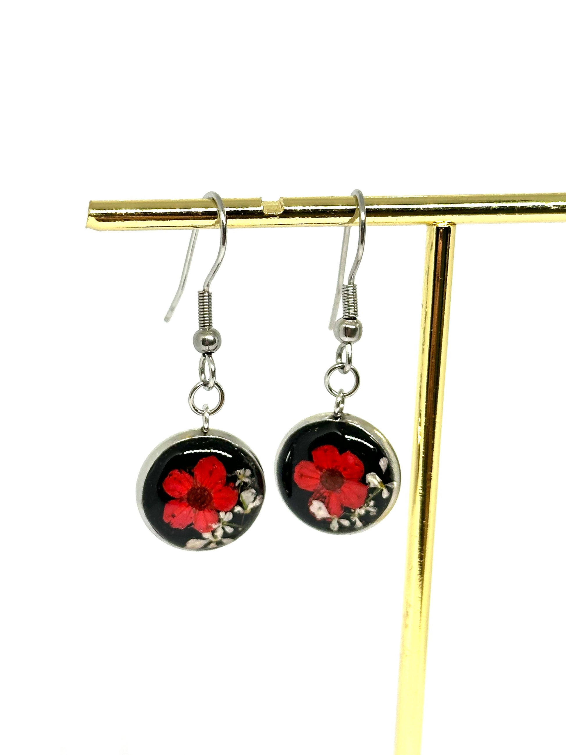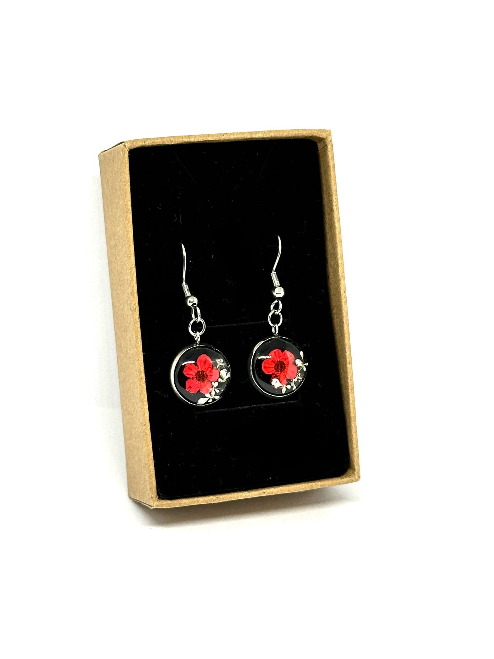 Runda örhängen i rostfritt stål med svart bakgrund, som inkapslar en veronicablomma i en intensiv röd nyans, ackompanjerade av små vita vildblommor. En slående och harmonisk design som framhäver kontrasten mellan naturliga färger.