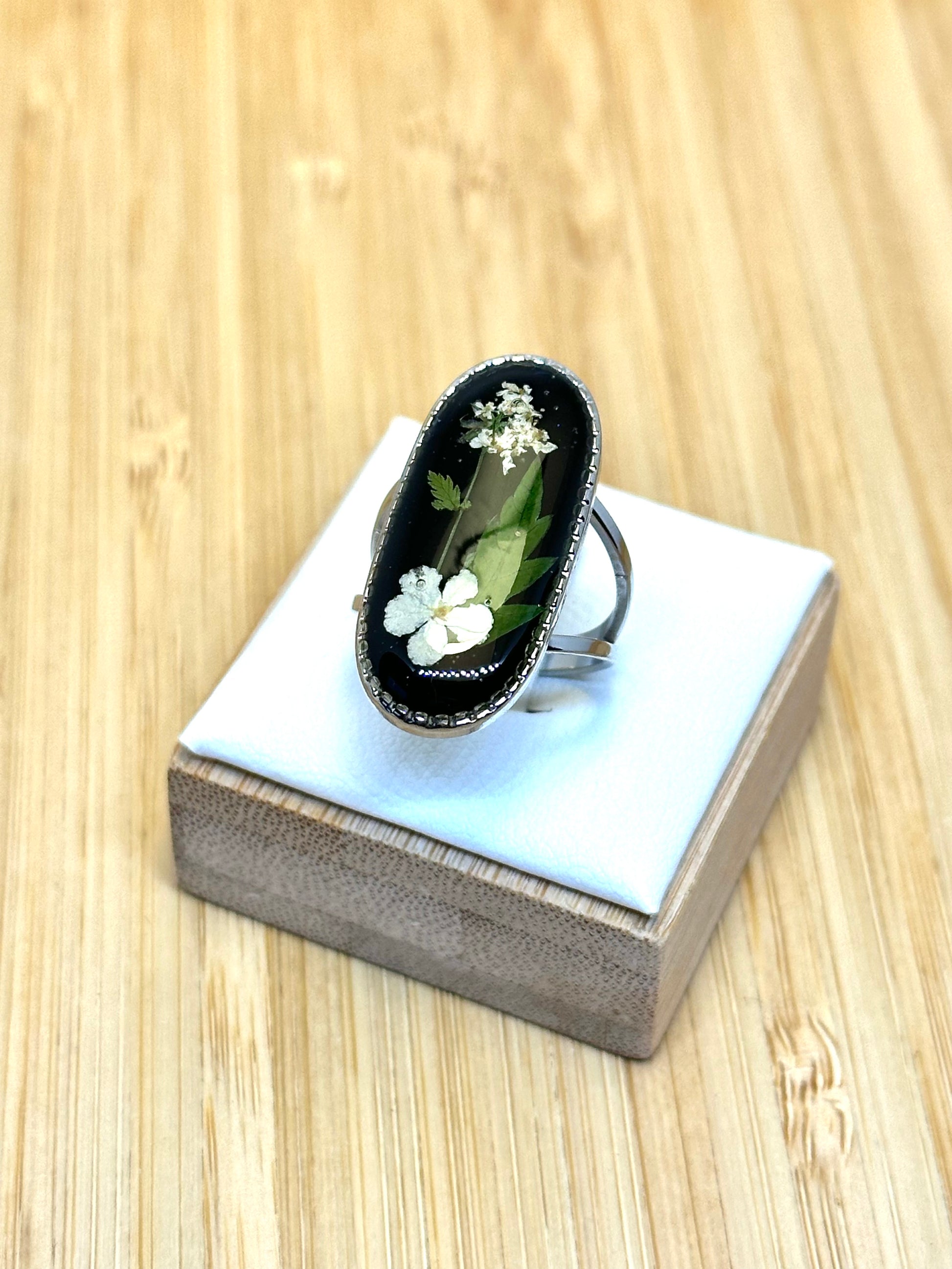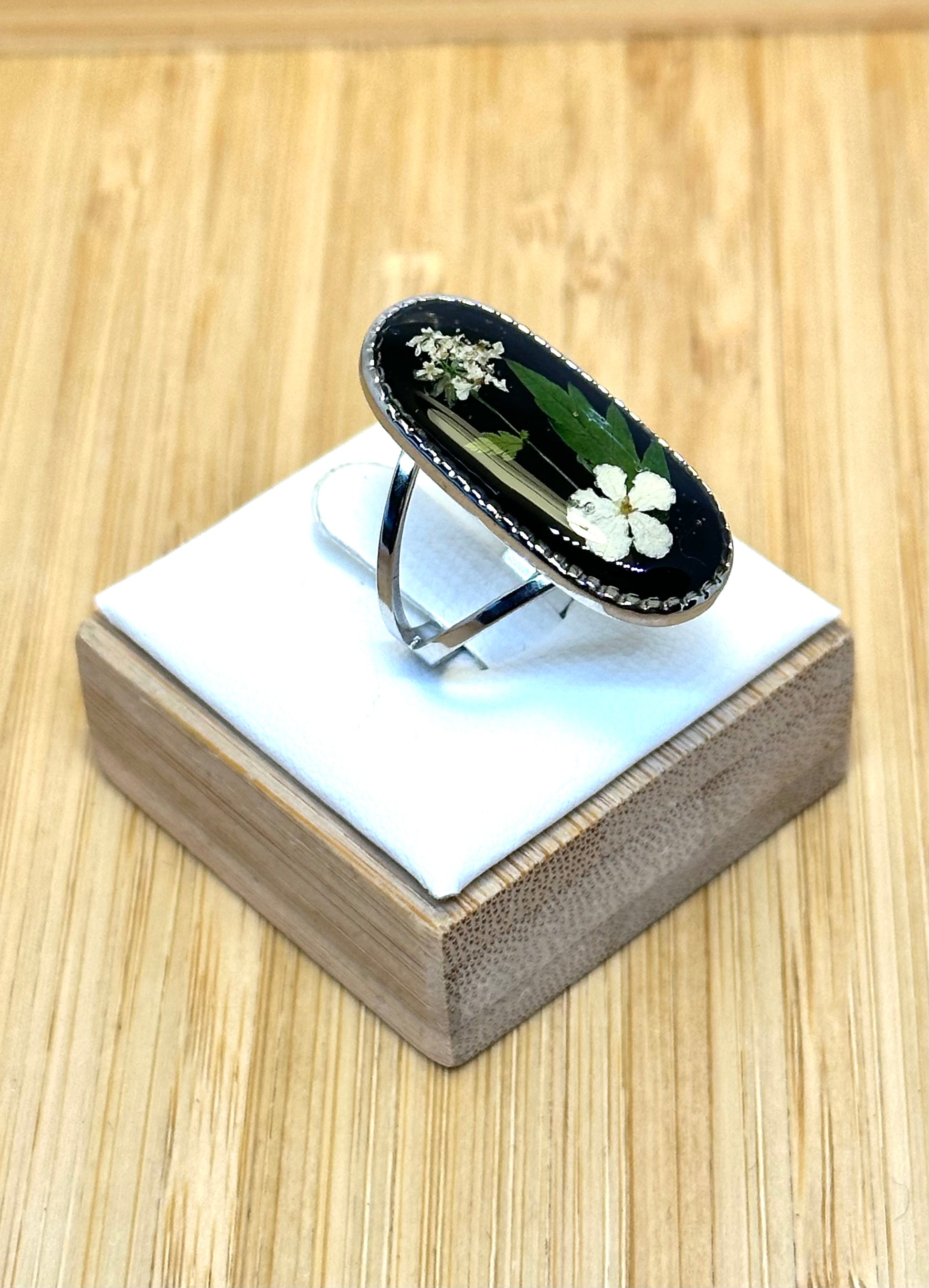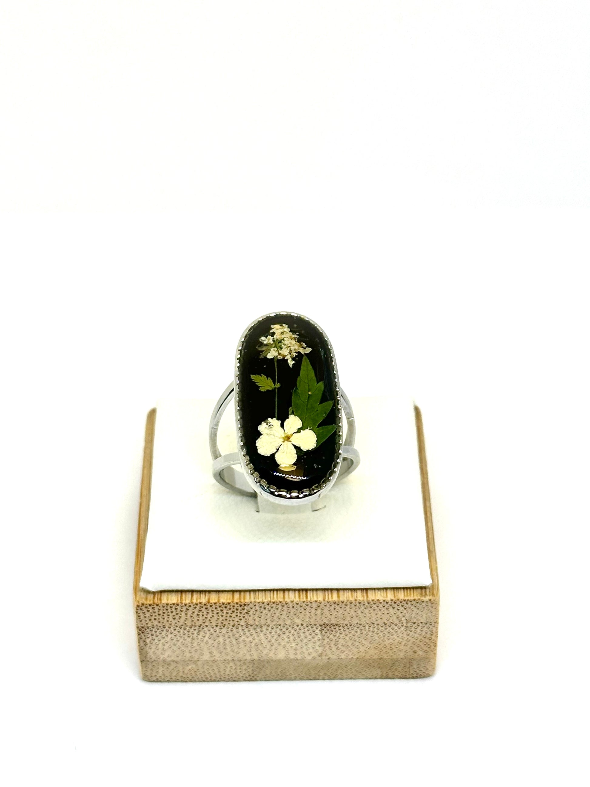 Justerbar ring i silverfärgat rostfritt stål med en långsträckt oval form. Inuti, mot en djupsvart bakgrund, finns en liten vitklöverblomma åtföljd av volangstjälkar och gröna blad.