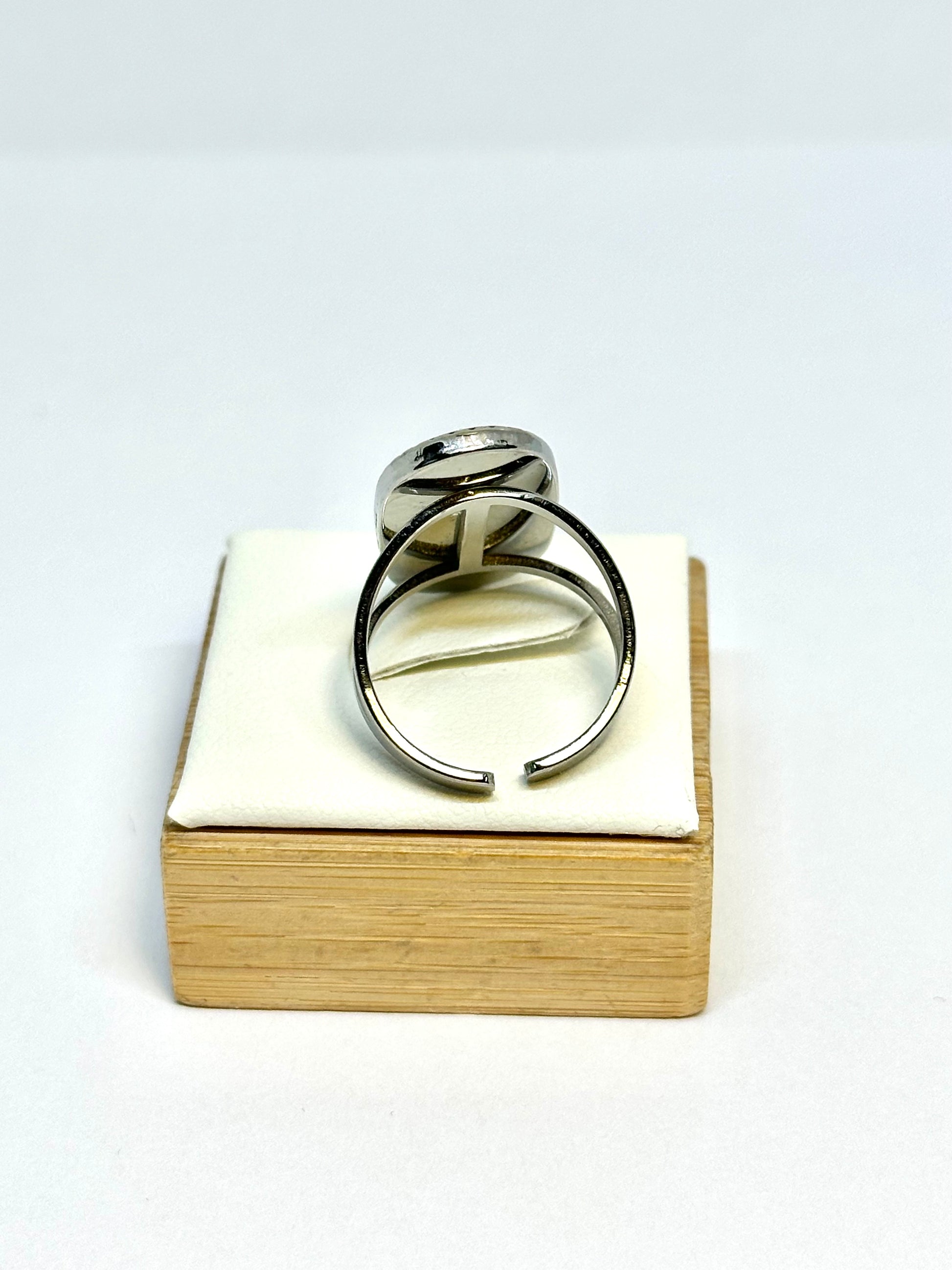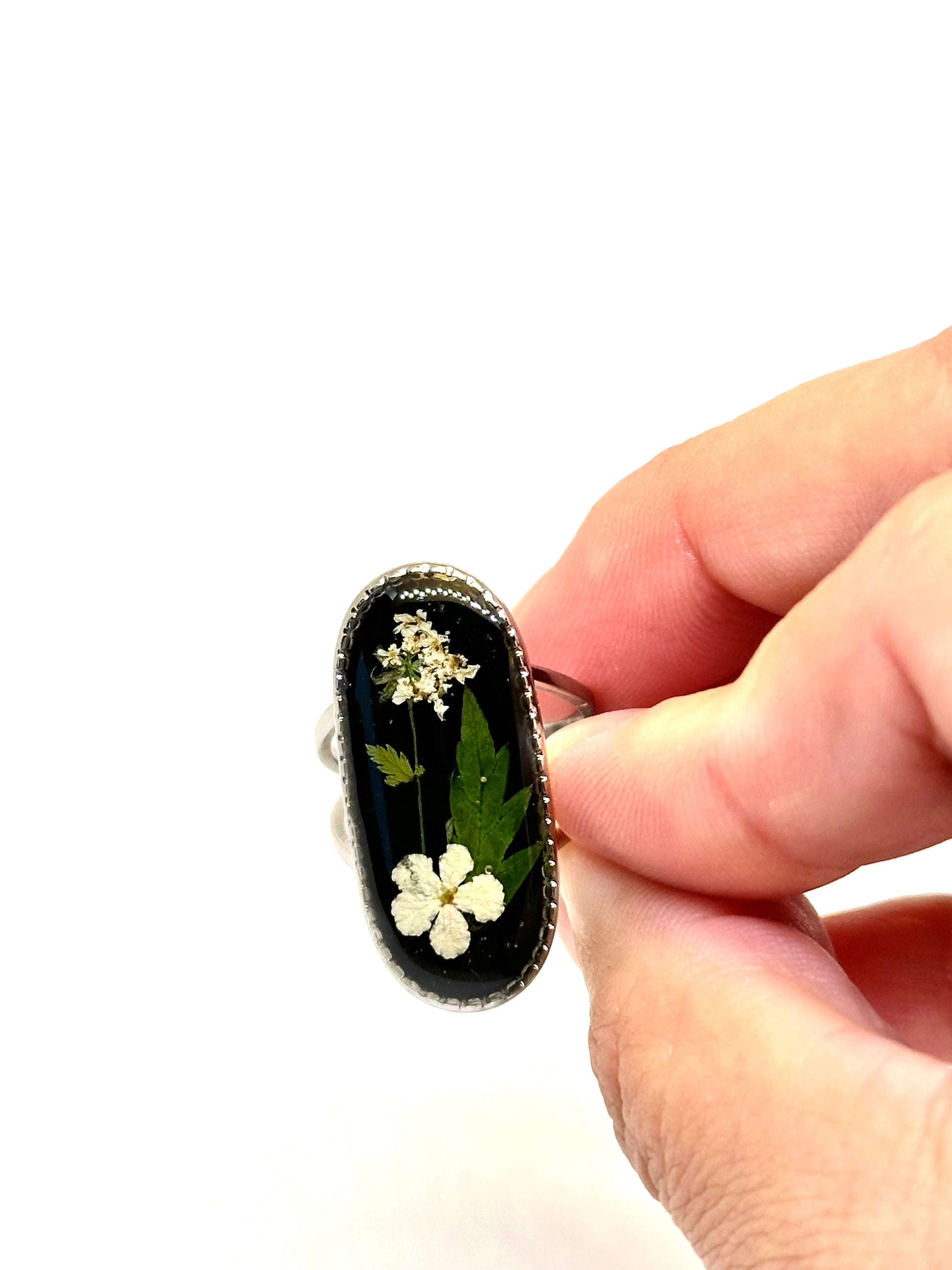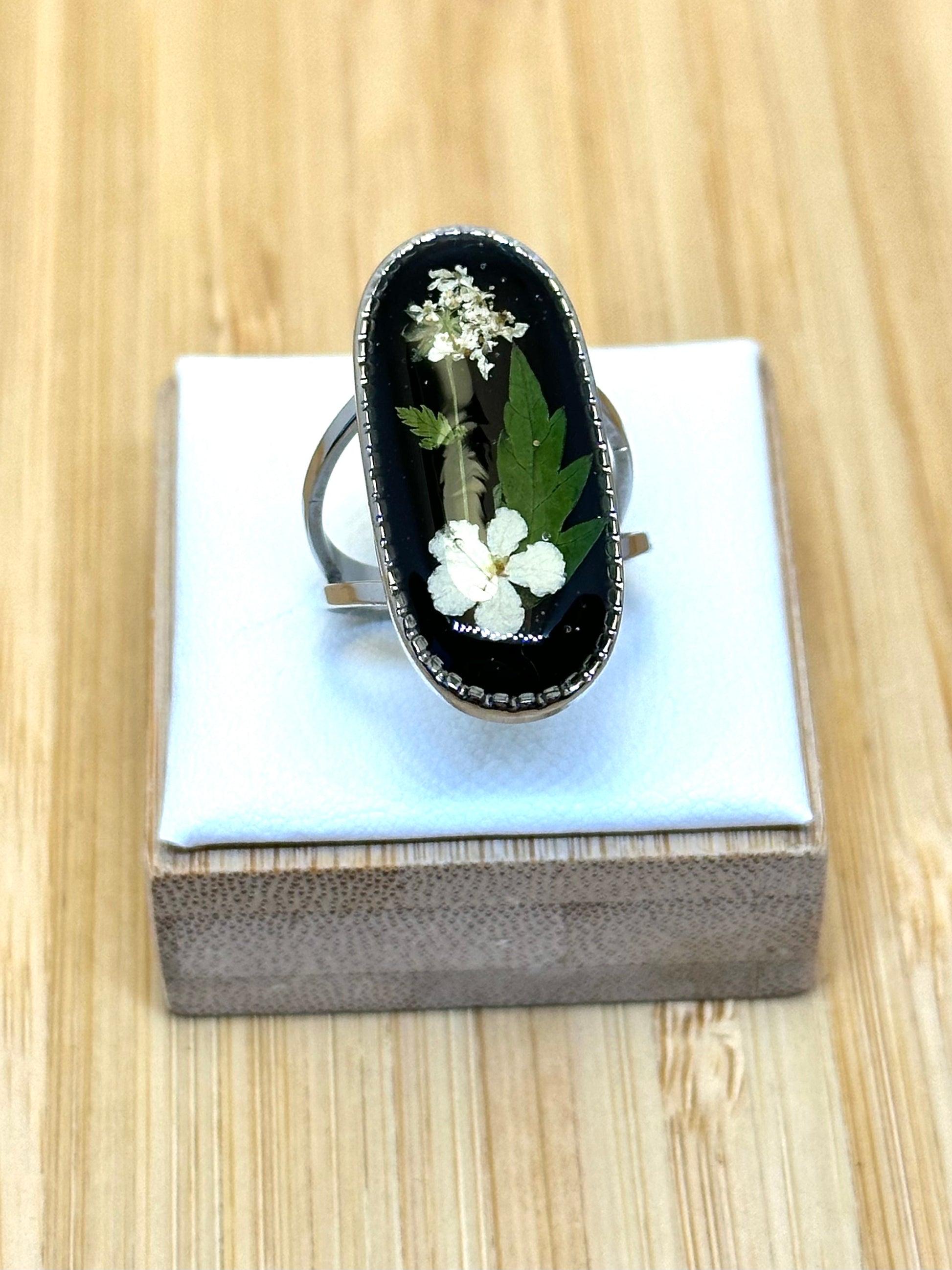 Justerbar ring i silverfärgat rostfritt stål med en långsträckt oval form. Inuti, mot en djupsvart bakgrund, finns en liten vitklöverblomma åtföljd av volangstjälkar och gröna blad.